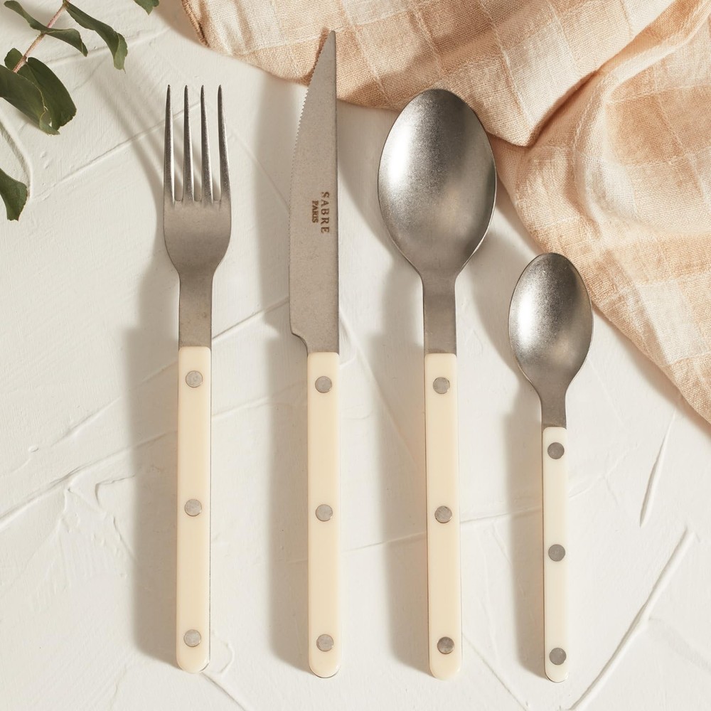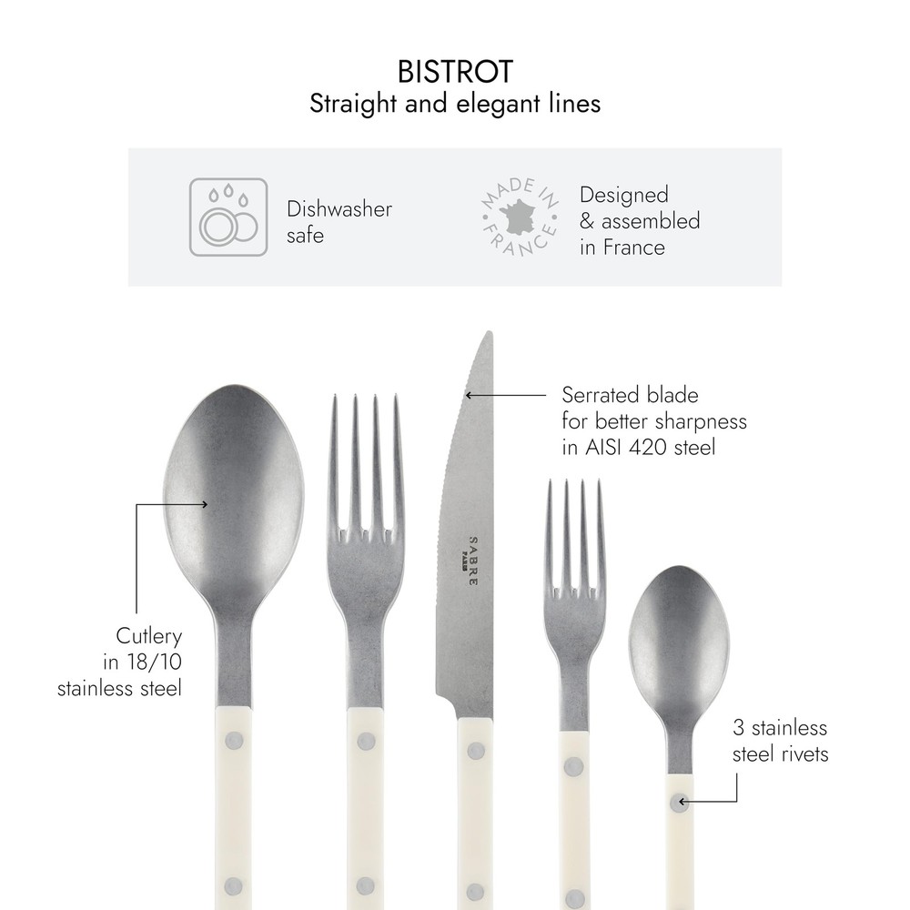 With the Bistrot collection, we drew inspiration from the places we adore: our restaurants, terraces, and cafes. When designing these cutlery pieces, our aim was to stay true to tradition while embracing modernity. The lines are simple, the rivets are present, and an array of colors and materials are incorporated. From vibrant red to soothing blue, with materials featuring horn or scale-like effects. Available in both glossy and vintage finishes, we are confident you will appreciate this collection, as we intended it to be both authentic and contemporary. The Sabre 5-Piece Set is your fundamental ensemble for assembling your tableware. It consists of a soup spoon, a table fork, a table , a teaspoon, and a dessert fork. 5-PIECE CUTLERY SET: Composed of a 9.4" , an 8.6" fork, an 8.6" soup spoon, a small 6.2" dessert fork, and a small 6.2" teaspoon, this silverware set is the essential combination for your daily meals. STAINLESS STEEL FLATWARE: This set combines a beautiful play of premium materials with cutlery crafted from 18/10 stainless steel, boasting a vintage finish, and handles made of nylon. The blade is made of AISI 420 steel. DISHWASHER-SAFE AND MORE: Enjoy a tableware set that is incredibly easy to maintain as it is dishwasher-safe and from Bisphenol A, per the law 2012-1442. It will serve you well for many years! BISTROT COLLECTION: Inspired by the places we cherish: restaurants, terraces, and cafes. With its sleek design, 3 stainless steel rivets, and a wide array of colors and materials, this collection exudes both authenticity and modernity. FRENCH SAVOIR-FAIRE: is a French brand of handcrafted tableware, showcasing the artistry of French craftsmanship. Our cutlery is proudly made in France, crafted at our workshop in the Parisian region.