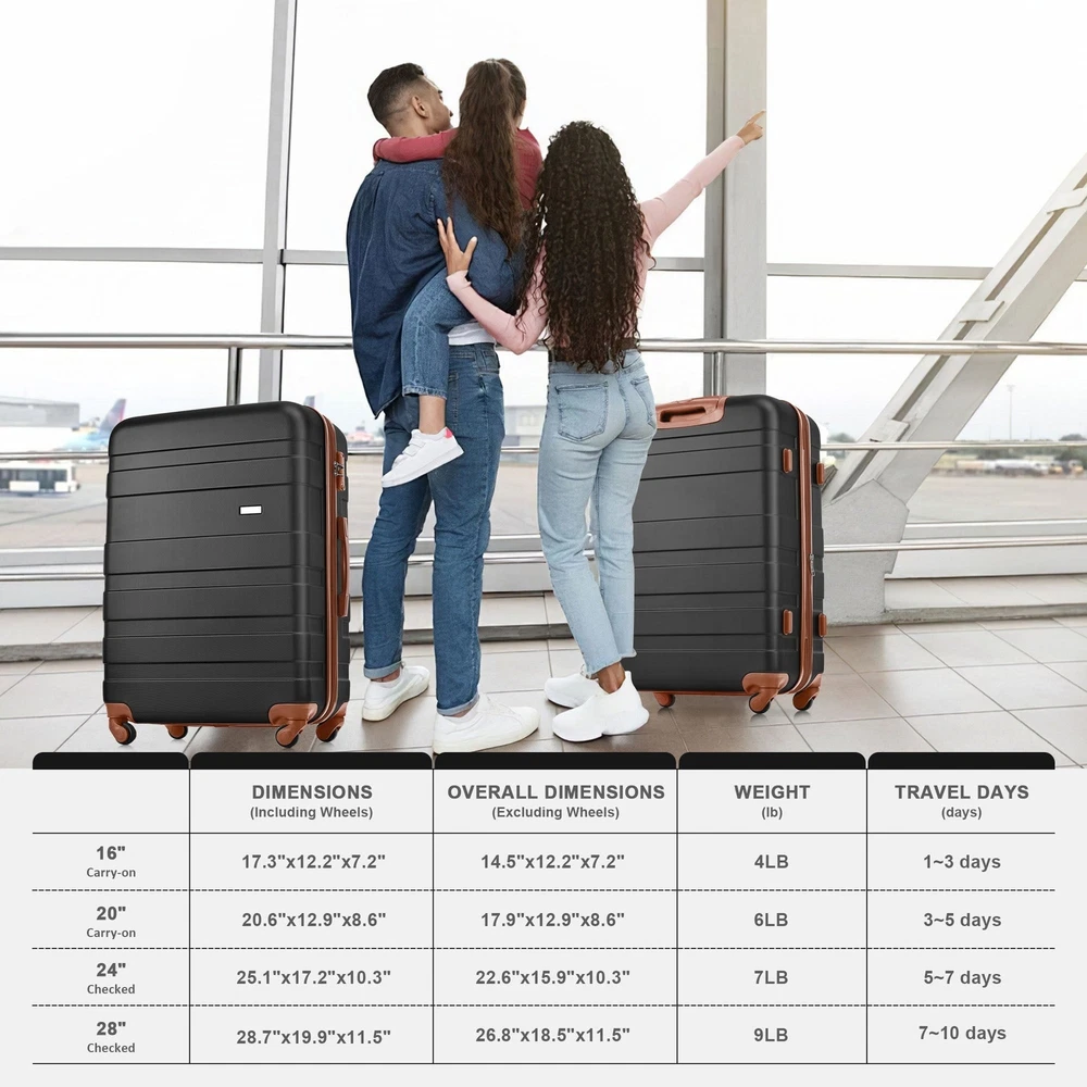 5-Piece Luggage Set with Expandable Travel Bag - Includes 16", 20", Specifications Place of Origin #originPlace# Main Color Black+Brown Main Material ABS Dangerous Goods #dangerFlag# Dimensions & Weights Assembled Length (in.) 29.00 Assembled Width (in.) 19.60 Assembled Height (in.) 12.00 Weight (lbs) 29.00 Product Features Versatile Luggage Set: Includes four sizes (16", 20", 24", 28") of durable hard-shell suitcases and one expandable travel bag, catering to all your travel needs from weekend getaways to extended vacations. Smooth Maneuverability: Each suitcase features 360° spinner wheels for effortless multi-directional movement and easy navigation through crowded airports or hotel lobbies. Adjustable Telescopic Handles: The telescopic handles can be adjusted to multiple heights for comfortable handling and ease of use, accommodating travelers of different heights Expandable and Protective Travel Bag: The included travel bag is expandable to provide extra packing space and features a waterproof inner compartment to keep your belongings safe and dry. Organized Interior: Each suitcase has a well-organized interior with multiple compartments, to keep your clothes and accessories neatly arranged during your journey. Description Specifications Place of Origin #originPlace# Main Color Black+Brown Main Material ABS Dangerous Goods #dangerFlag# Dimensions & Weights Assembled Length (in.) 29.00 Assembled Width (in.) 19.60 Assembled Height (in.) 12.00 Weight (lbs) 29.00 Product Features Versatile Luggage Set: Includes four sizes (16", 20", 24", 28") of durable hard-shell suitcases and one expandable travel bag, catering to all your travel needs from weekend getaways to extended vacations. Smooth Maneuverability: Each suitcase features 360° spinner wheels for effortless multi-directional movement and easy navigation through crowded airports or hotel lobbies. Adjustable Telescopic Handles: The telescopic handles can be adjusted to multiple heights for comfortable handling and ease of use, accommodating travelers of different heights Expandable and Protective Travel Bag: The included travel bag is expandable to provide extra packing space and features a waterproof inner compartment to keep your belongings safe and dry. Organized Interior: Each suitcase has a well-organized interior with multiple compartments, to keep your clothes and accessories neatly arranged during your journey. Description eBay integration by