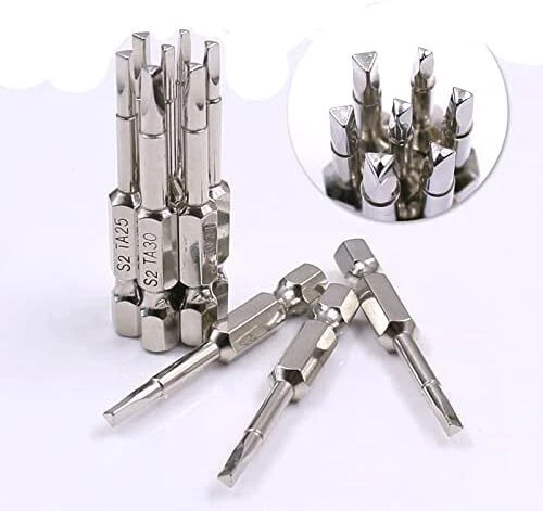 About this item Triangle Head Size: Δ1.8, α2.0, α2.3, α2.7, α3.0; Shaft: 6.35mm / 1/4"; Total Length: 50mm Triangle screwdriver bit set, made of alloy S2 steel, durable and very wear-resistant Magnetic screwdriver bits, easy to suck the screws during use, no damage to the screw and screwdriver head Suitable for installation in pneumatic screwdriver, electric screwdriver, cordless drill, using the wind charge Ideal screwdriver accessory tool for repairing precision instruments, furniture assembly, household appliances Size Description: Triangle Head Sizes - Δ1.8 to α3.0; Shaft Size - 6.35mm / 1/4"; Total Length - 50mm
