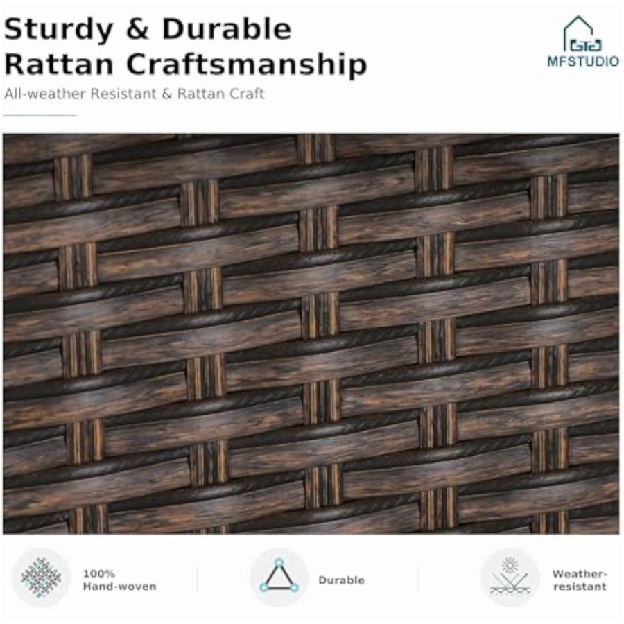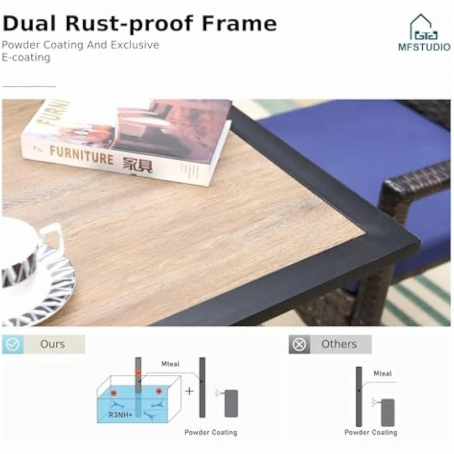 This patio dining set is a fantastic addition to any outdoor space! The heavy-duty black steel frame is both elegant and durable, with an e-coating that resists weather damage. The wood-like table is easy to clean and has a handy umbrella hole. The ergonomic rattan chairs are comfortable, fade-resistant, and feature a sturdy steel frame. Perfect for relaxing or entertaining guests—great value for the price!