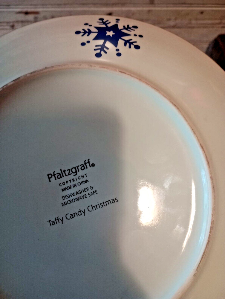 Country/Region of Manufacture: China Seller Notes: “Adorable Christmas plates............. gently used” Occasion: Christmas Set Includes: 3 with blue ornament and 2 with red ornament Brand: Pfaltzgraff Plate Diameter: 9 1/8 inch Material: Ceramic Number of Items in Set: Five-Piece Features: Dishwasher Safe, Microwave Safe Theme: Ornaments, Snowflakes Type: Dessert Plate Shape: Round Pattern: Taffy Candy Christmas Color: Multicolor