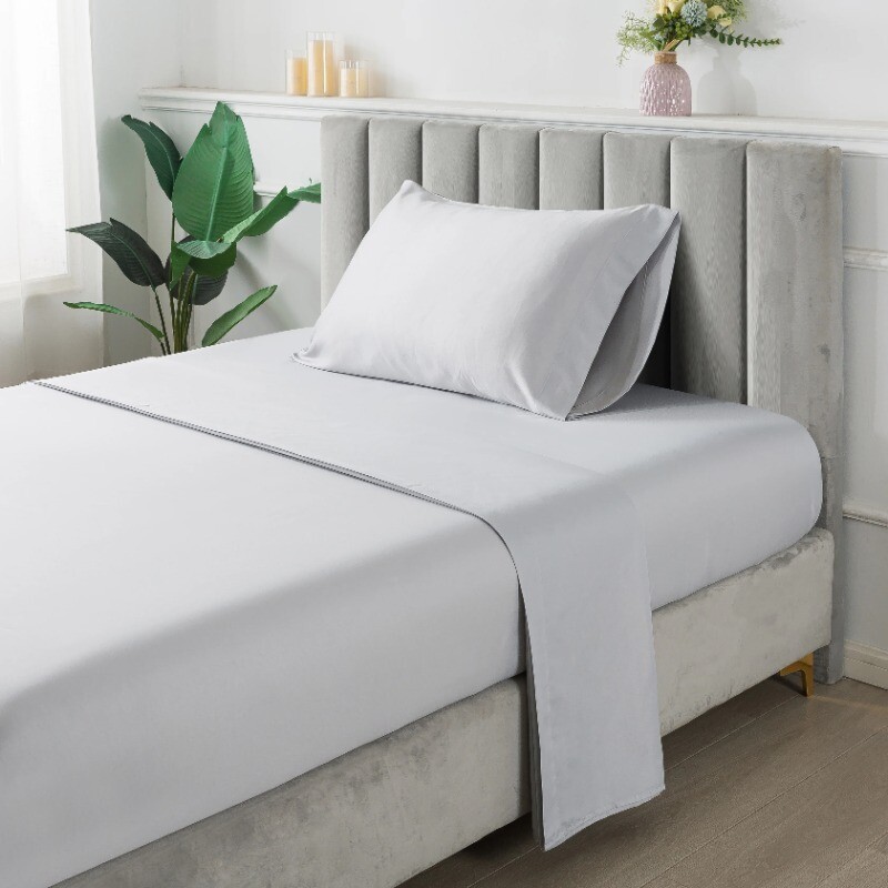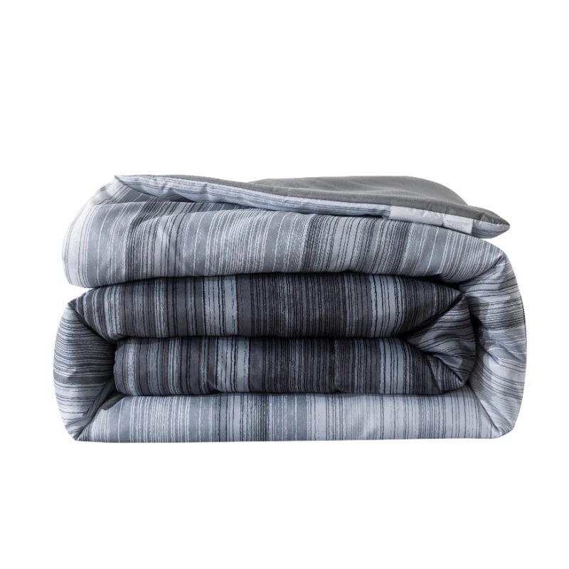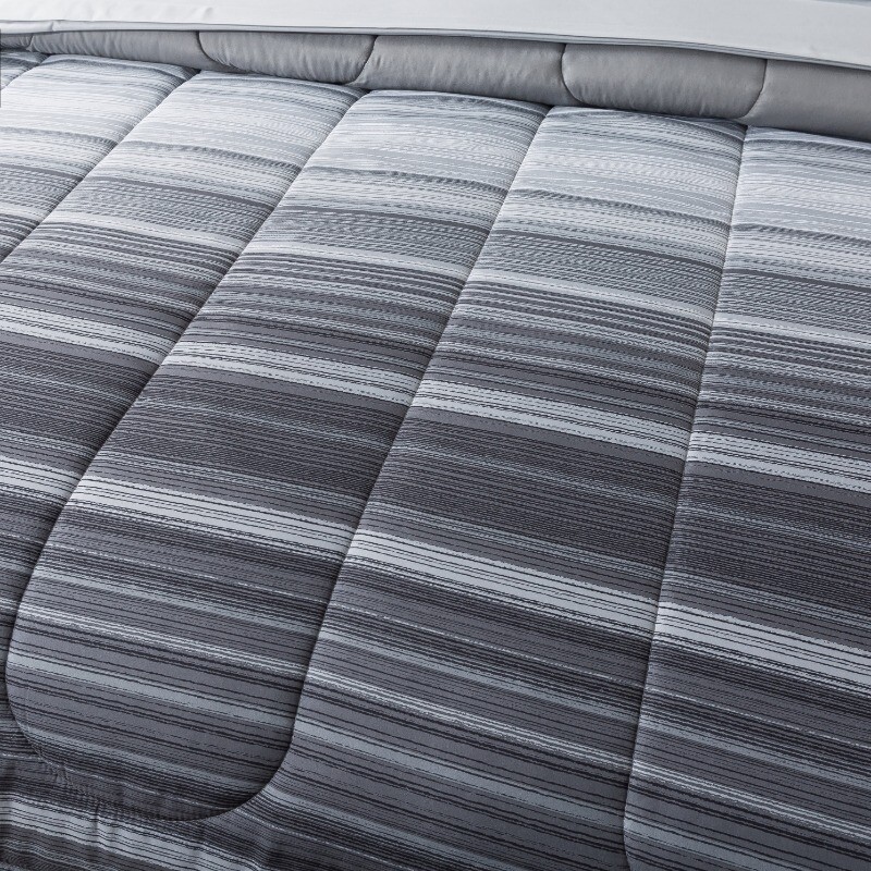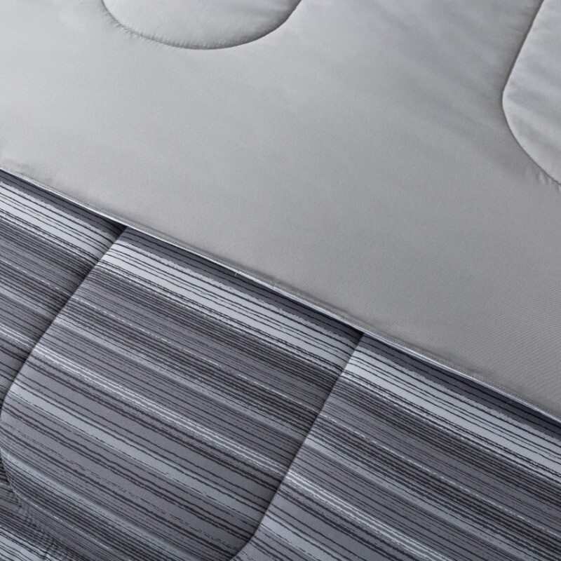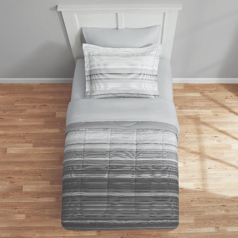 Classic meets comfortable with the Grey Ombre Stripe Bed-in-a-Bag. This complete bedding set has everything you need to make your bed cozy and colorful from top to bottom. Set includes a comforter, matching pillow shams (twin set includes 1 sham) and a coordinating solid sheet set. The reversible comforter allows you to change your look anytime you want, from a trendy ombre stripe pattern on one side to a coordinating solid on the other. Sewn-through channel quilting keeps the lofty comforter fill evenly distributed, ensuring the perfect fluff to keep you warm during any season. The bedding set comes with a cloth storage bag for effortless storage when not in use. All pieces in this Bed-in-a-Bag Comforter set are made from an incredibly soft polyester, and are machine washable, making them easy to care for. This unisex set is suitable for adults, tweens, teens, and seniors. Bed in a Bag Grey Ombre Set includes a comforter, matching pillow shams (twin set includes 1 sham) and a coordinating solid sheet set Made from brushed microfiber polyester for a superior hand feel Trendy ombre stripe pattern on one side and reversible to a coordinating solid on the other Easy care, Machine Washable Unisex, Suitable for adults, tweens, teens, and seniors Twin/Twin XL Size Includes: Comforter 66inx90in, 1 standard sham 20inx26in, 1 flat sheet 66inx96in, 1 fitted sheet 39inx80in, fits mattresses up to 12in deep, 1 pillowcase 20inx30in Full Size Includes: Comforter 76inx90in, 2 standard shams 20inx26in, 1 flat sheet 81inx96in, 1 fitted sheet 54inx75in, fits mattresses up to 12in deep, 2 pillowcases 20inx30in Queen Size Includes: Comforter 88inx92in, 2 standard shams 20inx26in, 1 flat sheet 90inx102in, 1 fitted sheet 60inx80in, fits mattresses up to 12in deep, 2 pillowcases 20inx30in King Size Includes: Comforter 104inx92in, 2 king shams 20inx36in, 1 flat sheet 108inx102in, 1 fitted sheet 78inx80in, fits mattresses up to 12in deep, 2 king pillowcases 20inx40in