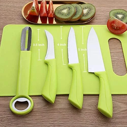☑ Best Value Combo--- 【Package Include: 3 knives, 1 peeler and 1 cutting board】 ┉┉┉┉┉★┉┉┉┉┉★┉┉┉┉┉★┉┉┉┉┉★┉┉┉┉★┉┉┉┉┉★┉┉┉┉┉┉ Features: ① ☑ Various Knife Set--- Sharp stainless steel blades, solid ergonomic handles for a safe and secure grip ✔5 inch Utility Knife Ideal for prepping and straight cuts of fruits, vegetables and boneless fish and meats ✔4 inch serrated knife Multi-purpose Serrated Knife, perfect for slicing cake, crusty bread, bagels, pastries, it is also great for cutting slippery and wax skinned fruit like pineapples, lemons, tomatoes, and more ✔3.5 inch paring knife Bird’s beak shape paring knife, curved blade design makes paring small round fruit and vegetable easier ② ☑ Safe Material & Perfect Size Cutting Board --- BPA Free safe material, perfect small size measuring at 11.5x7.5 inches, ultra lightweight, non slip surface, both sides are usable, easy grip handle design, convenient and easy to hand and storage ③ ☑ Extra Bonus--- Multi function peeler with bottle opener and easily remove eyes from potatoes, in addition, it is also a fish scale remover ④☑ So Many Use---- Perfect knife set for daily use on fruit and vegetable to make salad, snack, a quick breakfast, processing food for baby, lightweight and compact size make it convenient to take out for picnic, barbecue Caution▲ Knives are very sharp, please keep out of reach of children ✔ Great Value Combo → Package Include: 3 knives, 1 peeler and 1 cutting board ✔ Various Knife Set → Sharp stainless steel blades, solid ergonomic handles for a safe and secure grip, 5 inch Utility Knife is ideal for prepping and straight cuts of fruits, vegetables and boneless fish and meats, Multi-purpose 4 inch Serrated Knife, perfect for slicing cake, crusty bread, bagels, pastries, it is also great for cutting slippery and wax skinned fruit like pineapples, lemons, tomatoes, and more ✔ Safe Material & Perfect Size Cutting Board → BPA Free safe material, perfect small size measuring at 11.5x7.5 inches, ultra lightweight, non slip surface, both sides are usable, easy grip handle design, convenient and easy to hand and storage ✔Extra Bonus → Multi function peeler with bottle opener and easily remove eyes from potatoes, in addition, it is also a fish scale remover ✔So Many Use → Perfect knife set for daily use on fruit and vegetable to make salad, snack, a quick breakfast, processing food for baby, lightweight and compact size make it convenient to take out for picnic, barbecue