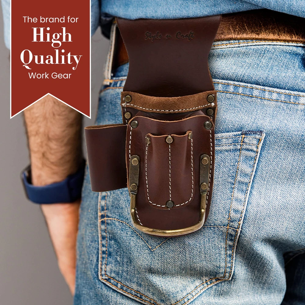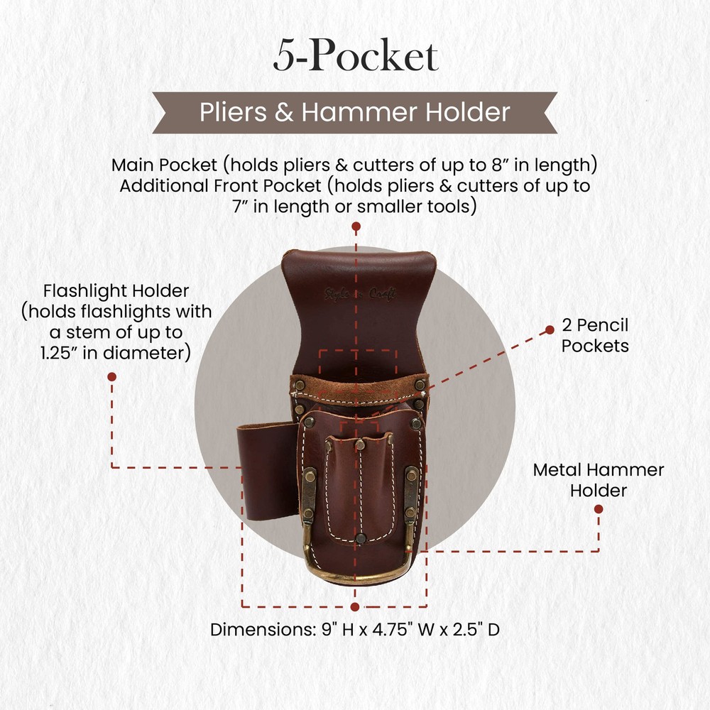 Are you looking for a comfortable yet spacious tool holder? presents an innovative 5-pocket pliers and hammer holder that is durable, extremely versatile, and ideal for everyday use. It is made with heavy full-grain leather reinforced with heavy-duty nylon thread stitching. Our dark tan color tool pouch has multiple pockets for your various needs. You can easily keep your pliers, cutters, pencils, flashlight, and several other tools in different-sized pockets. Also, it has a front outside metal hammer holder to hold your hammer. It is equipped with a tunnel loop and a clip-on attachment, allowing you to attach and detach this tool pouch easily. This leather tool pouch has rivets with caps for safety, and all its hardware comes in an antique finish. Our hammer holder measures 9" x 4.75" x 2.5" and is a perfect addition to your work equipment. Ideal Belt Pouch: presents an innovative 5-pocket pliers and hammer holder that will make your work easier and more efficient. Our tool pouch is durable, extremely versatile, and ideal for everyday use Rugged Construction: Built to last for years, our leather tool pouch is made with superior quality and heavy full-grain leather in dark tan color. It is reinforced with heavy-duty nylon thread stitching, ensuring long-lasting performance and durability Multi Tool Holder: Our leather tool pouch is very comfortable, lightweight, and spacious. With 6 different-sized pockets, you can easily your pliers, cutters, pencil, flashlight, metal hammer, and several other tools in this tool pouch Tool Belt Pouches: No matter who you are, a carpenter, electrician, framer, or construction worker, this leather pouch is super beneficial. Just attach it to your belt and keep all your tools together in one place Tool Pouch with Belt Clip: With the help of a tunnel loop and clip-on attachment, you can easily attach our tool pouch to a 3" wide belt. This pliers and hammer holder measures 9" x 4.75" x 2.5" and is a perfect addition to your work equipment