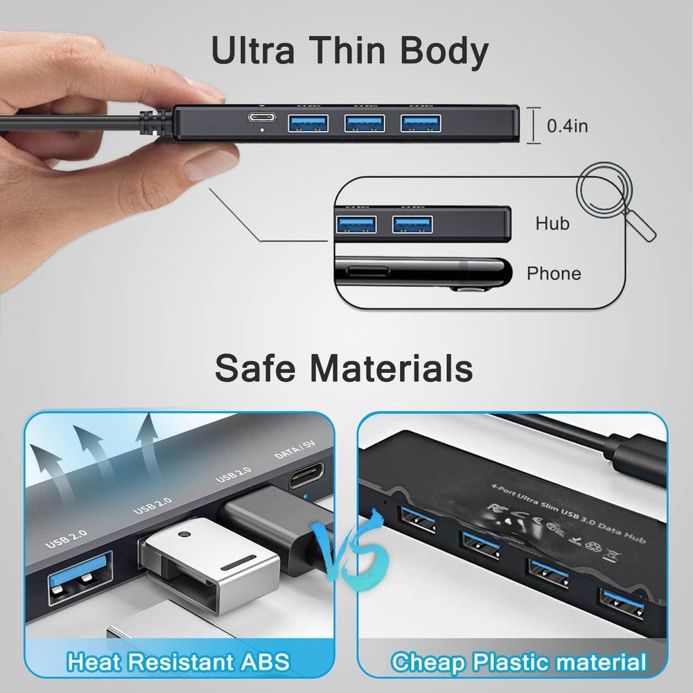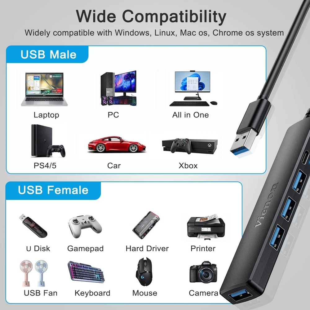 5-Port Powred USB 3.0 Hub, Extender Splitter with 5V USB-C Black Description: Features: 【Multiport USB 3.0 Hub】: This USB 3.0 Hub extends your device with 4 additional USB A ports, backwards compatible with USB 2.0 / 1.1. ideal for connecting USB peripherals such as flash drive, mouse, keyboard, printer. No need to install drivers, plug and play. It’s very portable, suitable for business travel. 【with USB-C Power/Data Port】: with 5V/3A USB-C Power port. High-speed transfer of large-capacity data easily leads to insufficient power supply to the hub and slows down the transfer speed. Use the USB-C charging port to ensure transfer stability. It also support data transmission. 【5Gbps Data Transfer】: with 1 USB 3.0 and 3 USB 2.0 ports, Supports up to 5 Gbps data transfer. you can transfer movies, photos, and files in seconds, meet your needs for efficient daily work. 【Safer Technical Design】: This USB Extender for Laptop Each port has built-in overcurrent protection. This will protect the connected devices from damage caused by short circuits. Stable ABS outer material has the effect of rapid heat dissipation, preventing overheating and scalding during operation. 【Wide Compatibility】: Widely Compatible with USB A port Laptop/PC/Desktop XPS, PS4, Xbos and More devices, and Works on Windows, ChromeOS, Linux. Perfectly solve the problem of insufficient USB interfaces on your device, greatly improving daily work efficiency. SHIPPING: We are always working hard to ensure your package arrives as soon as possible. Please understand that some factors like weather, high postal traffic, and the performance of shipping companies are outside of our control. We offer free shipping to the lower 48 states and ship within 3 business days of payment, usually sooner. We do not accept P.O. Boxes. Please provide a physical address. For shipping outside of the continental USA, we only use eBay's Global Shipping Program. The item is shipped to KY and then sent to the rest of the world. International customers are responsible for all duties and taxes. Continue to check out in order to calculate costs for shipping the item to your country. Messages regarding eBay's Global Shipping Program MUST be directed at eBay EXCLUSIVELY. PAYMENT: We accept payment by PayPal only (Can accept all kind of credit cards). Please pay as soon as possible after winning an auction, as that will allow us to post your item to you sooner. Payment must be received within 3 business days of auction closing. Before buying, please make sure your PayPal and eBay address is correct. If not, please correct it before payment. We have confidence in our products, but if you are not fully satisfied please contact us within 30 days of purchase and you will get full refund of your money. Return the product in the same condition you received it. Please note - return shipping will be paid by the buyer.
