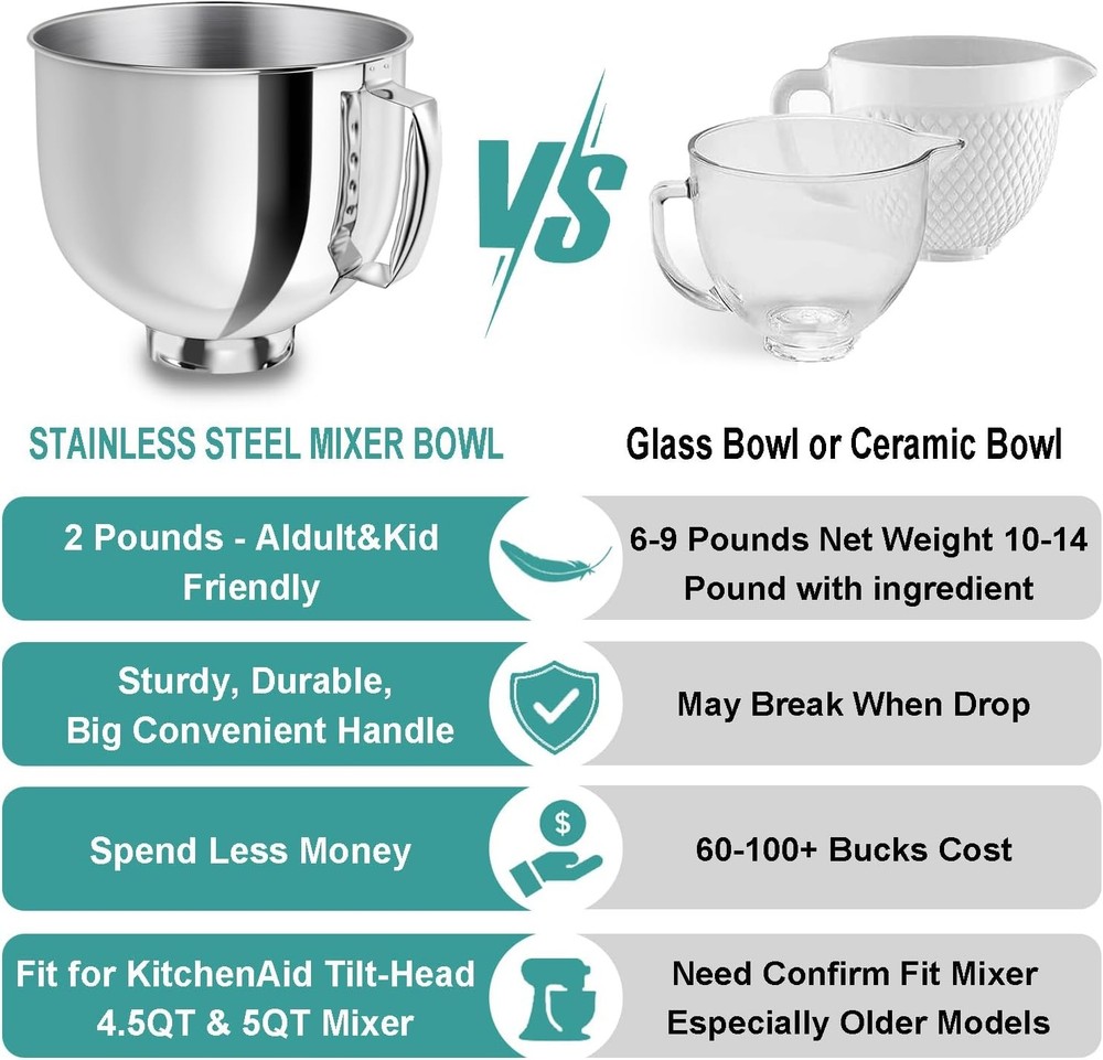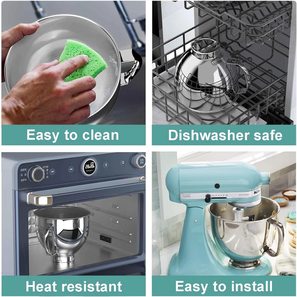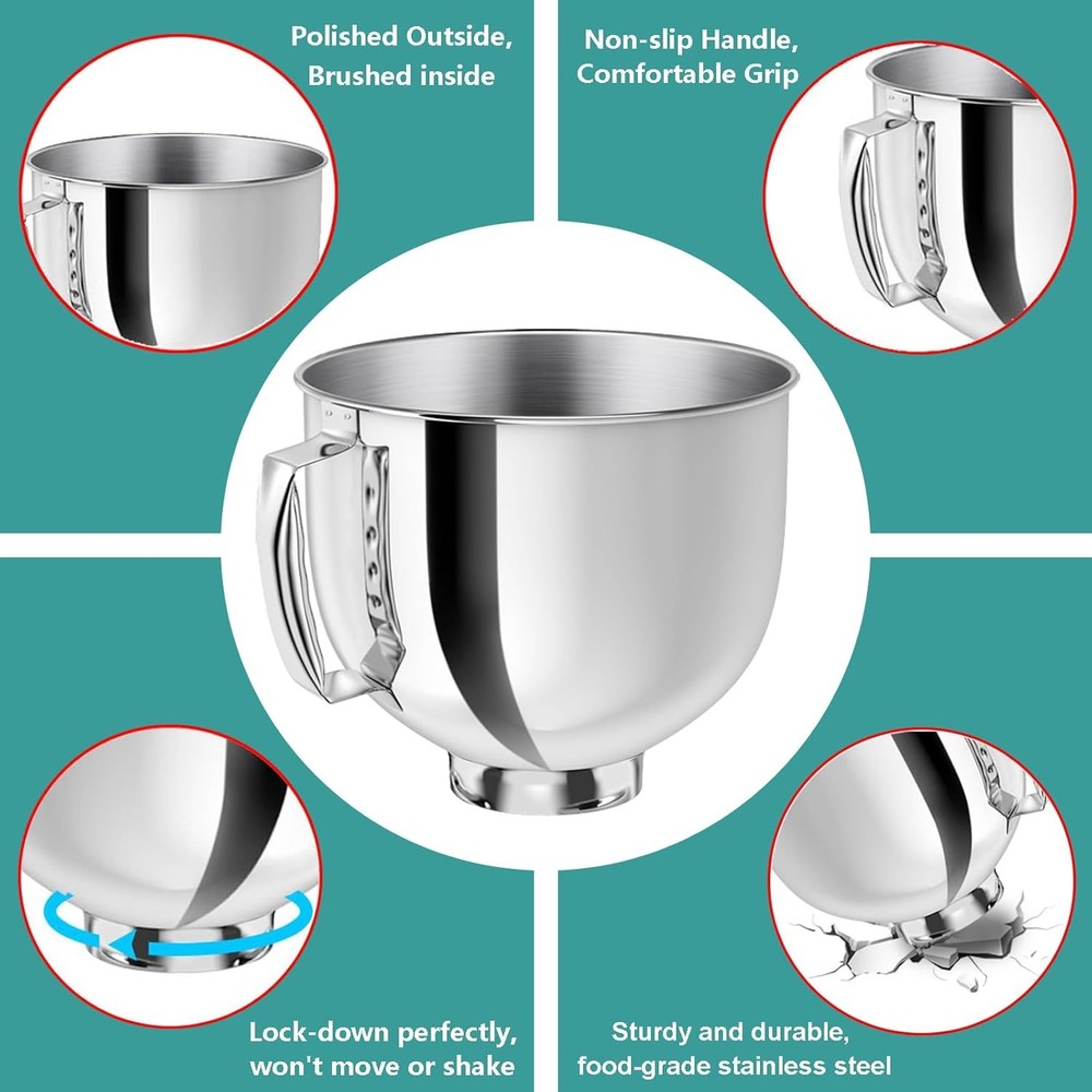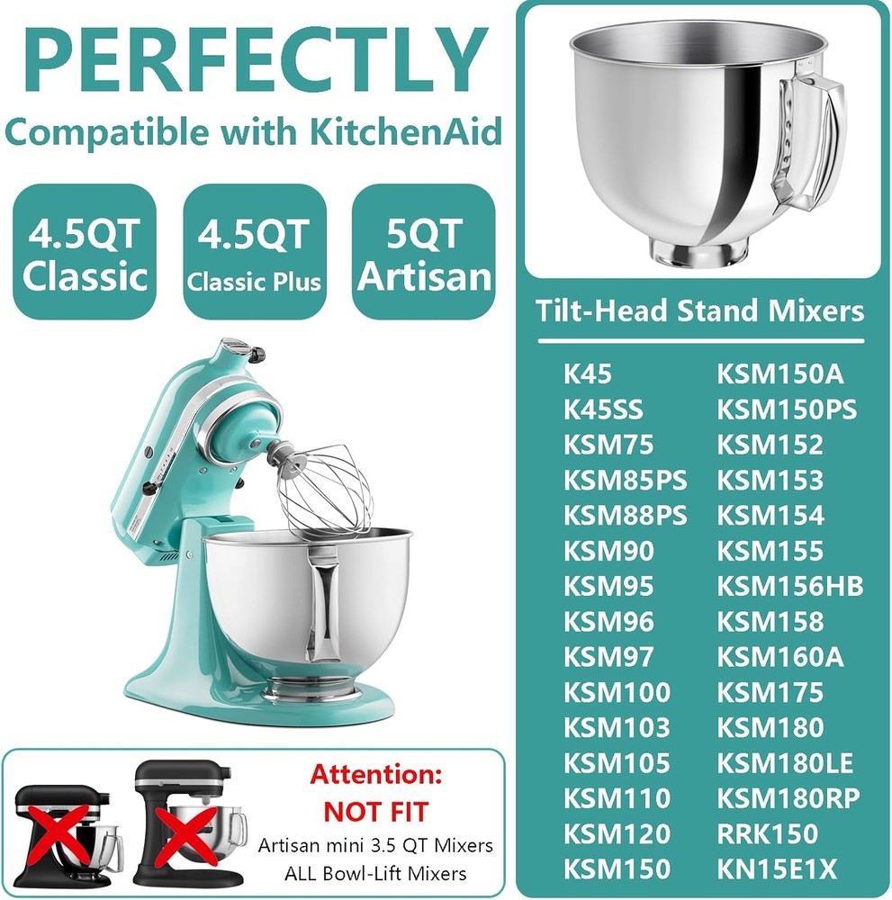 🥣【Applicable Models】 mixing bowl for kitchenaid mixer are not only compatible with popular models such as K45,K45SS,KSM150PS,KSM150PSBK, but also with KSM75, KSM90, KSM95, KSM100, KSM103, KSM110 etc. and for most from 4.5QT to 5QT Artisan & Classic(Plus) Series Tilt-Head Mixers.(Not Fit Bowl Lift and Artisan Mini Series!) 🥣【Durable and Functional Design】 Crafted from premium food-grade 304 stainless steel, this 5QT stainless steel replacement bowl for kitchenaid withstands daily heavy-duty use. A durable mixer bowl designed for tilt-head stand mixers, perfect as an essential mixer accessory. 🥣【Ample Mixing Capacity】 With a 5-quart capacity, this large stainless steel mixing bowl handles big batches of dough and batter without spills. Ideal for both beginners and professionals seeking high-capacity mixing bowls for kitchenaid stand mixers. 🥣【Comfortable Handle for Easy Use】 Designed with a comfortable and ergonomic handle design, this bowl for kitchenaid tilt-head mixers is easy to attach and carry, providing a seamless experience while using your kitchenaid mixer. Say goodbye to struggles with cumbersome bowls and enjoy effortless mixing! 🥣【Scratch-Resistant & Easy to Clean】 The polished stainless steel finish not only enhances the aesthetic appeal but also provides a scratch-resistant surface, ensuring that your kitchenaid accessories and attachments remain in pristine condition. Cleaning is a breeze, allowing you more time to focus on baking. 🥣【Perfect Match for KitchenAid Tilt-Head Mixers】 Specifically designed for KitchenAid Tilt-Head Stand Mixers, this 5QT mixing bowl is the perfect addition to your collection of kitchenaid mixer accessories, helping you create delicious treats effortlessly and elevating your baking experience.