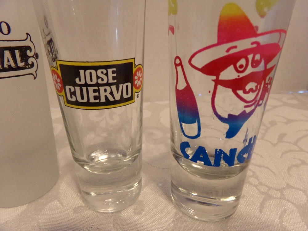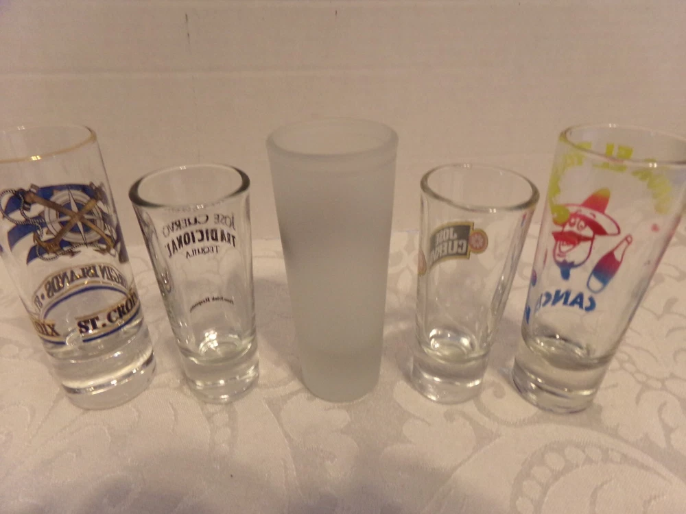 UP FOR AUCTION ARE 5~SHOT GLASSES ~4~JOSE CUERVO TEQUILA TRADICIONAL & VIRGIN ISLANDS, ST. CROIX. THEY ARE 4 1/2" TALL....IN GREAT SHAPE... P LEASE CHECK OUT THE PICTURES...... I DO HAVE MORE THAT I WILL BE LISTING....THE BIG ONES & SMALL ONES TOO..... THANKS FOR LOOKING ! ! ! ! ! I COMBINE SHIPPING ! ! ! ! ! ! JUST REQUEST THE TOTAL WHEN YOU ARE ALL DONE SHOPPING! ! ! ! ! ! ! ! Check out my other items !