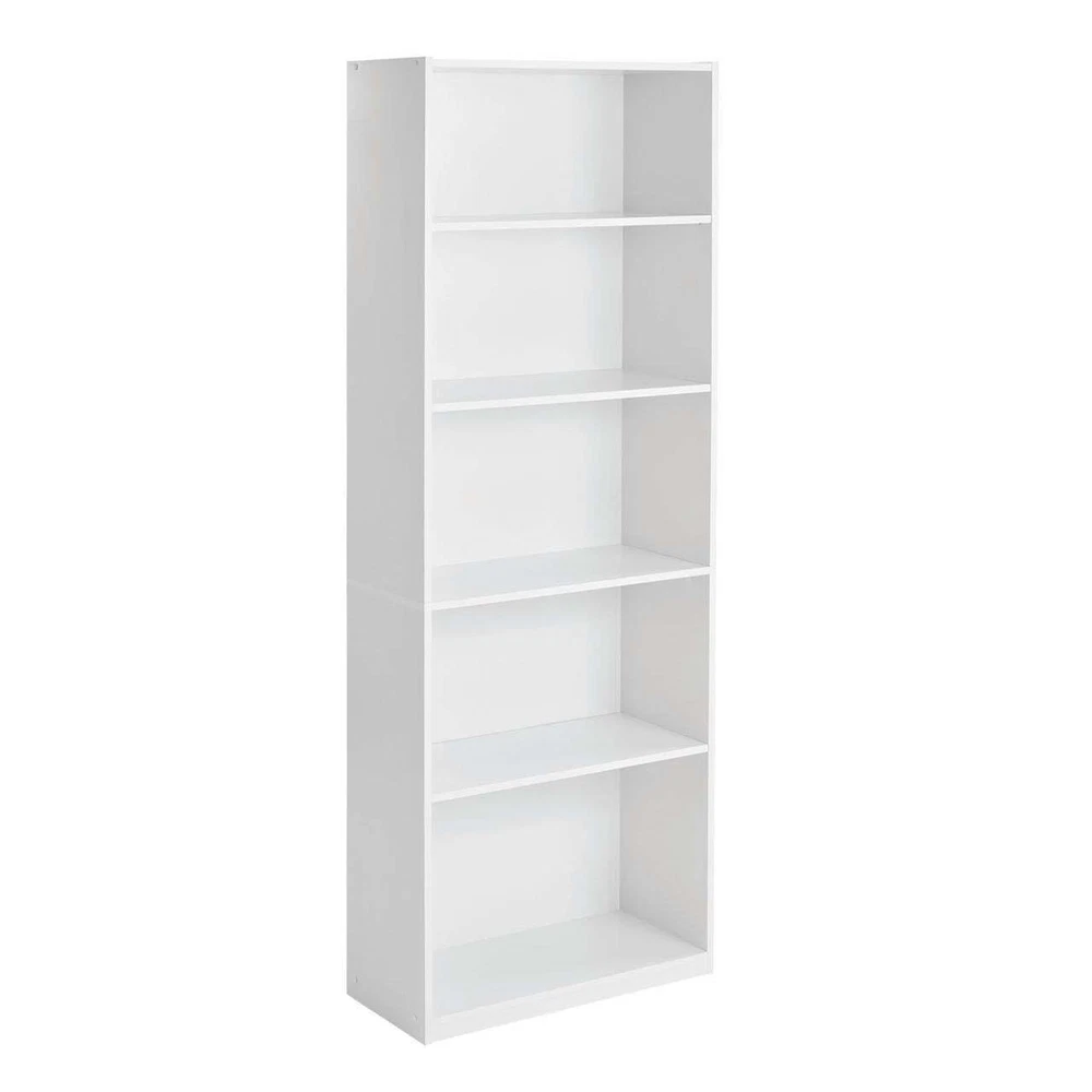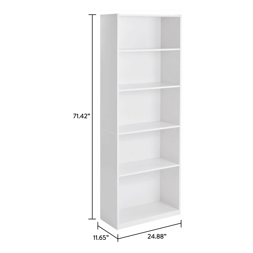 Add 5-Shelf Bookcase with Adjustable Shelves to almost any room for a functional and stylish look. This sturdy storage unit has a closed-back design with 2 fixed shelves that hold up to 50 lbs each, and 3 adjustable shelves that support up to 35 lbs each. This attractive bookcase provides a useful storage option for any office, living room, family room, den and more. For safety, this bookcases secures to the wall with an included wall strap kit. The 5-Shelf Bookcase stands 71" tall making it perfect for large rooms where smart, efficient storage is needed. The adjustable shelves accommodate everything from paperbacks to large folios to deliver a functional bookcase ideal for a variety of libraries and collections. On Nov 25, 2024 at 00:12:47 PST, seller added the following information: