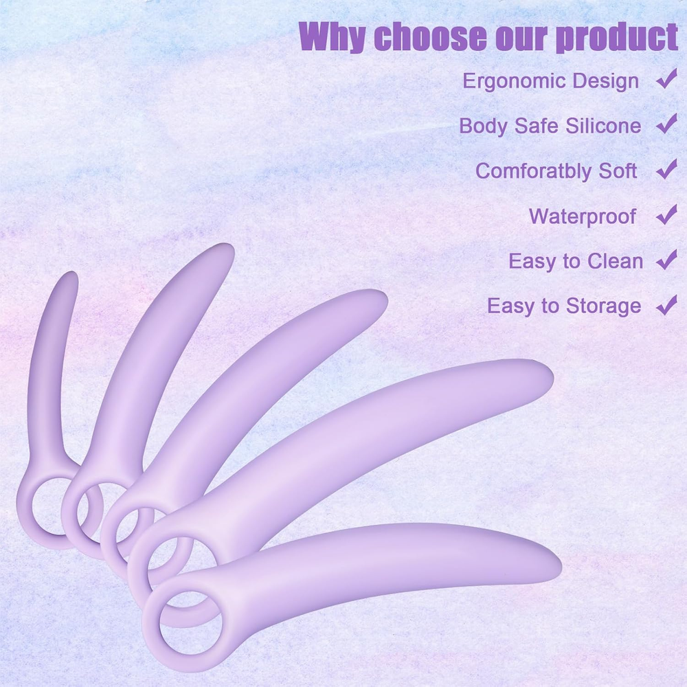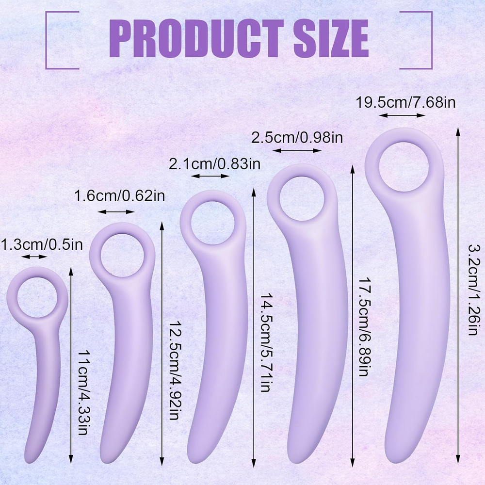 Variety of Sizes: our pelvic floor dilators come in 5 different sizes, 7.68 x 1.26 inches, 6.89 x 0.98 inches, 5.71 x 0.83 inches, 4.92 x 0.62 inches and 4.33 x 0.51 inches, to cater to most users, ensuring a comfortable fit and effective workout routine Scientific Design: our dilators for pelvic floor feature a curved, tapered and silky smooth design to ensure maximum comfort and ease during use; This feature helps in relieving muscle tension, which in turn result in a natural physical therapy for fatigue relief Quality Material: made with quality silicone, our pelvic floor trainer is reliable and safe for use, long lasting and effective for extended use Easy to Use: our pelvic floor muscle trainer is designed to be easy to use and to provide maximum convenience for the user; They are washable and can be easily stored, allowing for seamless integration into everyday life Multiple Uses: our silicone dilator set for women is ideal for people who want to exercise their pelvic floor muscles at home safely and effectively, suitable for people with a range of needs, from body relaxing to general fitness and well being Features: Muscle relaxation: The dilator set for women helps improve skin elasticity and relieve muscle tension. It is a common physical therapy for fatigue relief, and can be a nice way to take proactive control of your health and well being. Improved flexibility: Exercising the pelvic floor muscles is a nice way to improve flexibility and reduce the risk of injury. Our anal trainer for women provides an effective way to train these muscles, leading to improved health outcomes and an overall sense of well being. Specifications: Material: silicone Color: purple Size: 7.68 x 1.26 inches 6.89 x 0.98 inches 5.71 x 0.83 inches 4.92 x 0.62 inches 4.33 x 0.51 inches Package includes: 5 x Pelvic floor dilators Notes: Manual measurement, please allow slight errors on size. The color may exist a slight difference due to different screen displays.