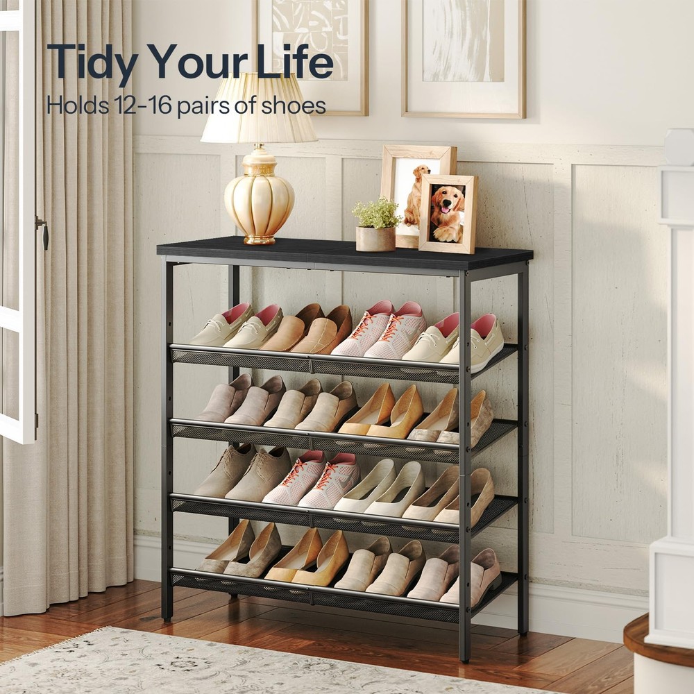 Organized Shoe Storage: Bid farewell to the embarrassment of scattered shoes! This 5-tier shoe rack restores order to your home with each shelf holding 4-5 pairs of shoes, ensuring a tidy display of your footwear and banishing chaos from corners Collision of Black : Matte black frame is smooth and exquisite while the black finish is noble and delicate, making this shoe organizer a perfect match to your home decorations and a charming spot for your family and friends Flexible Tilting and Leveling: Besides a spacious top, this shoe rack has metal mesh shelves to be tilted or leveled as per your preference, catering to diverse storage needs. How to heels or tall boots? Removable design helps you Solid, Stable, Safe: This shoe rack is constructed of premium particleboard and metal mesh shelves. The top loads up to 44 lb and each mesh bears up to 22 lb, so you can enjoy safe use of this shoe rack. Of course you can expect long serviceability because the frame is hard to bent and age No Hassle Assembly: We pay special attention to the customer’s product experience, including assembly experience. So we specially improved the assemble method and procedures of the product