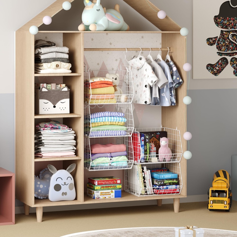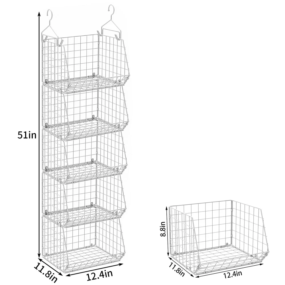 Maximize closet space with Foldable 5 Tier Closet Hanging Organizer, which will add more shelving in your closet for folded clothes, pants, purses, shoes, hats or other accessories. Featuring 4 sturdy metal hooks, this closet hanging baskets is easy to hang on the closet bar. Moreover, each basket can be used alone. You can hang them together on the wall or hang them separately. Hang on the kitchen wall to store spice bottles, on the bathroom wall to store toiletries or just place the basket on the flat surface. DIY the combination and using method! Wardrobe Hanging Organizer Come with 4 wide open baskets, maximize your closet space and a large capacity for storage clothes, socks, pants, dolls, and etc. Suitable for bedroom, closets, laundry room, play room, college dormitory with rods. Wide Open Design Rectangular shape with a low front and high back to keep your items neatly tucked away and easily accessible. Three Using Methods One, hang the baskets on the closet rod using large metal hooks. Second, wall mounted design, easily mount to the wall with included hardware. Third, use it in flat to store items anywhere like dorms, bathrooms, bedrooms, closets, office under the bed, in the garage or in the pantry. Foldable Design When not use it, just fold down for sleek storage on a shelf or desk. Space saving. 2 Sturdy Large Hooks&5 S Small Hooks Come with 4 sturdy hanging hooks, make it easy to hang on your closet rod.Also it arrives with 5 S hooks to hang many items, like umbrella, bags, wallet, key chain etc. Fit for Any Room 5 Tier Metal Wire Hanging Basket is a great storage solution for any room in the home. Organize lotions in your bathroom, containers in your pantry, office supplies, mails in your office, fruit&vegetable&spices in your kitchen. Cabinet&Hanging Storage: Come with 4 sturdy large hanging hooks, you can use them to hang the basket on the closet rod or garment rod. Optional wall mounted design, easily mount to the wall with included hardware. Moreover, you can use it in flat on a surface, to store items anywhere like dorms, bathrooms, bedrooms, closets, under the bed, in the garage or in the pantry. Hooks fit in standard closet rod/bar up to 1.65 inch diameter. 5 in 1 or Use Alone: closet hanging organizer is the layered design, used alone or stacked according to your own need and idea. And you can screw all the five baskets together and hang them as a unit on the closet rod to store clothes, hats, sweaters, jeans, shirts, shoes, purses and other accessories. Also, you can hang 3 baskets on the wall, and place 2 on the shelf. You can DIY the using methods. Foldable Hanging Shelves with 5 S Hooks: Foldable design, when not use it, just fold down for sleek storage on a shelf or desk. Come with 5 S hooks, you can use hooks to hang key chains, wallets etc. according to your needs. Perfect Storage Organization: 5 tier wide open wire basket allows you to easily view, put in and take off more easily. metal basket hanging shelves provide a great storage solution for any room in the home. Organize clothes accessories and toys in your closet, lotions in your bathroom, containers in your pantry, office supplies, mails in your office, fruit&vegetable&spices in your kitchen. Dimension&Care: Each set contains 5 metal wire baskets, 4 large hanging sturdy hooks, 5 small S hooks and installation hardware. To clean, wipe with a damp cloth and towel dry. Patent Number: US D948,899S