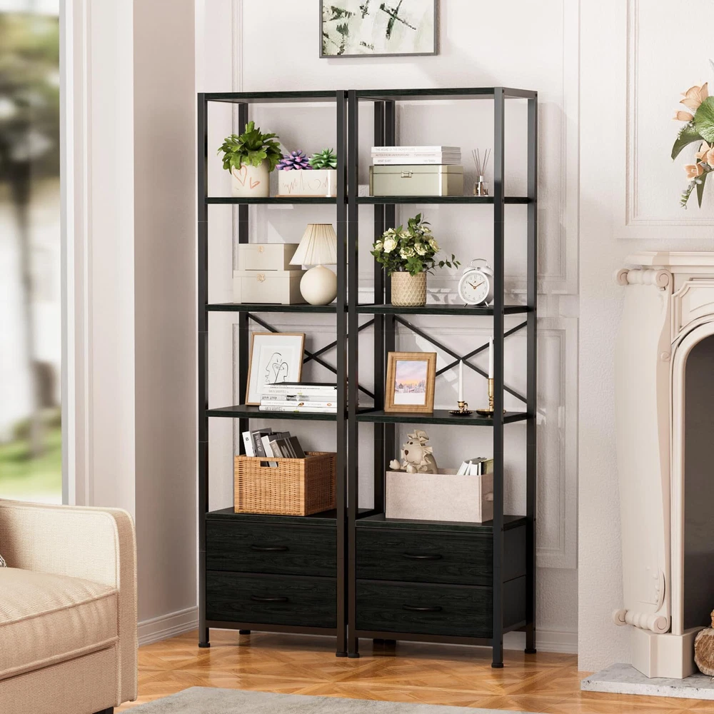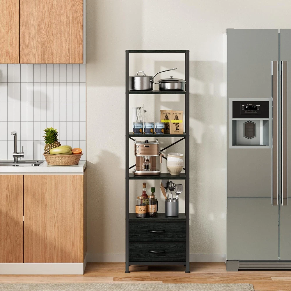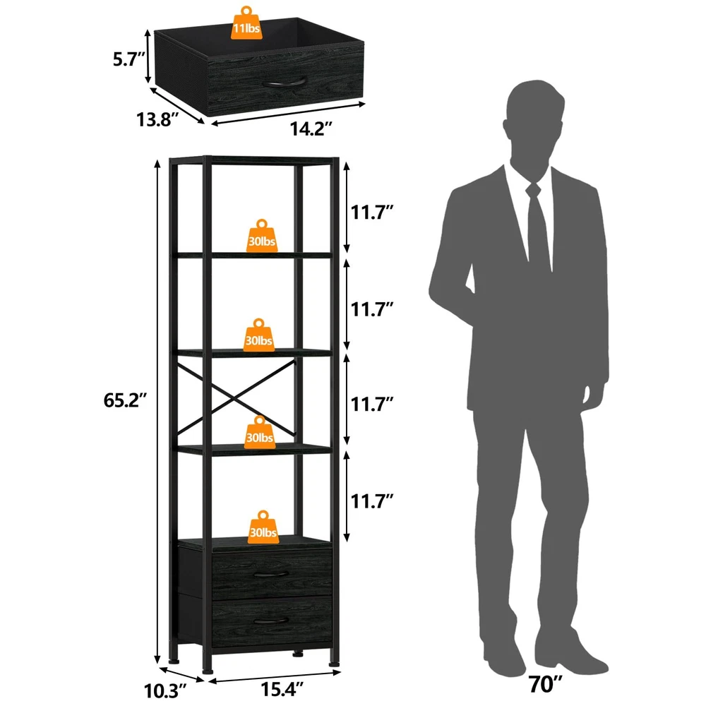 5-Tier Shelf & 2 Drawers: This bookshelf features multiple wood shelves to accommodate books, decor, and other items. The functional fabric drawers provide additional storage space for your personal items or office supplies, keeping your space organized and clutter-free. Space Saving & Utilizing: The tall and narrow design of this wall shelf allows you to make the most of vertical space, making it perfect for rooms with limited floor area. It efficiently utilizes unused wall space without sacrificing storage capacity, bringing you the convenience and functionality. Stable & Durable: This tall shelf is composed of wear-resistant wooden shelves and hard steel frame, which is crafted with high-quality materials for durability and long-lasting use. The solid construction ensures stability, making it a reliable storage solution for years to come. Easy to Assemble: With its user-friendly construction, assembling this bookshelf is a breeze. The package includes all the necessary hardware and clear instructions, guaranteeing a hassle-free setup process. Multiple Functions: This shelf combines display and storage functions, making it suitable for different rooms and scenes. It can be used as a bookcase in the bedroom, office, or a corner shelf in the living room, storing room, or a standing shelf in the kitchen, bathroom.
