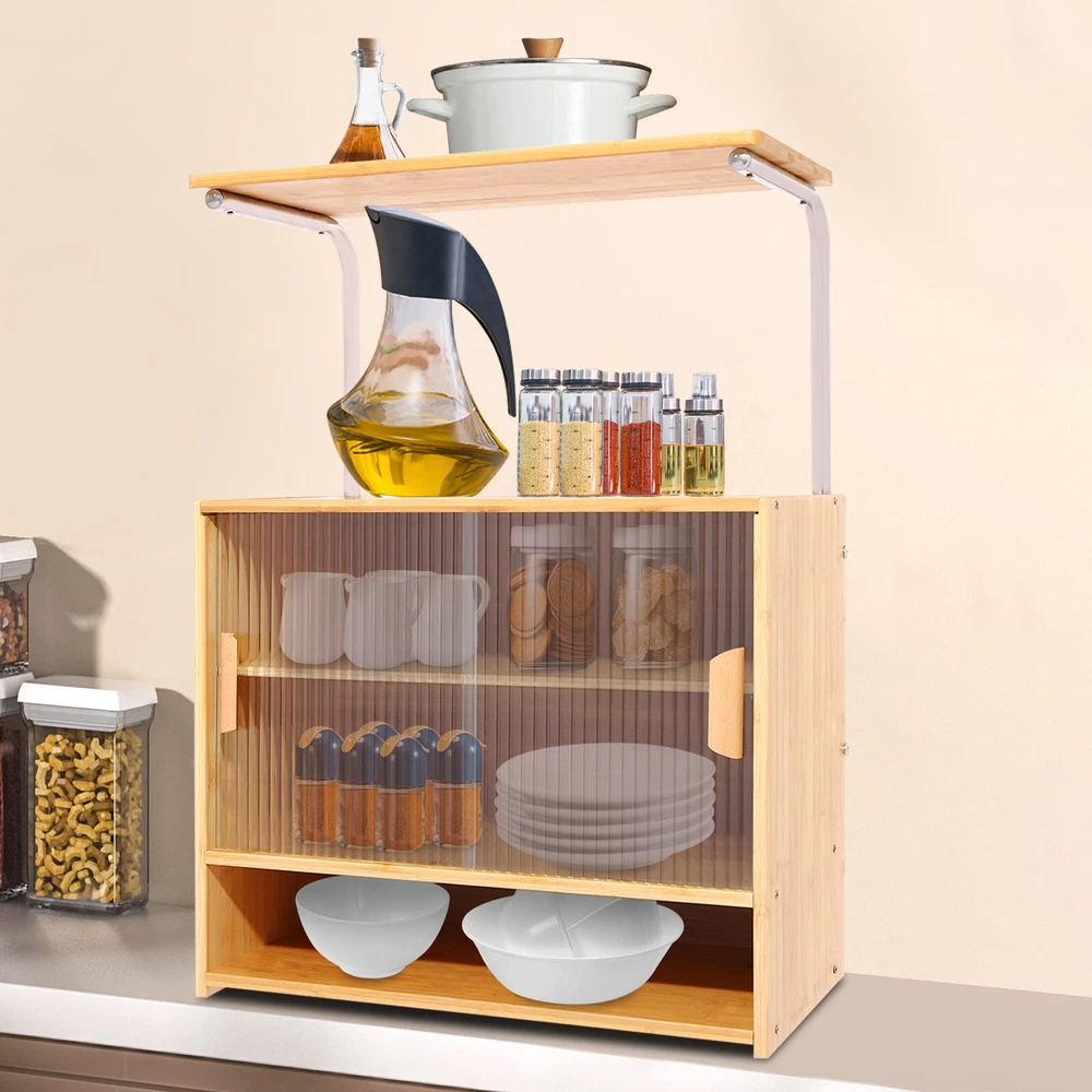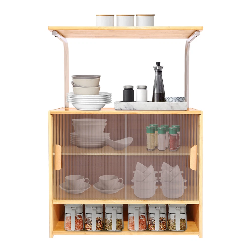 This kitchen storage cabinet is a game-changer for keeping everything organized! The 5-tier design with partitions makes it super functional, and the clear sliding doors let me quickly spot what I need. Love the modern look—it blends perfectly with my kitchen while keeping spices, jars, and utensils neatly stored. The sturdy build (density board, bamboo, and stainless steel) feels durable, and the smooth-gliding doors save so much space. Perfect for small kitchens or restaurants—highly recommend for a clutter-free, stylish setup!