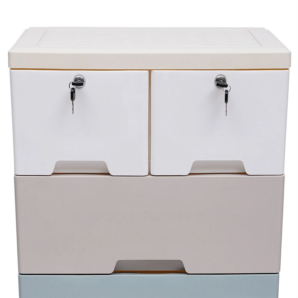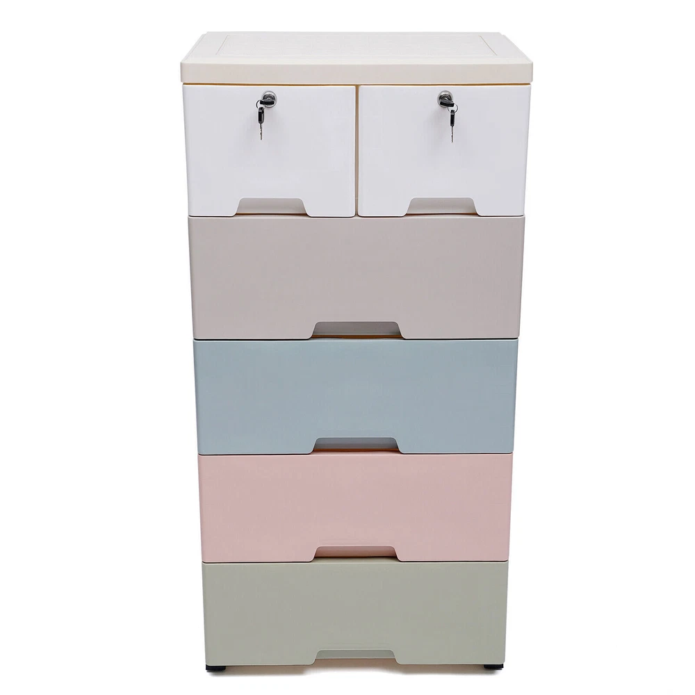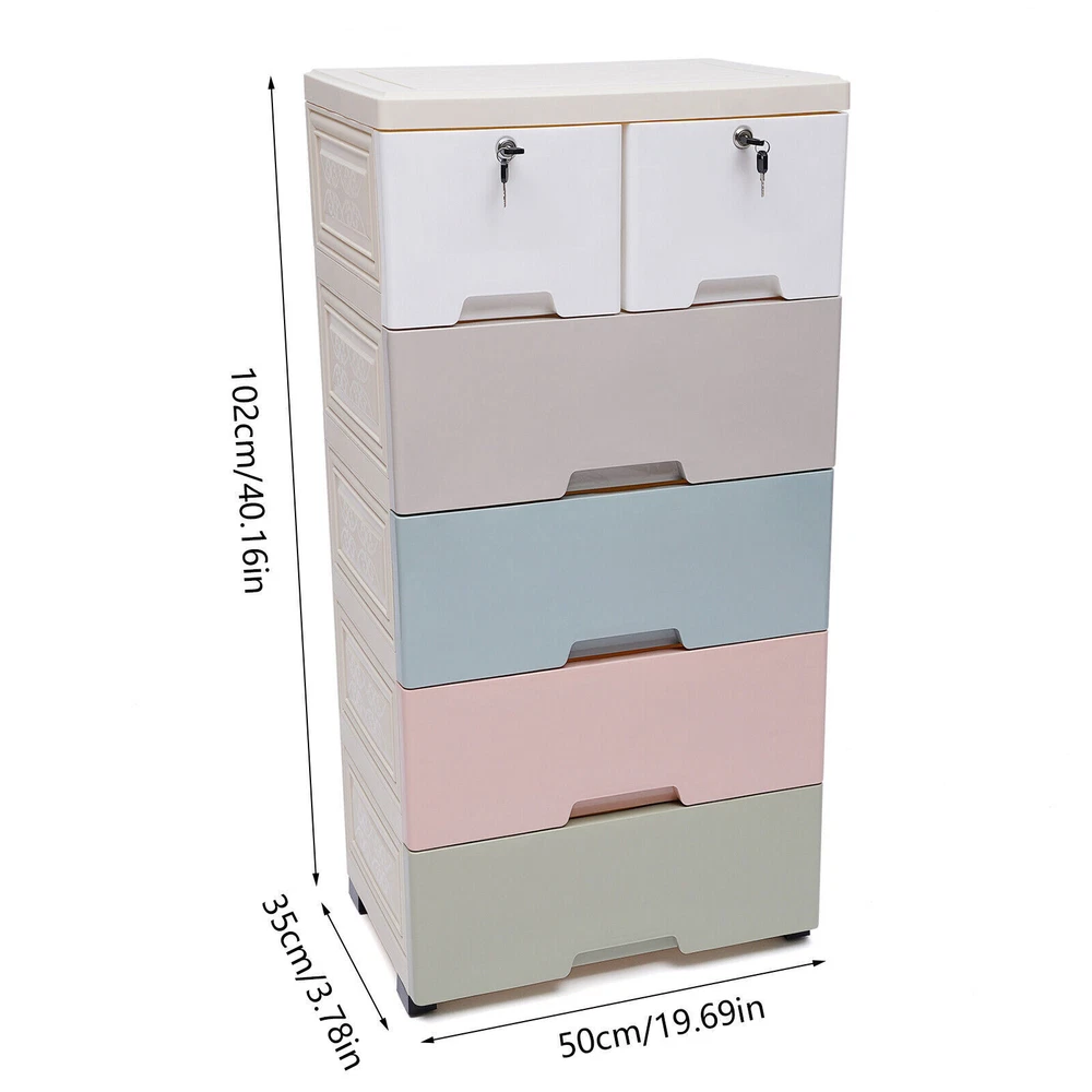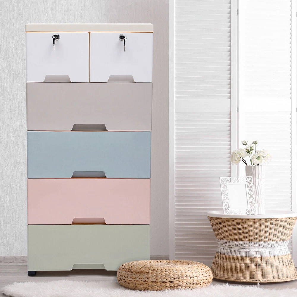 Please make sure the specification of the product before you purchase. Description This is a Multilayer-drawer storage cabinet that makes the most of seemingly useless crevice space for you. With this Multilayer-drawer storage cabinet, you can organize your items into categories. This not only makes items more neatly distributed but also saves time in searching for them. Key Features High-quality Material : The drawer storage cabinet is made of high-quality PP. Its excellent impact resistance makes this product sturdy and durable. And the food grade PP is safer and healthier. Large Capacity : The 5-Tier storage cabinet has five/Six drawers that can hold more than enough items. The large capacity of the 5/6-drawer storage cabinet meets your daily storage needs. Elegant Look : The smooth lines and sleek surfaces create an elegant storage cabinet. Such a stylish storage cabinet is suitable to match various home styles. Space-saving : The drawer storage cabinet is specially designed to utilize the gap space. Its Different size allows it to be placed in closets, cabinets, and bedside gaps, which saves a lot of space for you. Storage Assistant : The five/six drawers of our storage cabinet allow you to ort and store your items while keeping them easily accessible. With this storage assistant, you will embrace a new life of neatness and order. Stacking Design : The 5/6-drawer storage cabinet features a stacking design that allows you to combine and disassemble them as you see fit. The stacking design provides you with more flexible storage styles. Flexible Movement : The bottom of the 5/6-drawer storage cabinet is equipped with four wheels, allowing you to move it easily. Easy to Clean : The smooth surface of the 5/6-drawer storage cabinet is easy to clean. Simply wipe gently with a damp cloth. Easy to Install : We provide you with detailed installation instructions and a complete set of parts. You just need to follow the steps in the instructions to assemble it, which is easy and fast. Protect Your Privacy: This product comes with two drawers with locks, which can protect your privacy very well. (Two of them have locks, the others do not have locks) Details Thickened Top Plate : The top plate is thickened to give it a stronger load-bearing capacity. You can place cups, small potted plants, and other miscellaneous items on the top plate. Snaps : The two sides of each drawer are equipped with snaps to prevent the drawer from sliding down. Dense Frame Structure : The 5/6-drawer storage cabinet is designed with a dense frame, so they are more stable and sturdy. Drawer Handles : The drawers are designed with recessed handles for easy access to items and space-saving. The rounded handles can protect hands from being scratched and is also more beautiful. Smooth Wheels : The wheels at the bottom are made of high-quality PP, which is smooth and delicate. The smooth wheels run with little noise, providing you with a quiet experience. Application This 5/6-drawer storage cabinet is suitable for storing clothes, toys, children's books, and other items. The small size makes it suitable for placing in the crevice space next to beds, closets, sofas, and cabinets. Notes 1.Please read the manual completely before installation and use, and pay particular attention to the safety instructions included. 2.Please allow the slight color difference caused by the shooting light and 1-3cm error due to manual measurement, and make sure you do not mind before ordering.