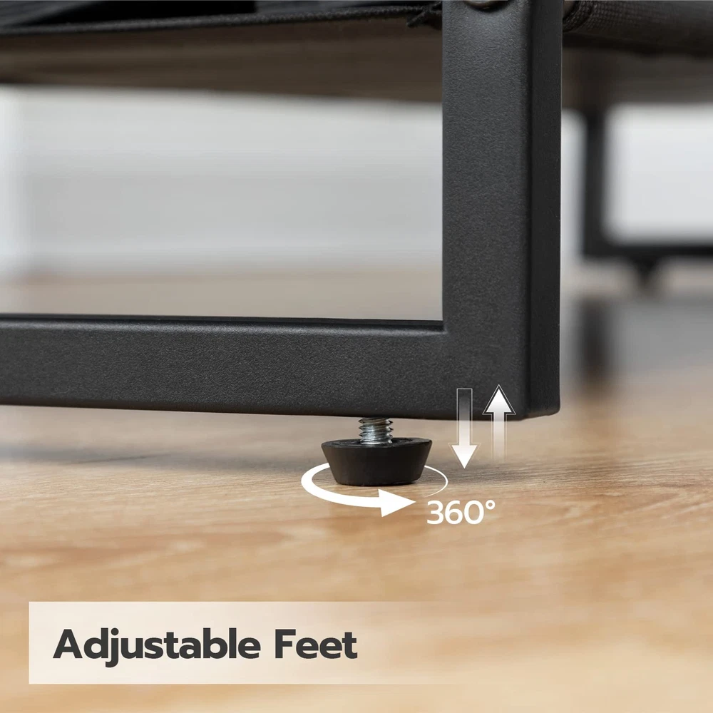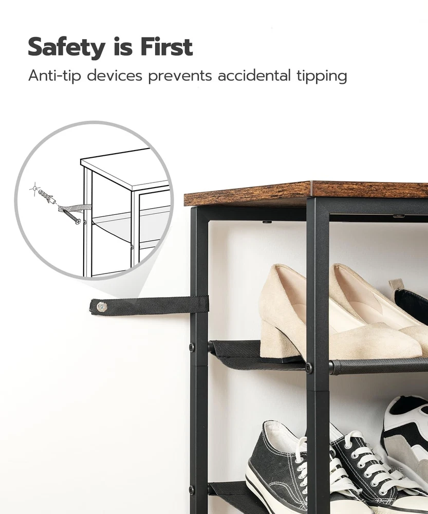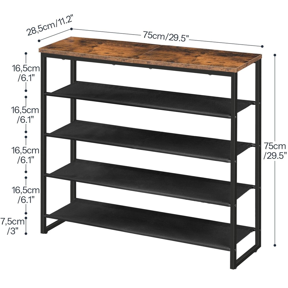 Shoe Rack, 5 Tier Shoe Storage Organizer, Shoe Shelf with 4 Fabric Shelves and Top Panel Does the child take off his shoes once he gets home? See the mess at the entrance and have nowhere to stand? Let shoe rack help you solve this problem and keep the entrance clean and tidy immediately. Be a hero to change your family habits. Specifications: Color: Rustic Brown, Black Material: Particleboard, Steel, Oxford Fabric Product Size: 29.5" W x 11.2" D x 29.5" H (100 x 30 x 75 cm) Product Weight: 12.7 lb (5.8 kg) Max. Static Load Capacity of the Top Surface: 22 lb (10 kg) Max. Static Load Capacity per Fabric Shelf: 11 lb (5 kg) Package Contents: 1 x Shoe Rack 1 x Anti-Tip Kit 1 x Accessory Kit 1 x Instructions 5-Tier Shoe Rack: Shoes no longer need to be piled in the corridor, because you can put them neatly on this 5-tier shoe rack. By making full use of the space, you can clearly get your shoes Storage Helper: This shoe rack is 11.2"D x 29.5"W x 29.5"H in size, very suitable for entryway with limited space, living room, bedroom, closet, apartment and dormitory. Extending vertical space usage, this shoe rack can be a choice for saving space. It also can be a storage shelf. Unleash your creativity! Material and Structure: This shoe rack is made of durable waterproof oxford cloth, particleboard and thickened iron pipe, featuring easier clean. The top wooden shelf can be used to place albums, plants, handbags and other items, beautiful and practical Built to Last: The reasonable structural design enhances the stability of the shoe rack. Max load ability of the top is 22 lb with each shelf bearing up to 11 lb. 4 adjustable feet help keep balance at all times Easy Assembly: Easy to set up in just a few steps. With detailed instructions and clearly numbered parts, it does’ t take any time to assemble this shoe rack