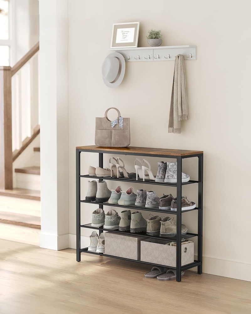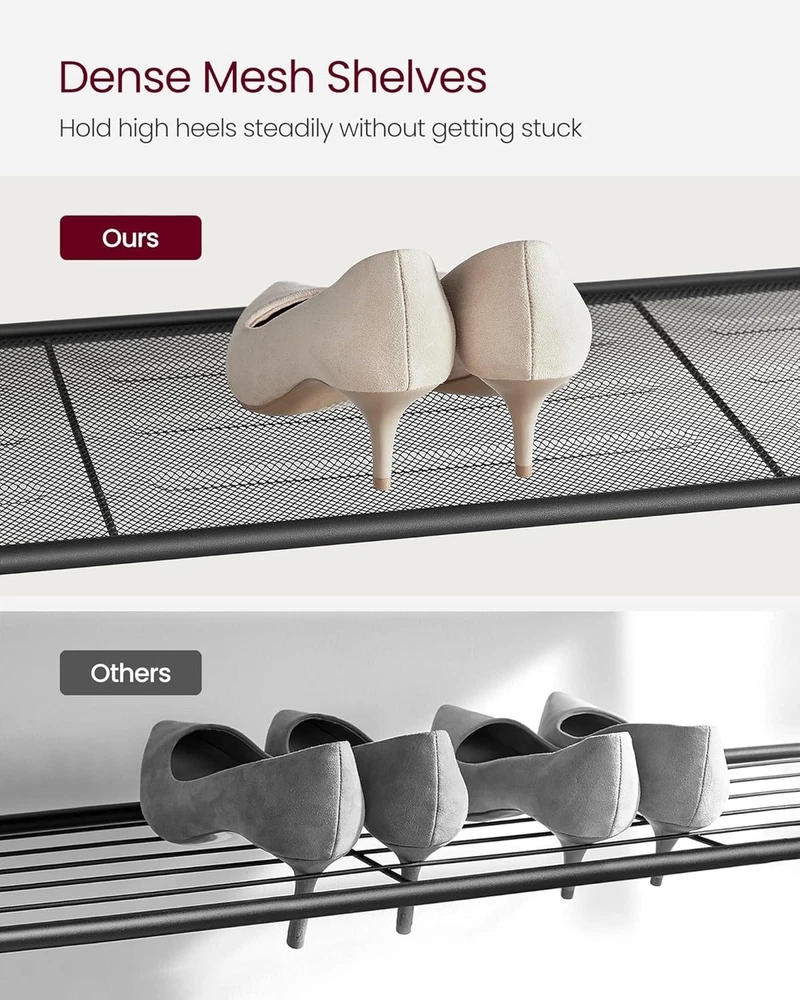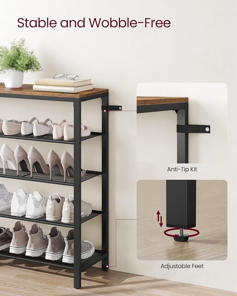 About this item No More Messy Shoes: Keep your family’s shoes organized with this smart 5-tier shoe rack. Sturdy & Spacious: Four open shelves with steel mesh hold shoes, while the top surface supports up to 22 lb for bags, keys, or decor. Each shelf holds up to 11 lb. Easy Assembly: Simple structure with detailed instructions makes setup quick and stress-free. Stable & Floor-Friendly: Adjustable feet ensure balance on uneven floors and protect tile or wood surfaces. Complete Package: Includes 5-tier shoe rack, assembly bag, and illustrated instructions.