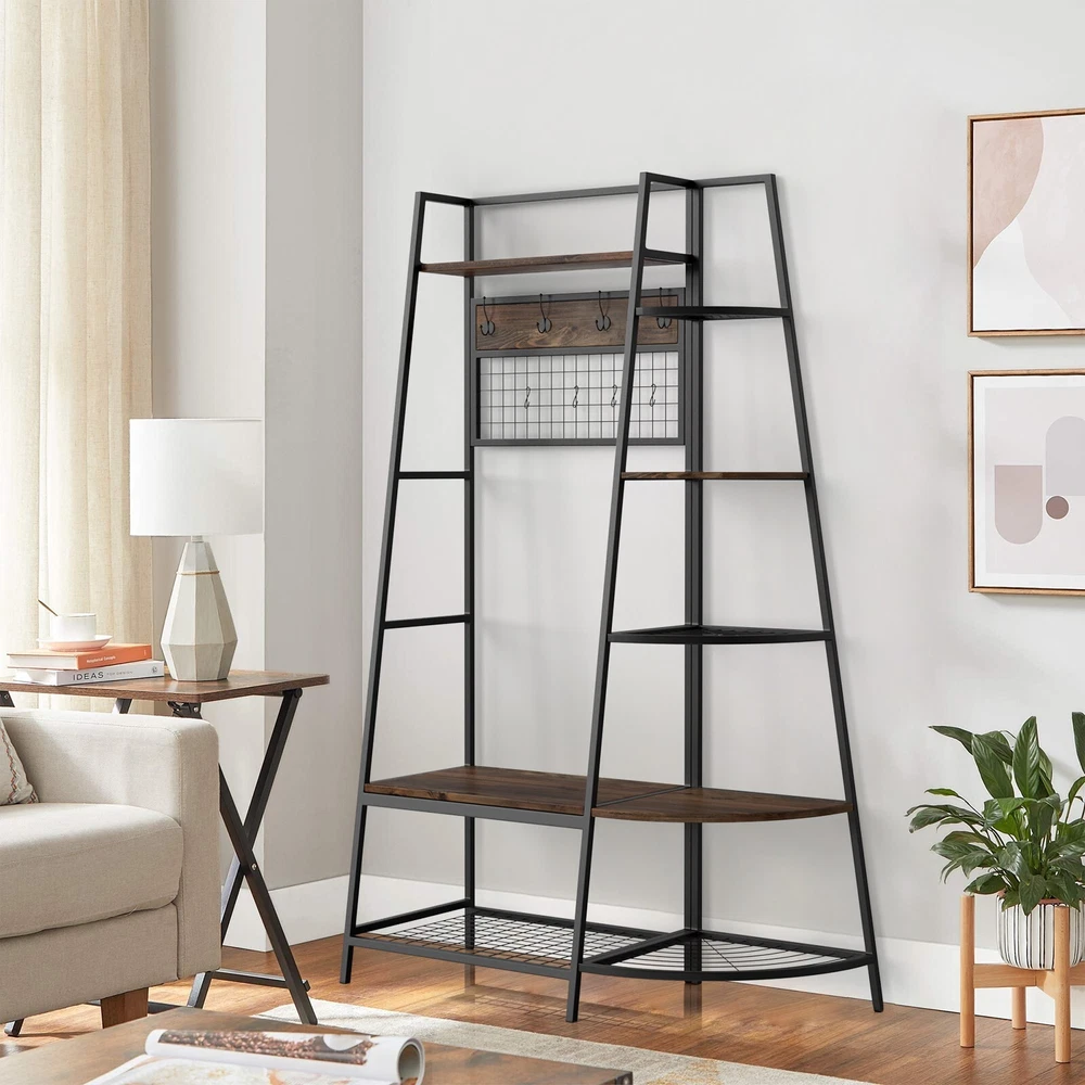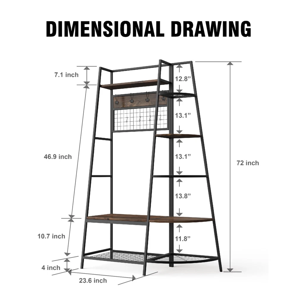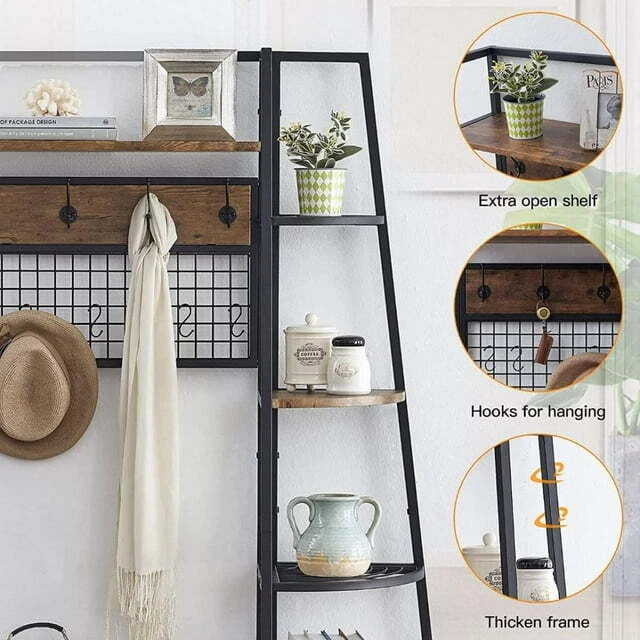 5-Tiers Ladder Storage Shelves, Freestanding Closet Organizer Clothes Rack Product details For a clothing rack that with the aesthetics of a decor piece, check out our Retro Entryway Clothes Rack. This was our favorite overall rack, boasting a natural, minimalist A-frame design made of metal that looks charming as an entry-way coat rack, bedroom clothing storage, or a decorative display for plants, books, etc. We provide various garment arrangement options and features 7 surprisingly stiff and sturdy wood shelving racks,grid area with 5 S-shaped hooks.Complete with a bench to sit on and remove shoes, this hall tree with bench has a bottom shelf which can hold multiple pairs of shoes or boots. Assembly is comparatively simple with this model. Product Specifications: Product Size: (LxWxH)40 x 16 x 72 inch/Weight:40lb Package Size: (LxWxH)41 x 18.5 x 9.5 inch Color:Brown Feature: Modern Aesthetics Design: Inspired by the popular industrial trend of modern furniture, this tree-like coat rack is not only a functional storage unit, but also rich in visual appeal. Five coat hooks, a grid area with lots of S hooks, and a bench to take off your shoes, all these useful features, plus a ladder-style bookshelf for displaying some ornaments and interiors plant. Versatility of Use: This entry coat rack with display area will be an attractive storage system in your home. The trapezoidal bookshelf can be used as extra storage for blankets, books and DVDs, or to display your favorite collectibles and photo frames. On top of this sturdy shoe cabinet, you'll find an extra shelf for home decor or indoor plants. Shelves can hold up to 40 lbs. and hooks can hold up to 10 lbs. Premium Frame Materials: Designed with a bit of modern industrial style, the black powder coated frame provides stability for this entryway hall tree. The long lasting manufactured wood is easy to assemble, and keeping this coat rack with shoe storage clean is as simple as wiping the frame and wood with a soft cloth. Multifunctional Areas: Comes with an 18" high bench for sitting and taking off your shoes for great convenience, and a shelf at the bottom of the bench to hold multiple pairs of shoes or boots. The grid area above the bench has S-shaped hooks for hanging smaller items like scarves and hats. Five black metal double coat hooks are sturdy enough to hold winter coats, backpacks and purses. The maximum bench seat weight is 220 lbs. Easy to Assemble: This Entryway Clothing Rack features compact and portable design. Assembly is easy with the help of the clear assembly manual. Easy enough to put it together in just under 35 minutes with just a screwdriver. So it is an ideal gift for who is not good at hands-on things. Friendly Service:We implement strict quality control and excellent after-sale service. Any defects caused by delivery or quality, we do provide reasonable compensation, and commit to reply all customer question within 48 hrs. Payment Delivery details Terms of sales About us Contact us Payment We only accept several paymeny ways as follow: Delivery details Your goods will be shipped within our handling time after your full payment. This excludes these locations: Alaska, Hawaii and Puerto Rico.APO/FPO’s are definitely excluded. Terms of sales Return: We accept return within 30 days,but we are not responsible for human damage.The return shipping cost is the buyer's responsibilities and try to keep it in your original package. About us We are selling all kind of ceiling fan,crystal chandelier,pendant lights in high quality with best discounted price. Our goal is providing all our customers 100% satisfaction and best customer service. Contact us If you have any questions please contact us through "Ask seller a question" link. We will respond within 2 business day or less.