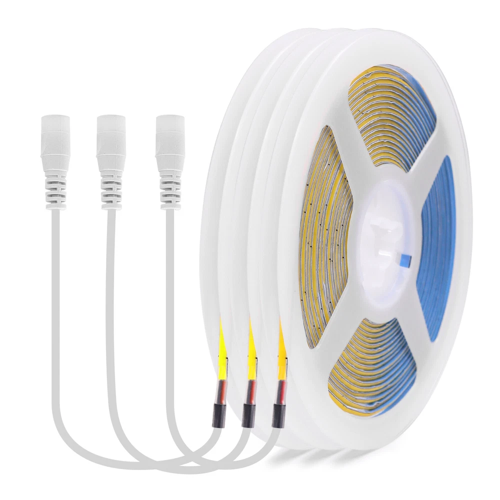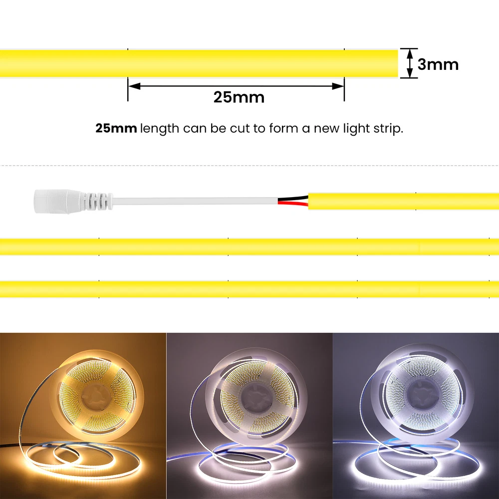 Specifications: Type: COB Led Strip Lights Input voltage: DC12V Power: 5-6W/m(5V); 8-10W/M(DC12V) FPCB Width: 3mm, 5mm, 8mm LED quantity: 320 LED/M Length: 0,5m, 1m, 2m, 3m, 4m, 5m Color temperature: Warm white (3000K), Natural white (4000K), Cold white (6000K) Cut length: 5V/12V 3mm: all 25mm 5V 5mm: all 25mm 12V 5mm: all 50mm 5V 8mm: all 25mm Waterproof quality: IP21 is not waterproof. Connection: 2-pin cable, USB-powered, DC connection USB plug cable length 15cm Operating temperature: -20℃~+45℃ Storage temperature: -20℃~+60℃ Viewing angle: 180° Propert ies: 1.Very smooth balance light, no illumination point, no dark area. 2. Super bright and soft light. 3.Much more bendable and flexible than any other SMD led strip. 4.Cuttable and jointable,can make any length you want. 5. RA>90, much friendly to eyes. Package included: 1x COB Led Strip