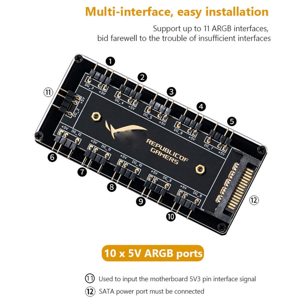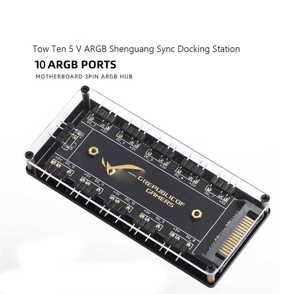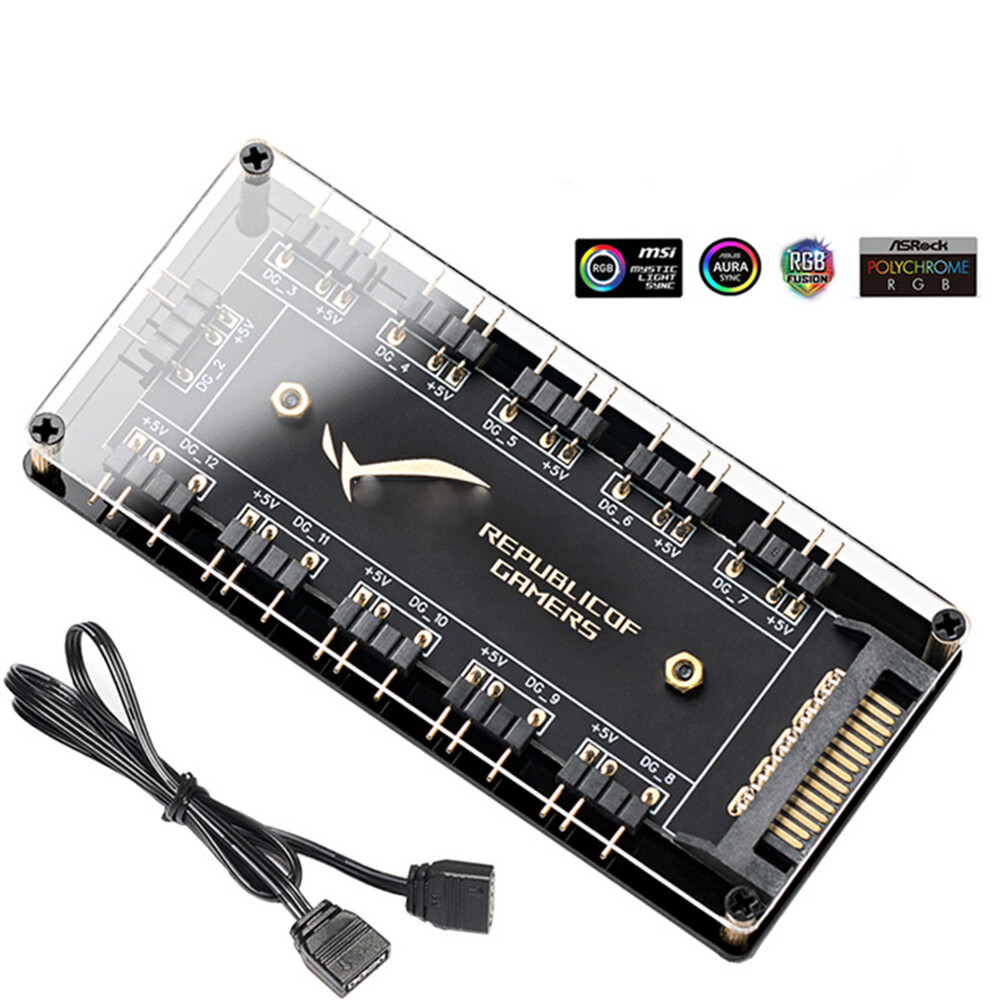 5V 3 pin ARGB RGBW Cable for ASUS AURA SYNC RGB 10 Hub Splitter SATA Power Extension Cable Adapter LED Strip Light PC RGB Fan Cooler Feature: 1. Support for ASUS, for MSI, for GIGABYTE, for ASRock motherboards (5V/3Pin D-RGB light control interface) to be controlled by the motherboard, and the lights can be synchronized with other D-RGB products. 2. Effectively manage wires. Five sets of fan jacks on the left and right for easy installation, creating a neat and tidy computer space. 3. With 52CM motherboard cable. The line length is 52cm, players no longer have to worry about short lines 4. The hub is a 5V 3PIN SATA/large 4D power port version. Specifically, it depends on the interface on the motherboard and the number of pins of the device interface you are using. You can purchase it accordingly. You cannot connect a three-pin four-pin device or a four-pin hub to a three-pin lighting device. 5. Multi-interface, easy installation. Support up to 11 ARGB interfaces, bid farewell to the trouble of insufficient interfaces. 6. Widely compatible. Standard 5V 3-pin interface, compatible with various brands of motherboards, universal standard 5V 3-pin ARGB interface, no need to worry about compatibility issues. 7. Comes with adhesive, easy to install. The paste is stable, double-sided adhesive is fixed, the installation is very convenient, and the foam pad on the back can also play the role of insulation protection. Specification: Category: RGB Fan Hub Number of fan ports: 10 Power interface: SATA interface Interface: 5V/3PIN Interface cable length: about 52cm/20.47 inch Process: gold plated Fixing type: adhesive backing Material type: 3mm acrylic sheet Product size: about 13*9*2cm/5.12*3.54*0.79 inch Product packaging: electrostatic bag Product gross weight: about 50g Note: This product is not an adapter, this is just a hub, it can only be used when the mainboard interface is not enough, the device interface without the adapter function must be the same as the mainboard with the same number of interface pins before it can be used. Due to the different monitor and light effect, the actual color of the item might be slightly different from the color showed on the pictures. Thank you! Please allow 1-2cm measuring deviation due to manual measurement.