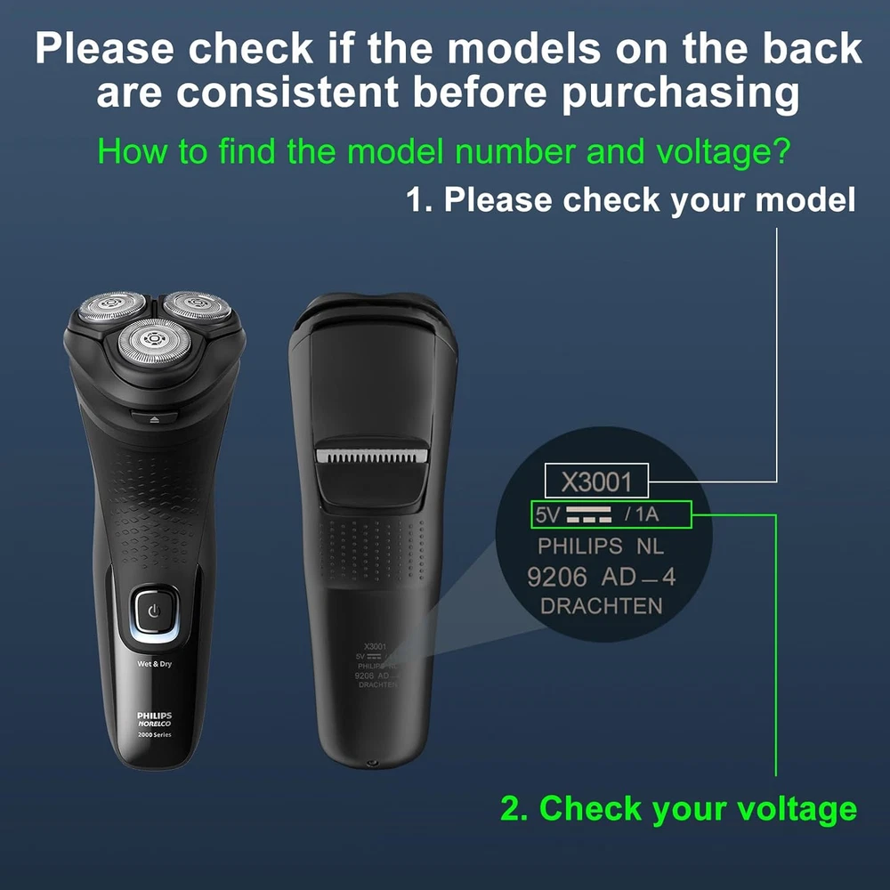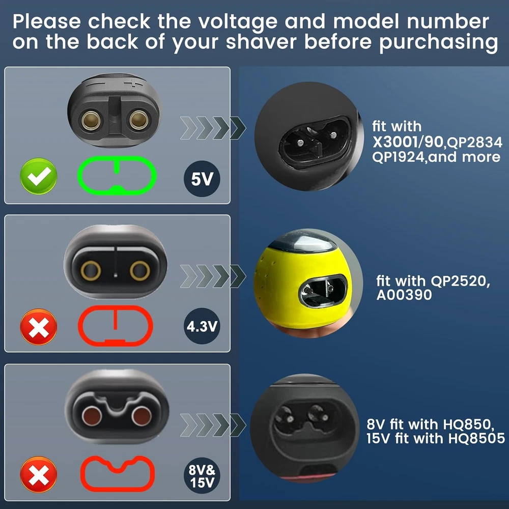for Philips Norelco Shaver Charger Cable: Fit for Philips norelco shaver S3341/92(3900) X3001/90(2400) S3243/91(3600) X5006/85 MG9520/50 MG7910/49 MG9510/60 MG5910/49 QP2724/90 QP2834/70 QP1924/70 QP6531/70, for philips rechargeable wet & dry electric shaver (Not Applicable to Old Versions) Product parameters: Input: AC 110-240V, 50-60Hz, Output: DC 5V 1000mA, Cable length: 3 feet. Please note: The output is 5V, not suitable for 15V. Safety: Tested, approved and certified by FCC, CE and ROHS, and designed with safeguard features against over voltage, over current, short circuit and over-temperature, and its low energy.(NOTE: If using in the bathroom, make sure the shaver and adapter are dry.) Please note: Not applicable to philips QP2520, QP2630, HQ8505, HQ850, HQ840, QP6510, QP6520!(Please check your shaver model and our charger plug carefully before purchasing. If your shaver is not included in our list, please contact our customer service for confirmation before purchasing.) Focus Your Experience:for philips trimmer charger is put through rigorous quality control procedures to make sure safe and eliable working for years, our products will efficiently charge your devices. Product Description How to Choose the Right Philips Charger?(Please Check Before Purchasing) Add to Cart Add to Cart Add to Cart Add to Cart Add to Cart Customer Reviews 4.4 out of 5 stars 90 4.4 out of 5 stars 48 4.2 out of 5 stars 110 4.4 out of 5 stars 2,447 4.7 out of 5 stars 32 Price $9.69 $ 9 . 69 $7.99 $ 7 . 99 $7.99 $ 7 . 99 $8.99 $ 8 . 99 $6.99 $ 6 . 99 Input 100-240V AC, 50-60HZ 100-240V AC, 50-60HZ 100-240V AC, 50-60HZ 100-240V AC, 50-60HZ 100-240V AC, 50-60HZ Output 5V 1A 5V 1A 15V 0.36A 4.3V 70MA 8V 100MA Compatible Wet&Dry Shaver 2400 3900 7500 Wet&Dry Shaver 2400 3900 7500 HQ8505, HQ9160, HQ9020 QP2520, A00390 HQ840, MG3750 P/N X3001/90 S3243/91 HQ8505 QP2520 HQ840 Reminder Light × × ✓ ✓ ✓