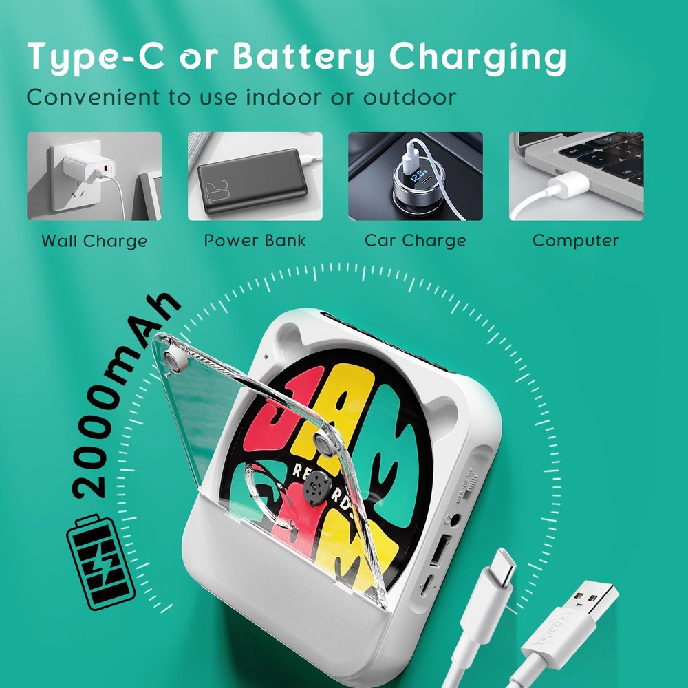 SAFE & SECURE SHOPPING 100% SATISFACTION GUARANTEED FAST SHIPPING 5V2A BT 5.3 CD Player CD/USB/3.5mm AUX Multiple Media Formats Compatibility Product Description Features: Immersive Sound Experience: This Bluetooth CD player employs cutting-edge technology to deliver clear and dynamic audio, elevating your English learning journey to new heights. Whether it's every nuance of your English lessons or the rich audio spectrum, you'll be immersed in an unparalleled auditory feast, enjoying every moment of the learning process. Portable and Versatile: Designed with a slim profile and lightweight construction, this player is the perfect companion for your on-the-go needs. Whether you're commuting, exercising, or traveling, it seamlessly integrates into your life, providing uninterrupted learning experiences. Additionally, it supports multiple media formats, including CDs, USB media, and 3.5mm AUX wired audio input, catering to your diverse entertainment needs. Extended Battery Life and Quick Charging: Equipped with Type-C quick charging functionality, it ensures that your music and learning are never interrupted by a dead battery. Our player boasts impressive battery life, allowing you to study for extended periods without worrying about power issues. Wireless Connectivity and User-Friendly Operation: With Bluetooth capabilities, you can effortlessly connect to speakers or Bluetooth headphones, bidding farewell to tangled cables and embracing a hassle-free learning experience. The intuitive touch buttons and display design make it easy to navigate and manage your music collection, with simple and quick operations. Essential for Travel and Learning: This Bluetooth CD player is not only a valuable assistant for language learning but also an indispensable entertainment tool for travel. Its compact design allows it to fit easily into your travel gear, transforming your travel time into productive language learning sessions, whether you're on a long journey or a short trip, enabling you to enjoy both learning and entertainment. Specifications: Material: ABS Size: 13.3*13.3*2.5cm Playback Disc Format: CD, CD-R, CD-RW, MP3, WAV Battery Capacity: 2000mAh Charging Voltage: 5V2A (Type-C charging port) Output Power: 2W Bluetooth Version: 5.3 Frequency Range: 50Hz-20KHz Signal-to-Noise Ratio: 70dB Package Included: 1 x CD player (CD is Not Included) 1 x User manual 1 x Type-C charging cable 1 x Earphone 4 x Earphone caps (2 Pairs) Shipping Returns Contact Us Cancel Policy Shipping 1. Shipping via eBay fulfillment. 2. Dispatch items within 1 working day if payment received before 2pm. Returns 1. Please contact us before you return the item, we would solve it for you asap. 2. Returns only be accepted within 30 days. Contact Us 1. Please contact us before reviews or disputes, we would solve issue asap. 2. Reply within 24 hours on working days, 48 hours on weekends. Cancel Policy 1. Before ordering, please check description to Make Sure it Fits. 2. Orders Can't be cancelled or revised Once Packing Starts. Copyright © 2022 Tongtool