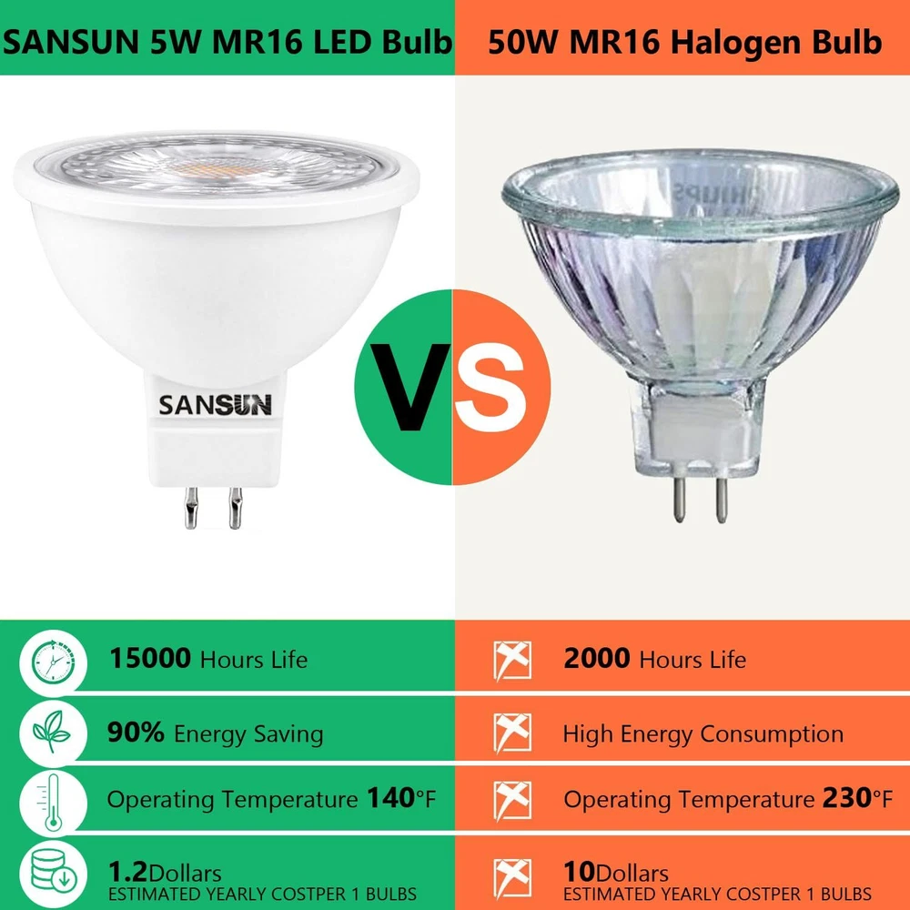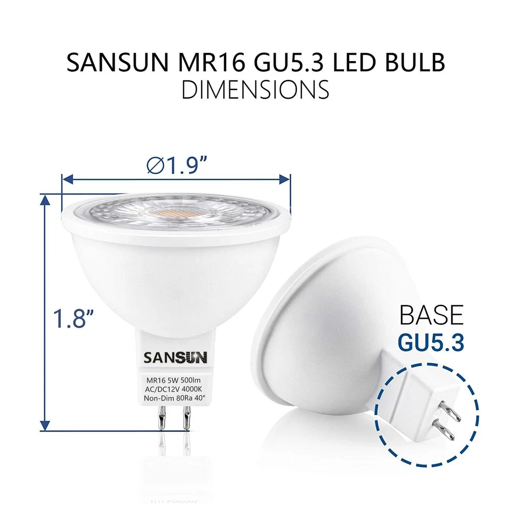 's MR16 LED bulb can be used in track light, pendant fixtures and ceiling fixtures. Personalize your home with stylish accent or ambient lighting. GU5.3 bulb series is a price-conscious product line that is designed to work beautifully and effectively in the general-purpose applications found throughout the home, office, and warehouse. By offering these products as a high quality yet cost-competitive option, we are able to provide the energy-smart LED products you need for the right price. COMMON APPLICATIONS Kitchens Living Rooms Dining Rooms Bedrooms Hallways FEATURES Replaces your current 50 Watt halogen bulb Lasts 15,000+ hours versus an halogen with a 1000-5,000 hour life hours Zero to minimal noise output in accordance with certificate regulations - maximum 16 dB. No UV, unlike fluorescent bulbs WHY LED? Reduce your electricity bill Help preserve the environment by reducing carbon footprint New technology provides increased lifespan compared to less-efficient incandescent NOTE: This is a GU5.3 which runs with 12V, therefore it cannot be plugged directly into an AC outlet. 5W MR16 LED Spotlight Bulb Equivalent 50W Halogen Bulb, Replace 20W/35W/40W/50W Traditional Halogen 12V AC/DC Low Voltage Designed for Landscape Lighting, Patio/Lawn/Path lights, Track Light, Floor Lamp, Ceiling Light Standard 12V 50W MR16 Shape with GU5.3 Bi-Pin Base Instant on at Full Brightness with 40 Degree Light Dispersment When Use Halogen Transformer, if Bulb Flickers, Pls Add 1~3 Halogen Bulbs in LED Bulbs Assembly (Due to low power consumption causes flickers) Recommended Use LED Transformer or Magnetic Transformer.