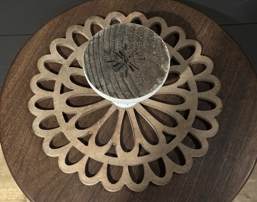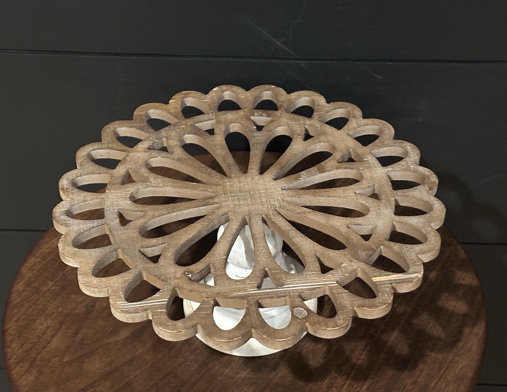 #5…Wooden Cake Stand on Pedestal…12x5. Round Abstract Modern Cake Stand, Brown/White Matte Finish