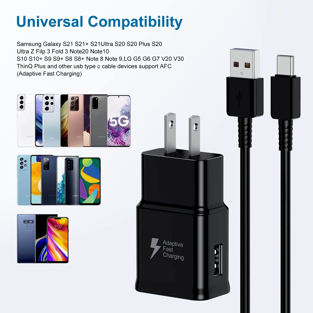 Adaptive Fast Charger: This fast wall charger compatible with both Quick Charge 2.0 (QC 2.0) and Adaptive Fast Charging (AFC) ,enables mobile phone to be 50% charged in 30 mins,75% faster than standard chargers. You should not be concerned the fast charger gets hot when charging "The purpose of this AFC technology is to get the phone charged faster to a percentage of 50 to 60 percent. During charging, the phone may become very hot. It will cool down after 60% of battery. Therefore, AFC is actually not used to fully charge a device." Fast charging Compatible phone model: For Samsung Galaxy S21/S21+/S21 Ultra/S20/S20+/S20 Ultra/Note20/Note 10- Samsung Galaxy S10 / S10 e / S9 / S9 Plus/ S8 / S8 Plus / S8 Active / Note 9 / Note 8 - Samsung Galaxy S7 / S7 Edge / S7 Plus / S7 Active / S6 / S6 Edge / S6 Plus / S6 Active / Note 5 - Other Quick Charger 3.0/2.0 supported devices For Huawei P30 Pro, P30 Pro, P20, P20 Pro, P10, Mate 30, Mate 20, Mate 10 For Lenovo Zuk Z1 / Z2 / Z2 Pro / Edge For HP Pavilion X2 / Spectre X2 For Google Pixel / Pixel XL / Pixel 2 / Pixel 3 / Pixel 3XL / Pixel XL2, Nexus 5X / 6P For Nokia N1 Tablet / 9 Microsoft Lumia 950 / 950 XL Asus Zen AiO / Z580C tablet Xiaomi 5 ZTE Axon 7 And More Package Included: 5x fast wall charger (Optional)