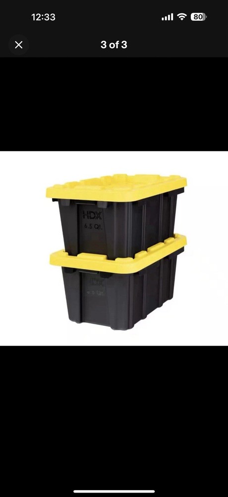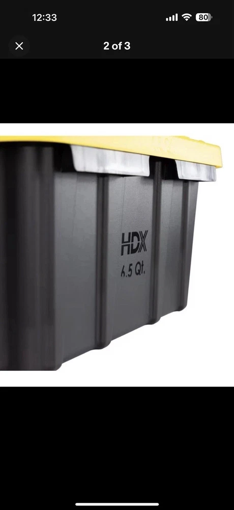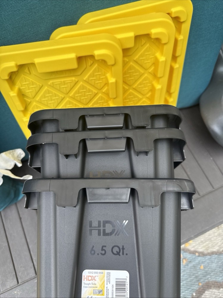Style:This storage tote comes in a classic black and yellow color schemItem Length:8.1”California Prop 65 Warning:See detailModel:999-27G-HDX.Finish:black with a yellow lid.Assembly Required:NoPersonalize:NoShape:RectangleUPC:0840254201217Country of Origin:United StatesItem Width:12.9”Mounting:Free StandingPattern:SolidBrand:HDXOriginal/Reproduction:OriginalNumber in Pack:5Type:ContainerTheme:See detailFeatures:Heavy Duty, Lidded, StackableCapacity:6.5 QtItem Weight:Less Than 2 lbSize:MiniItem Depth:25.2 inMaterial:PlasticNumber of Compartments:1Number of Items in Set:Two-PieceItem Height:6.2”gtin13:0840254201217Color:Black,YellowMPN:NA