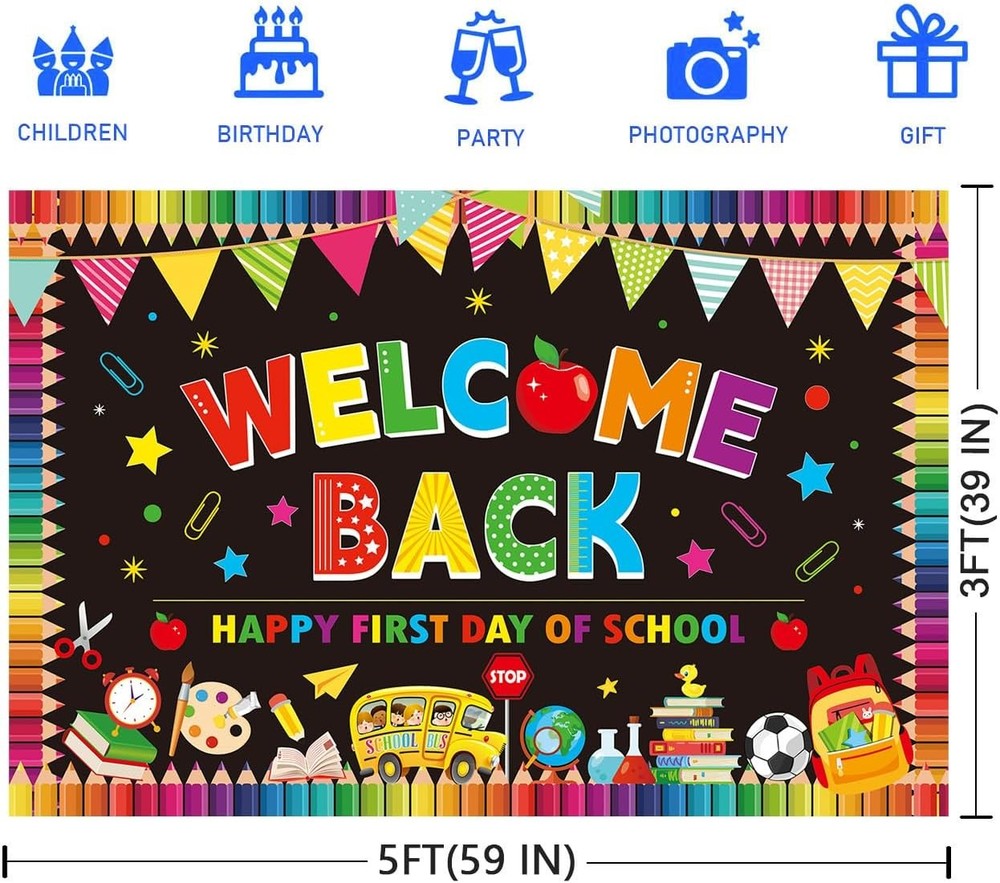 Back to School Backdrop Decorations,5X3Ft Welcome Back to School Banner Backdrop for Photography Black Large Size Happy First Day of School Party Wall Background Product Description Attractive Design: Want a special back to school party? This backdrop is designed for back to school, featuring letters with"Welcome Back, Happy First Day of School" and patterns of school buses and other related elements, matching the theme. Size: This back to school backdrop decorations measures 5x3ft and has round holes in each corner. You can hang it with ropes or nail it to the classroom door or indoor and outdoor walls as a background decoration for the back to school party. Quality Material: This back to school backdrop decorations is made of high-quality vinyl material, which is waterproof, soft to the touch and very durable. The printed patterns are very clear and can be used for a long time. Occasions: This backdrop is specially designed for the back to school and is suitable for the background decoration of the first day of school theme party and class activities for primary and secondary school students. Wish you a pleasant party time. To give customers better shopping experience, if you have any suggestions about our products, please contact us immediately Product Description 3.0 inches x 3.0 inches x 0.04 inches. Weight: 0.2 oz . PAYMENT We accept all payments via Ebay using Credit Cards , PAYPAL , Apple Pay and many others SHIPPING We are always working hard to ensure your package arrives as soon as possible. Please understand that some factors like weather, high postal traffic, and the performance of shipping companies are outside of our control. DELIVERY & RETURN POLICY We offer a 30-Day Return Policy on items in which you are not completely satisfied with. You have the option of a full-refund or an exchange of the item. No returns are available on items shipped outside of the USA. © 2025 [Widenyourworld_kusi]. All Rights Reserved.