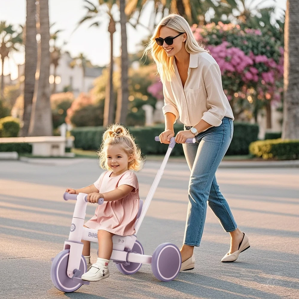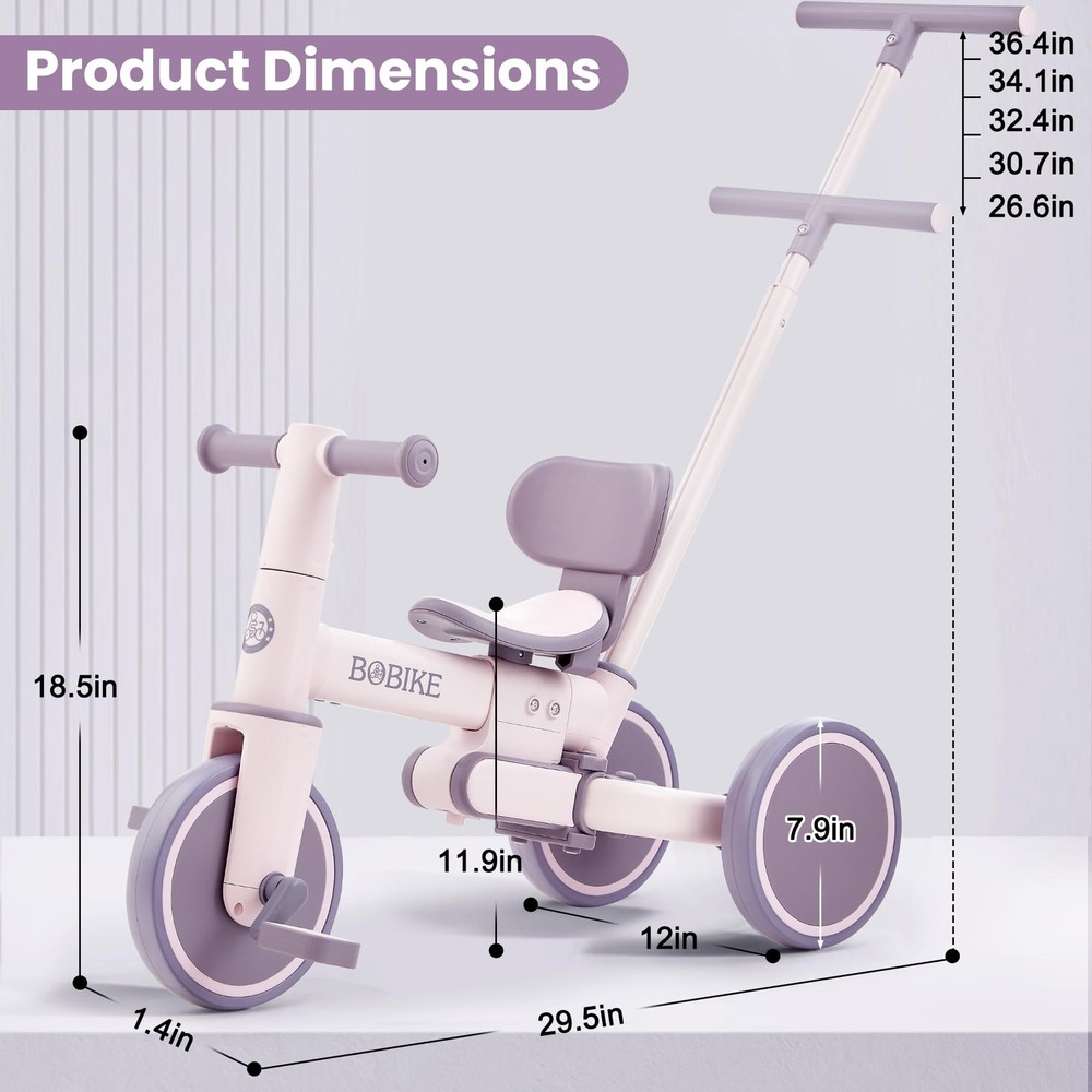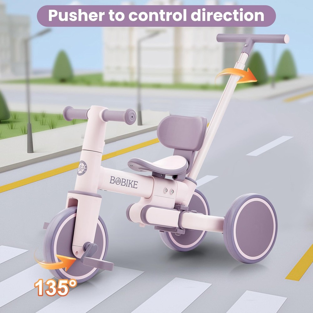 Toddler Bike with Push Handle 5-in-1 Kids Tricycle: Our kids bike converts into 5 modes—Kids Tricycle, Balance Bike, Push Bike, and more—perfect for kids aged 18 months to 5 years. Ideal for indoor and outdoor adventures, this versatile tricycle for toddlers 18 months to 5 years old grows with your child. Tool-Free Assembly: Easily convert between modes with no tools required. The toddler bike handlebars, wheels, and pedals are removable and adjustable, ensuring a perfect fit for your child as they grow. Parent-Controlled Steering:Our toddler push bikes have 135-degree swivel push handlebars that allow parents to control direction and speed for safety. It can be adjusted according to the needs of parents, perfect for family trips. Thoughtful design:Our kids tricycle push handlebar offers 5-position height adjustment for parents of different heights, while the removable seat backrest provides extra comfort and support for your baby. Perfect for Growing Kids:Our kids tricycles are ideal for gifts for boys and girls aged 18 months to 5 years. It makes it easier for them to learn to ride, thus enhancing hand and foot coordination. It is also ideal for family outings.