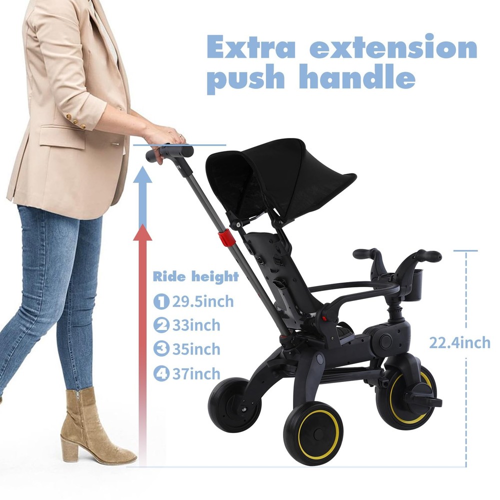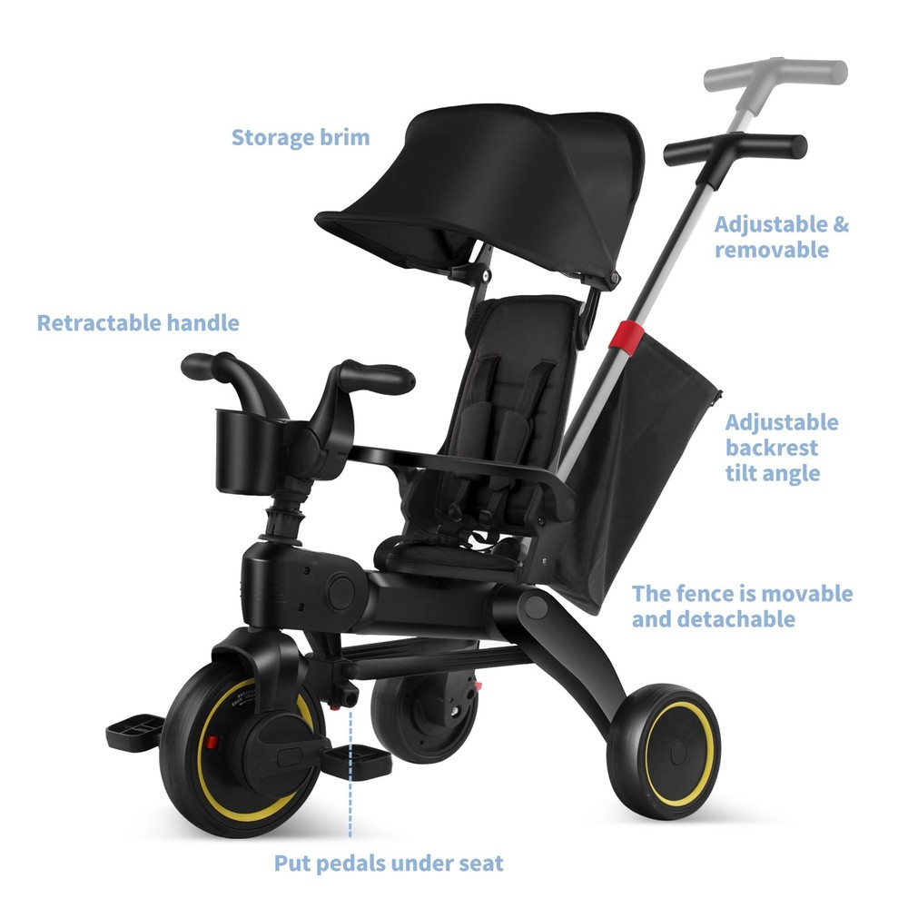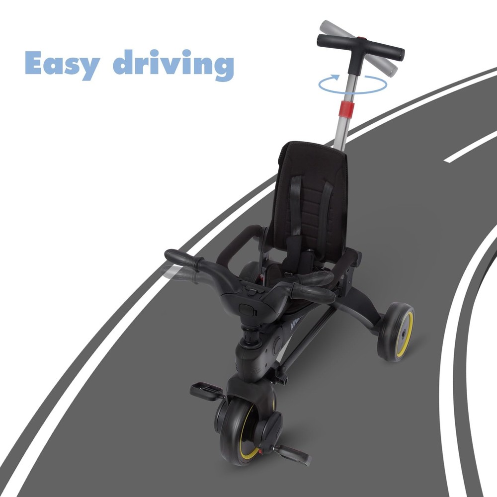This versatile 5-in-1 tricycle is perfect for toddlers just starting to ride. It folds up compactly for easy storage and transport, yet expands to allow growing riders up to 3 feet tall lots of room to pedal and steer. With 5 play settings including ride-on, push walker and stationary activity center, this tricycle encourages physical development from ages 10 months to 3 years. Non-slip pedals and oversized rear wheels provide stability as little ones get the hang of balancing. An adjustable seat and handlebars ensure a comfortable fit as your child grows. Long-lasting plastic construction can handle the occasional tumble. Parental controls allow grownups to steer assistive rides. Convenient carry handle and lightweight design make this trike perfect for playdates or trips to the park. MULTI-FUNCTIONAL RIDE: This tricycle folds up compactly for convenient storage and transportation, yet unfolds to provide toddlers a stable 3-wheel ride for indoor or outdoor fun. ERGONOMIC DESIGN: Adjustable seat and handlebars grow with the child from 10-36 months, keeping them comfortable and in control as they learn to pedal, steer and balance. SAFETY FIRST: Non-slip pedals, rear wheel brake and low center of gravity provide stability, while padded seat and handle grips offer protection as little ones discover independent mobility. COMPACT PORTABILITY: Folds down quickly and easily to a small portable size for car trips or stowing at home, extending the enjoyment wherever adventures may lead. SOLID CONSTRUCTION: Made from premium-grade fiber-reinforced polymers, durable soft-ride wheels and non-toxic plastic parts are built to withstand enthusiastic toddler use indoors or out, while remaining lightweight for easy adult lifting and carrying.