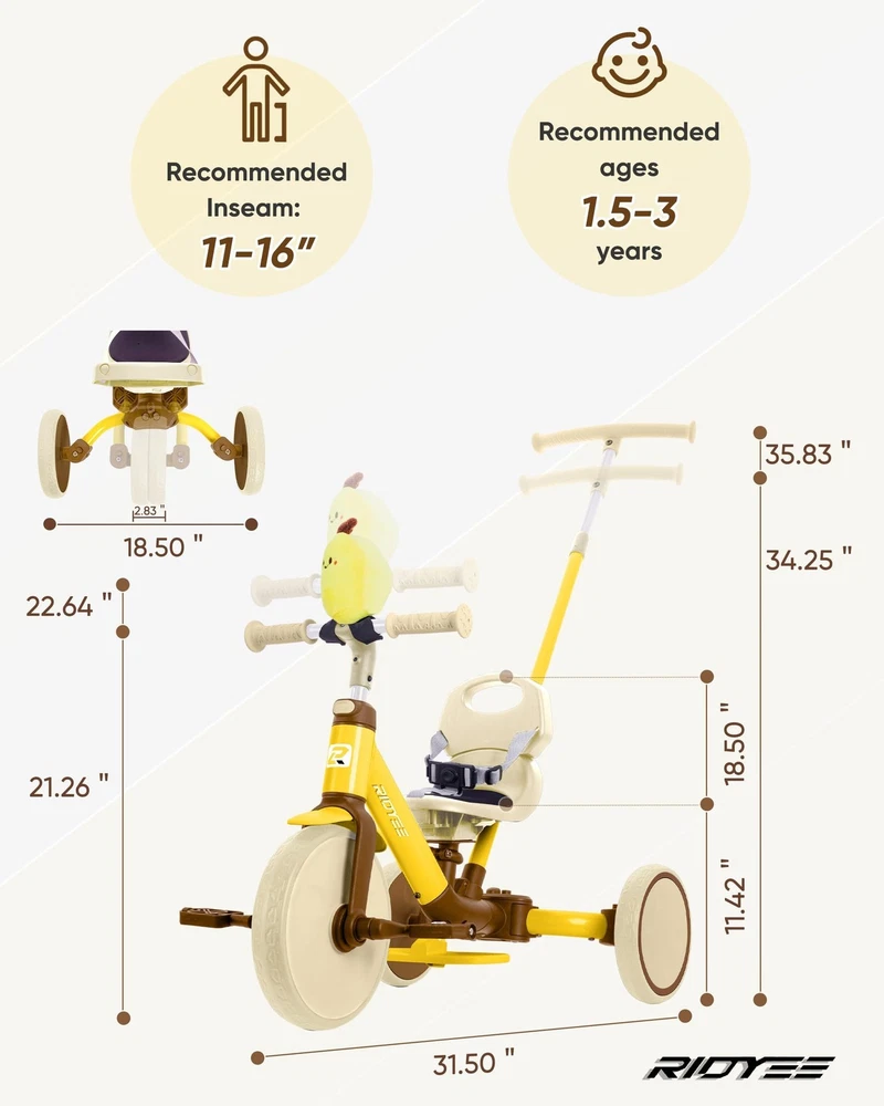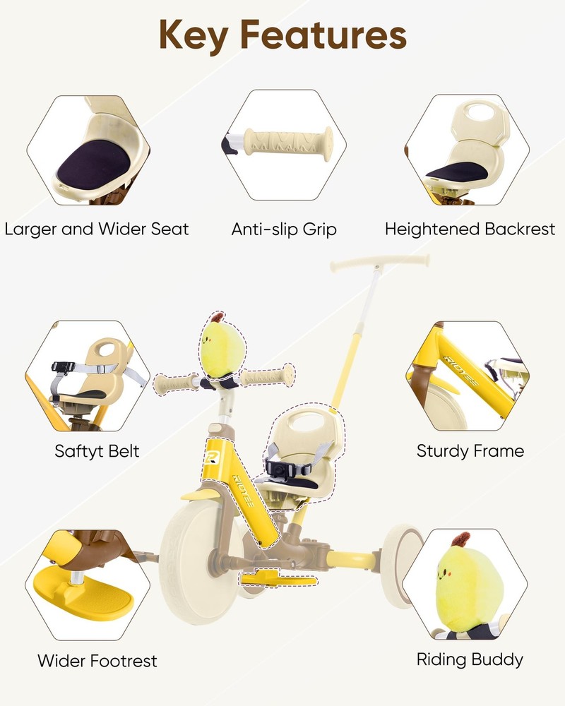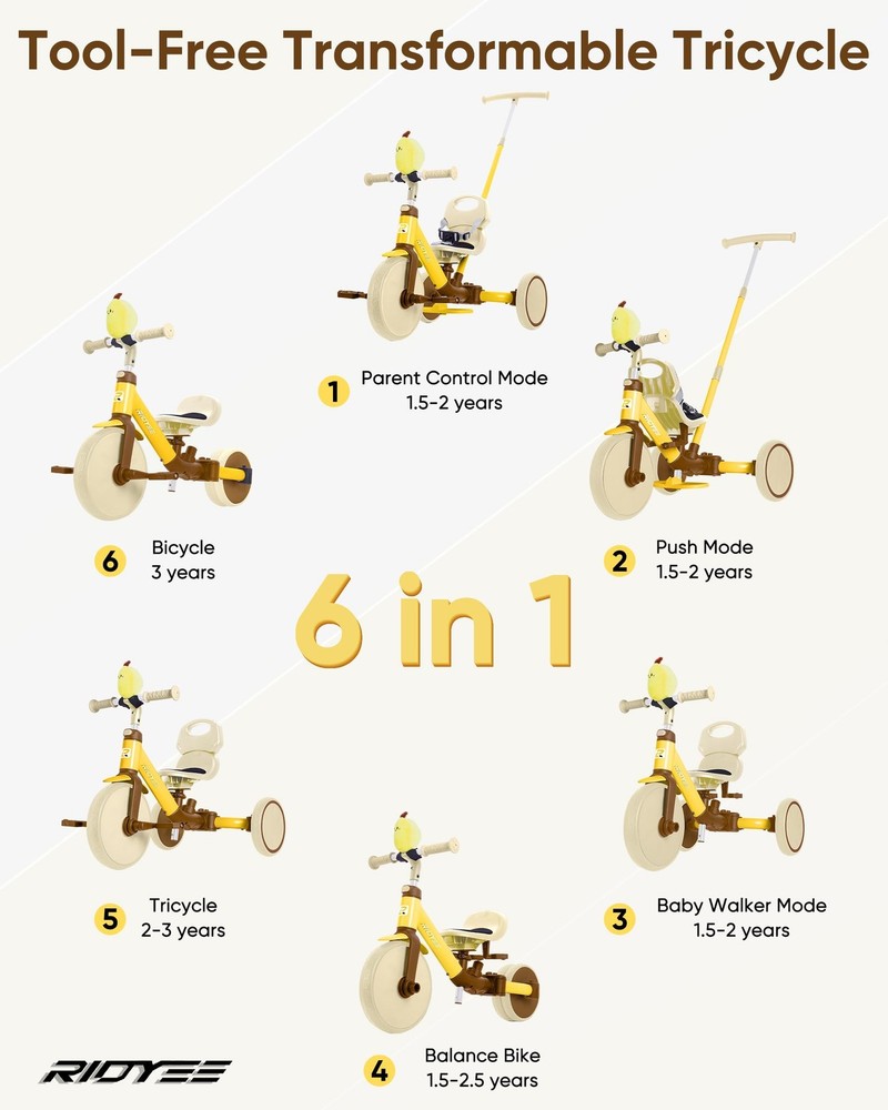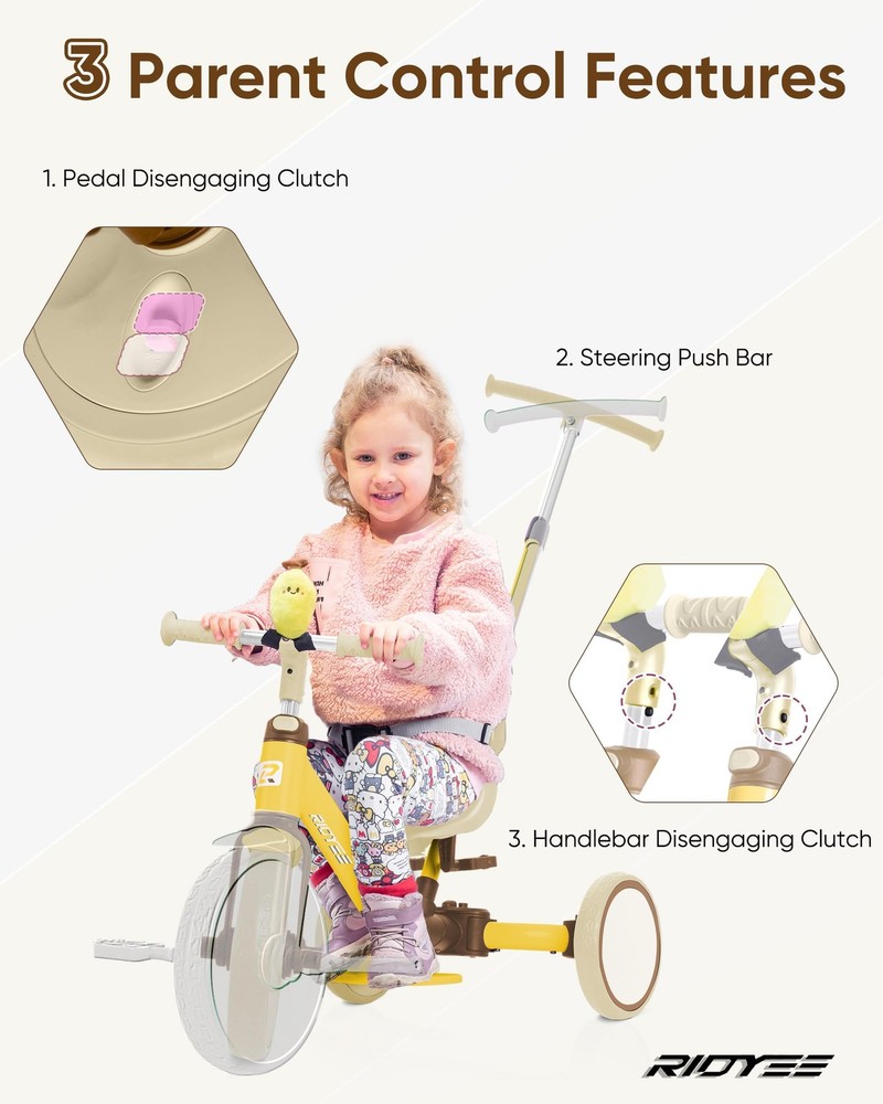 5-in-1 Kids Tricycle for Toddlers 1.5 - 3, Tool-free Convertible Kids Push Trike to Balance Bike, Safety Belt, Removable Backrest and Footrest, Ride-On Toy for Boys & Girls 5-in-1 Versatile Tricycle for Growing Toddlers - The 5-in-1 Kids Tricycle is designed to grow with your child from 1.5 to 3 years old—no tools needed to switch between modes! It seamlessly transforms from a parent-controlled push trike, to a baby walker, then a balance bike, a classic tricycle, and finally into a bicycle mode for confident, independent riders. It's the perfect all-in-one gift that evolves with your toddler's milestones. 100% Parent Control for Peace of Mind - Stay in full control with our clutch-enabled handlebar and pedals—allowing parents to steer and stop the trike even when kids are pedaling. Effortlessly switch to 100% parent control mode for added safety during early riding stages or crowded areas. Ultra-Comfy Seat with Smart Design - push bike for toddlers 1-3 features an ultra-comfy seat with a 3-point safety harness, detachable backrest, and a 180° flip design. The soft cushion and easy-to-carry setup make it perfect for on-the-go adventures. Smart Pedal Storage for Seamless Transitions - No more misplaced parts! The removable pedals conveniently tuck into a built-in storage slot under the seat—keeping everything neat, secure, and ready to go. Quickly switch between trike, balance bike, or walker mode without losing a thing. One-Click Adjustments for Easy Use - Adjust the handlebar and seat height with a single click, or remove the footrest just as fast with the toddler trike with push handle. This hassle-free setup ensures a perfect fit as your toddler grows.