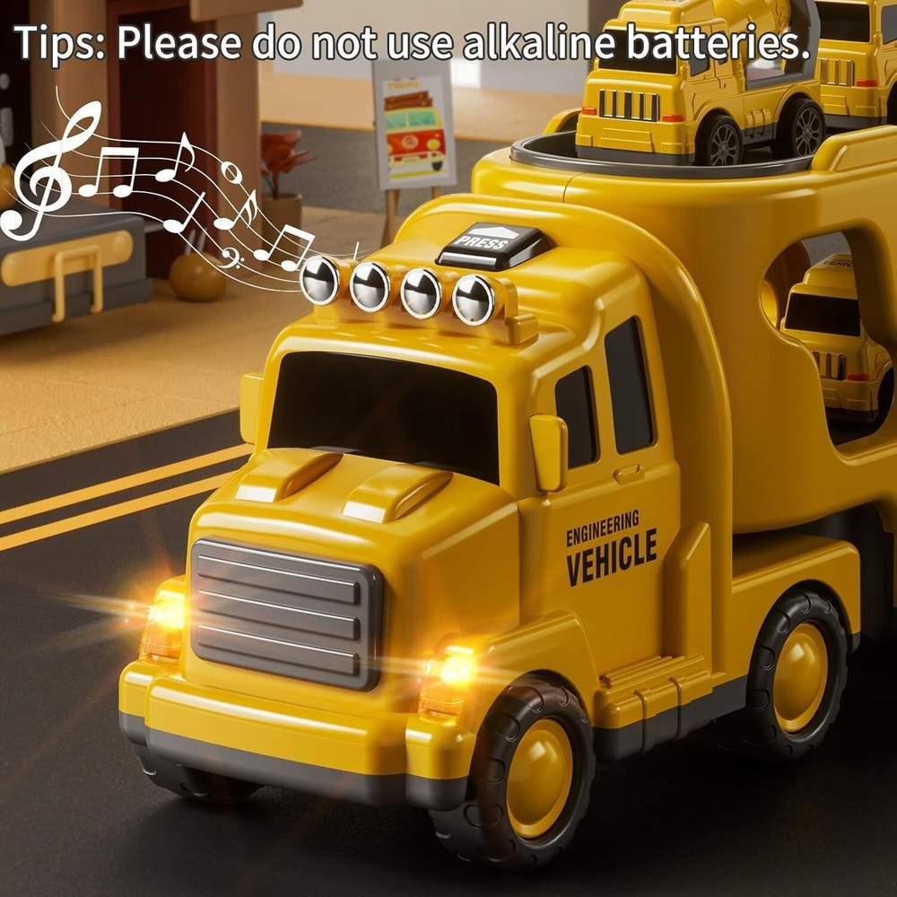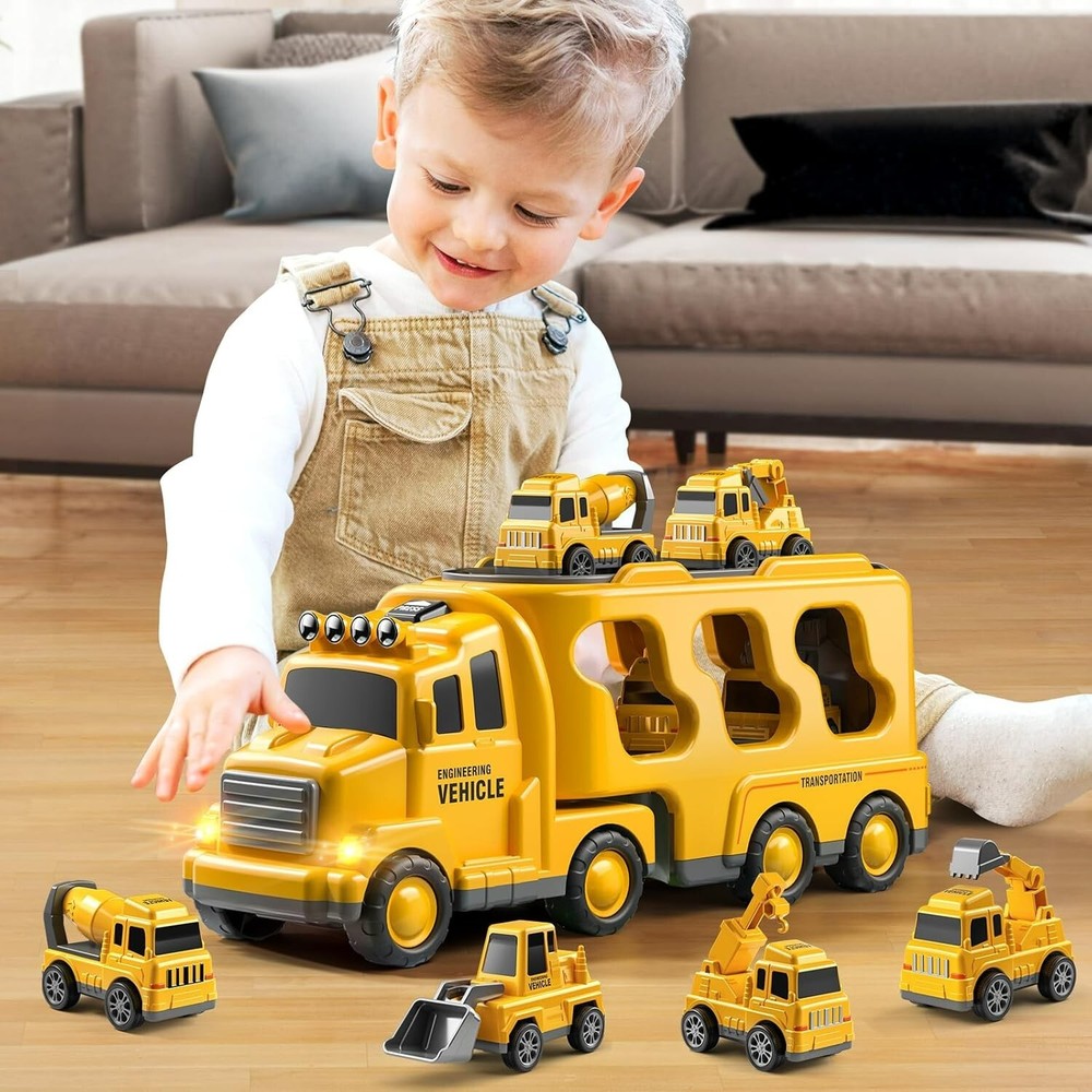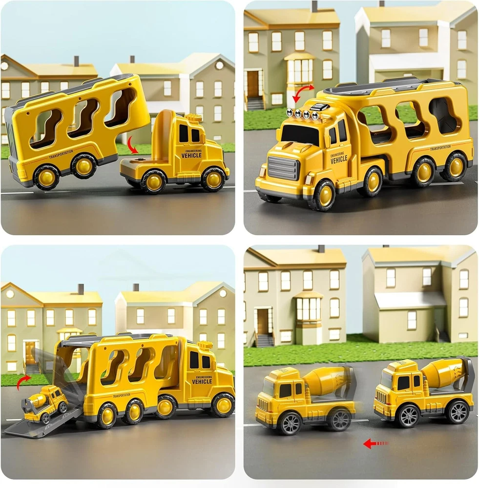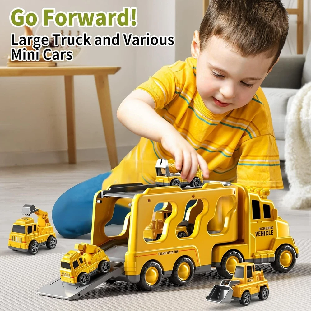 5 in 1 Truck Toys: Kids construction carrier truck toy includes a larger transport truck(12.9*3.9*5.3in) and 4 small cars including crane, mixer, bulldozer and excavator truck. It is recommended and suitable for kids aged 3 and above for much happy time Interesting Ways to Play: Vehicle toys for kids have lighting and sound to attract child's curiosity and interest. The children will be immersed in building base. Toddler boys toys age 3 years old. Toddler girls toys can be played both indoor and outdoor Friction Powered Vehicle: Push the big carrier toy truck forward, it will carry 4 small toy vehicles and set off inertially! And push the small car backward, they can run forward by themselves. Easy to play toys for baby and interact With family members Gifts for Kids: Cars toys for toddlers 3-5 have are round design and smooth edges. Design of big play cars for toddlers 3-8 is suitable for Children’s day, Halloween, Christmas, Thanksgiving, New Year’s Day and other holiday gifts and birthday fun toys More Collection Sets and More Fun: We have construction, fire fighting in 2 topics, which can be played by multiple children for interaction, playing together and sharing fun. This car is a suitable and educational gift toys for 3 4 5 6 7 year old boys