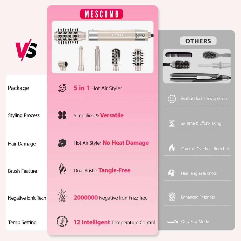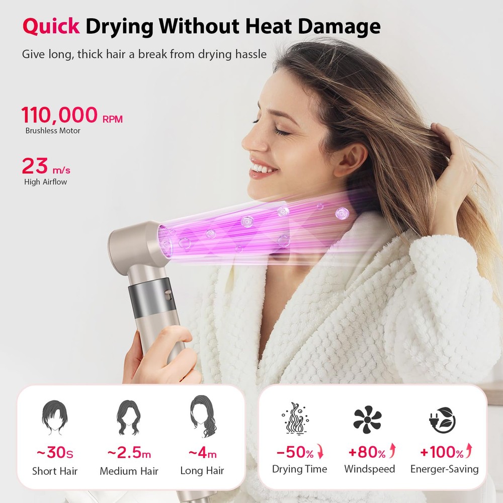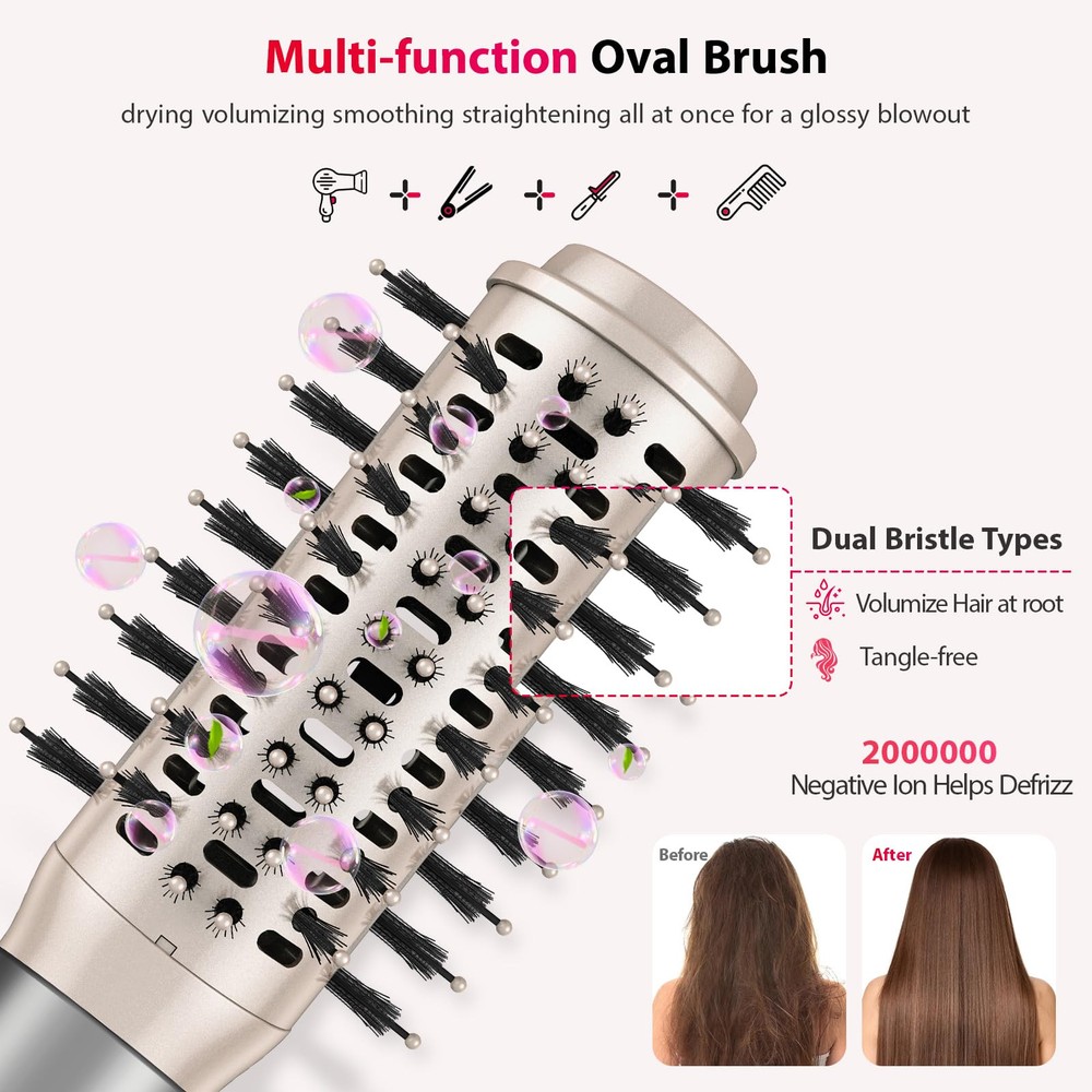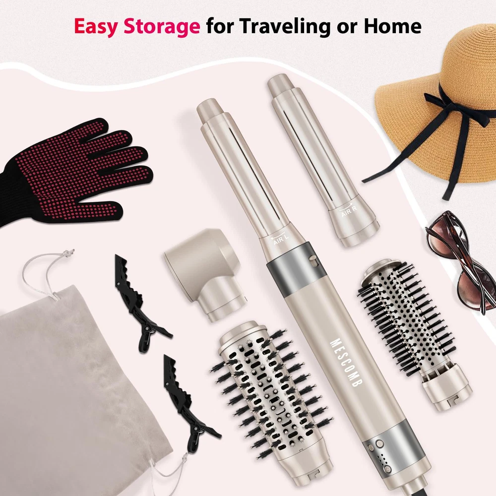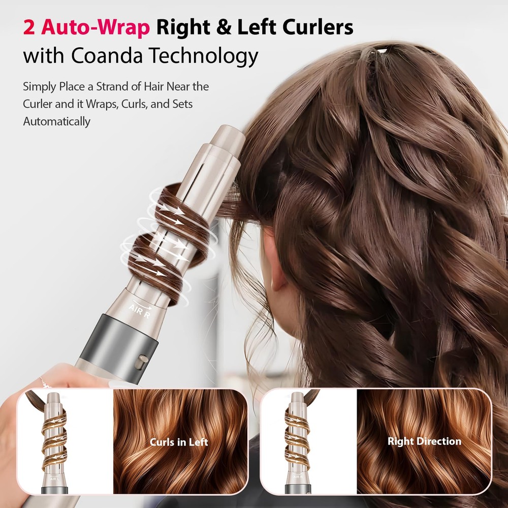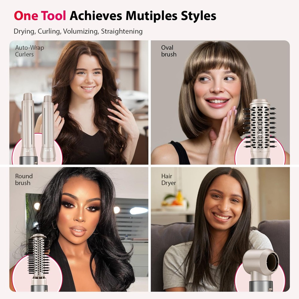 5 in 1 Hair Styler: Transform high-speed hair dryer into a 5 in 1 hot-air wrap multistyler, designed for creating curls, straightening, volumizing or drying your hair, allowing you to explore various hairstyles. You will have options for flex hair stylers instead of having to buy multiple hairstyler appliances. Quick Drying: Despite its compact design, this 5 in 1 hot air styler boasts a powerful motor operating at 110,000 revolutions per minute, drying your hair quickly in just 3-5 minutes, saving you time and effort. 1.25" Air Automatic Wrap Curler: Designed to work seamlessly with our rotating hair dryer brush, this air curler utilizes Coanda Technology to automatically wrap and curl your hair, with two curlers included, you can create stunning curls in different directions, enhancing the versatility of your styling. No Heat Damage & Frizz Reduction: The intelligent heat control function in this air hair wrap styler allows you to adjust between 3 temperature settings and 12 level airflow intensity, preventing heat damage and promoting hair health. The negative ion technology in magic styler leaves your hair smooth, glossy, and frizz-free, reducing tangles and frizz. Suitable for All Hair Types: Whether you have straight, wavy, or curly hair, this 5 in 1 hot air hair wrap styler caters to all hair types, helping you achieve the perfect results. Easy Christmas Gift Choice with Reliable Service: Our air hair wrap styler is designed to impress with its innovative design, nice packaging, and good performance. It's a great xmas gift idea for girlfriends, mothers, or daughters. You don't need to worry about after-sale problems, just contact us on amazon and our team will respond quickly and effectively.
