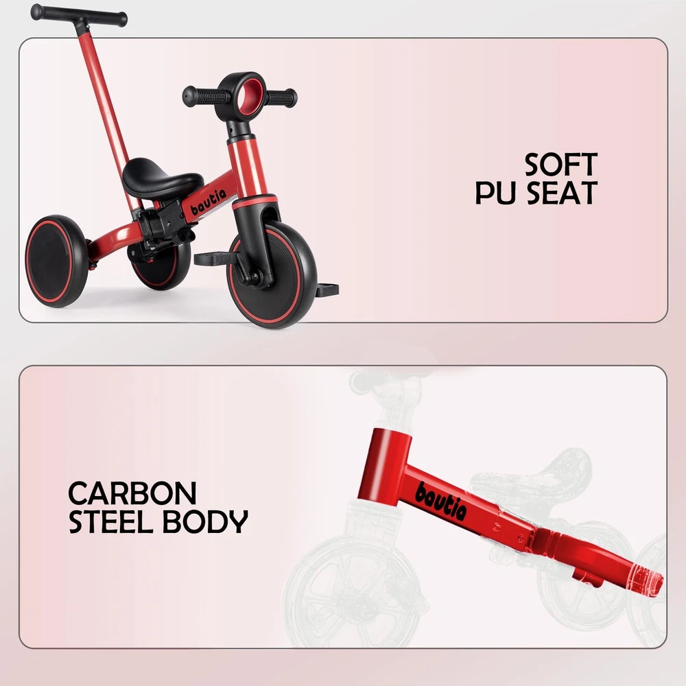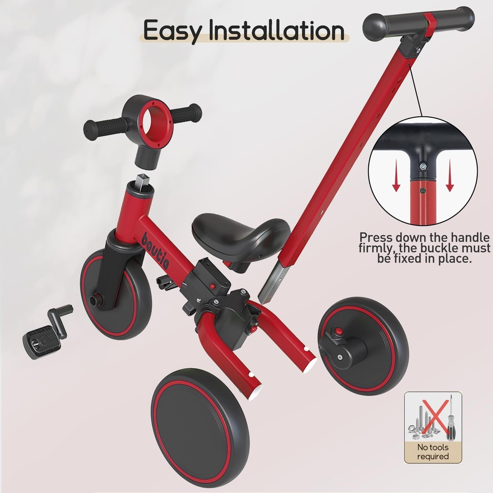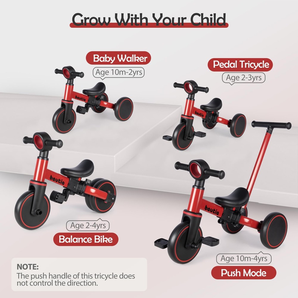 5 in 1 tricycle is the perfect companion for your child's journey from exploring their surroundings to independent walking, effortless sliding, and eventually mastering riding. 5 MODES: tricycle is the perfect companion for your child's journey from exploring their surroundings to independent walking, effortless sliding, and eventually mastering riding. Simply press the button to remove the pedals and switch the back wheels to the desired mode. (Push Tricycle, Push Balance Bike, Tricycle, Balance Bike, Bike) SAFETY FIRST: The toddler balance bike for 1-3 year old toy is made of high quality materials, BPA Free and stained with bright non-toxic paint. The steering control handlebar has a 100° rotation limit to prevent rollover. Thickened handle cover offers a comfortable grip and non-slip pedals avoid injury during rides. EASY TO ASSEMBLE & USE: The toddler bike features a snap-in design for quick and tool-free installation in minutes. The push handle can be adjusted to 4 height levels, allowing parents to maintain a comfortable upright posture while walking their child. RELIABLE DETAILS: Crafted with sturdy carbon steel body, this kids tricycle is built to last. EVA foam wheels are widened and enlarged for greater loads and indoor outdoor use. Silent, non-slip, and shockproof features bring your child a wonderful riding experience. IDEAL GIFT CHOICE: The tricycle helps develop balance, promote coordination, enhance strength while learning how to steer. The maximum load of tricycle is 66lbs. It is definitely the great gift for boys and girls age 10 months to 4 years old!