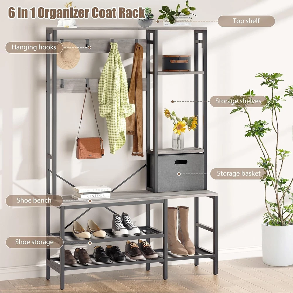 Product Description About this item Large Storage Space: Large shoe storage space. Different heights of Shoe bench are designed for storing high heels, boots and sports shoes. There is also a side rack and top storage rack, providing spacious space to display your home decor, books, potted plants or other decorations. Dimensions: 47.2’’L x 13.7’’W x 70.5’’ H. High-Quality: Made of high quality MDF and heavy-duty powder-coated steel to guarantee durability and stability. Multi-functional hall tree can be mounted on the wall to ensure safety. The "X" crossbar enhances the stability of the whole coat rack. Multifunctional Hall Tree: The hall tree coat rack has 3 shoe storage shelves, 1 fabric storage basket, 1 bench and 10 hooks to give you a space-saving entryway storage solution. You can sit comfortably on the bench while putting on your shoes, and the 3 shelves below can neatly hold shoes out of the way. Modern Design: With industrial design elements and stylish. 8 hooks in 2 rows and the side hooks are perfect for hanging coats, bags, hats, scarves, dog straps, keys, etc. It is perfect for entryways, hallways, foyers, bedrooms, living rooms. Easy to Assemble & After-Sale: This hall tree can be easily assembled with detailed illustrations.If there are any questions about the tracking number or the hall tree, please feel free to contact us, we will respond to you in 24 hours.CONTACT US: Login to your amazon account > choose "Your orders"> find the order ID > click "Contact seller". On Aug 6, 2025 at 19:36:29 PDT, seller added the following information: