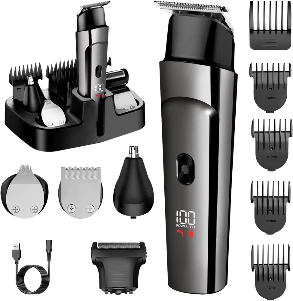 [5 in 1 Beard Grooming Kit] This Trimmer Kit includes 5 trimmer heads for a versatile grooming experience, Multiple functions in one machine that allow you to control the length and style of your beard, body, face, nose, ear, eyebrows, sideburns, neck [Waterproof for Electric Razor] This men's grooming kit is both waterproof and washable, with the detachable blades, help you easy to use and wash it by the included brush. For keeping trimmer good well, you need to put it and all attachments in the base to dry naturally [Safe Shape Blade] The stainless steel moving and standing blades with precision gap, deep close to the skin, more trimming They are also non-corrosive, preventing rust and low friction heat, won't pull hair or burn skin [LED Display and USB Charging] The LED display indicates the battery power and reminds you to charge. This Trimmer features USB charging for easy portability and use on the go. Just charge for 1.5 hours to get 90 minutes of shaving time [Package Included] This Trimmer with 5 different attachment heads, 4 guide combs, storage dock, cleaning brush for beards and mustache trimming, haircuts, touchups, body grooming&detailing Product Description