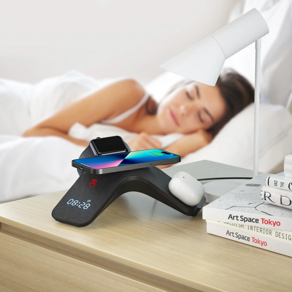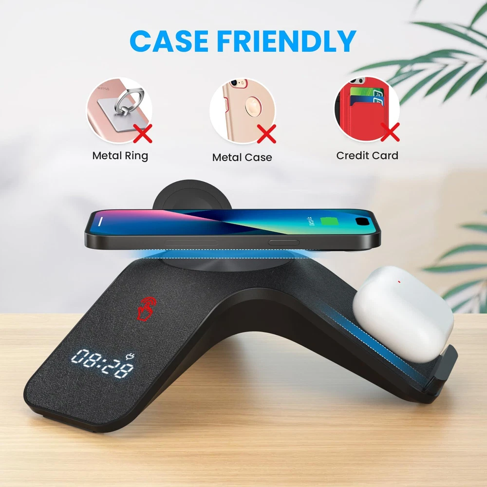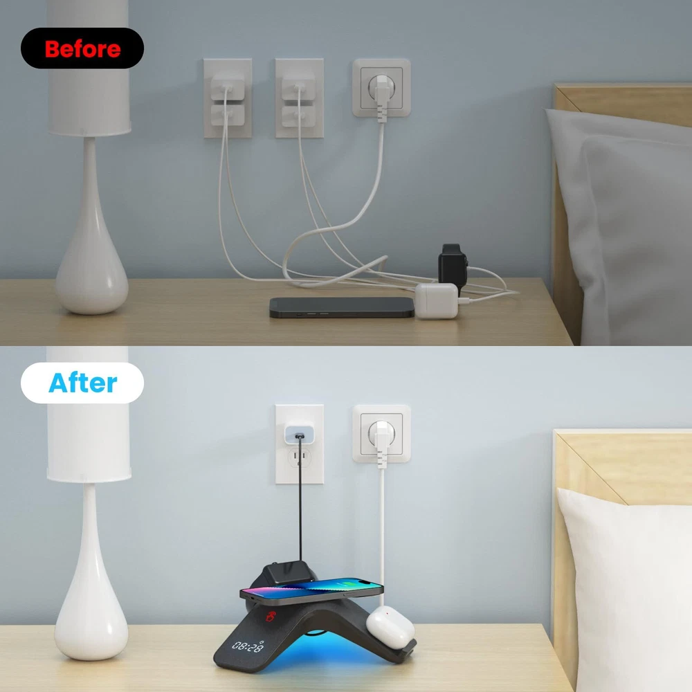 [5-in-1 Wireless Charging Station] 15W 5-in-1 wireless charger can charge multiple electronic devices at the same time. It is very convenient to use and solves the trouble of tangled wires when charging multiple devices. [Multi-functional fast wireless charging] Our wireless charger station can charge your mobile phone, headphones, and Apple Watch at the same time. It comes with a Bluetooth clock and LED light (seven colors, tap to switch) to help you sleep peacefully. [Universal Compatibility] The wireless charging pad has four modes 15W/10W/7.5W/5W, suitable for different mobile phones, compatible with iPhone 15/14/13/12/11/X/XR/XS/8/ SE3/SE2, iPhone Pro 15/14/13/12/11, iPhone Pro Max 15/14/13/12/11/XS, iPhone Plus 15/14; Samsung Galaxy S23 Ultra/S23/S22/S21 and other Qi Compatible devices. [Safe Wireless Charging Stand] Our 5-in-1 wireless charging station has passed FCC certification and has over-temperature, over-current, and short-circuit protection to ensure that the device battery is not damaged by overcharging. The wireless charger has a non-slip pad on the bottom , more stable to use. [Packaging and Service] The package contains an Apple 5-in-1 wireless charger, a 20W adapter, dual Type-C charging cables and wireless charging instructions. We provide 90 days of free replacement service and 24-hour online service. If you encounter any problems during purchase, please feel free to contact the team. [5-in-1 Wireless Charging Station] This multifunctional wireless charger can charge your iPhone 15/15 Pro/14/13/12/Apple Watch/AirPods/Samsung Galaxy S23 Ultra/S23/S22/S21 and other QI protocol compatible devices. 【15W Fast Wireless Charging Station】This wireless charger has 15W fast charging function, which ensures fast and efficient power supply to your iPhone, saving you time and trouble. 【7-Color LED Light & Bluetooth Clock】The wireless charger station has built-in LED lights with 7 colors that can be switched according to your mood or create a soothing atmosphere. After connecting your phone to the wireless charger via Bluetooth, you can calibrate the time. [Note] This product does not have an alarm clock function. 【15W Wireless Charger Compatibility】 5-in-1 wireless charger has four powers of 15W/10W/7.5/5W, suitable for iPhone15/14/13/12/11/X/XR/XS /8/SE3/SE2, iPhone Pro 15/14/13/12/11, iPhone Pro Max 15/14/13/12/11/XS, iPhone Plus 15/14; Samsung Galaxy S23 Ultra/S23/S22/S21 and other Qi protocol compatible devices . 【Safe Wireless Charging Stand】 Our 5-in-1 wireless charging station has passed FCC certification and has over-temperature, over-current, and short-circuit protection to ensure that the device battery is not damaged by overcharging. The wireless charger has a non-slip pad on the bottom , more stable to use. 【Packaging and Service】The package contains an Apple 5-in-1 wireless charger, a 20W adapter, dual Type-C charging cables and wireless charging instructions. We provide 90 days of free replacement service and 24-hour online service. If you encounter any problems during purchase, please feel free to contact the team.