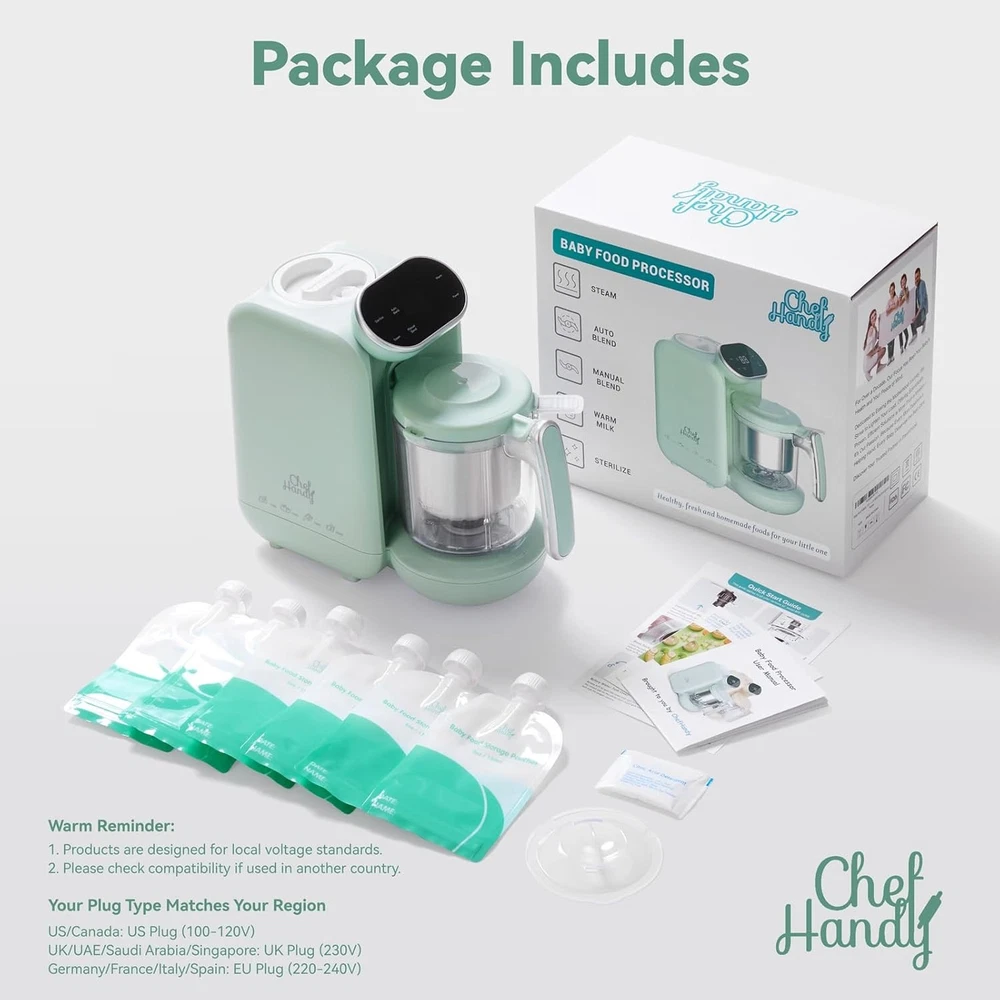 About this item 【Versatile Baby Food Maker with Auto & Manual Blending】Effortlessly prepare homemade baby food with this baby food steamer and blender, featuring automatic and manual blending modes for customized textures. The detachable stainless steel blade ensures smooth results and easy cleaning. 【Safe & Durable Design with Stainless Steel Components】Built with a stainless steel steam basket and a food-grade stainless steel water tank, this baby food maker and steamer ensures even heating while preserving nutrients. Designed for long-term performance and safety. 【5-in-1 Functionality for Complete Baby Meal Preparation】This multifunctional baby food processor combines steaming, blending, steri-lizing, and bottle warming, making it an all-in-one solution for busy parents. The BPA-fre-e 300ML blending cup ensures safe and healthy meal preparation. 【Smart Safety Alerts & User-Friendly Operation】Equipped with an E1 safety warning and low water reminder, this baby food steamer and blender ensures a safe and seamless experience. The intuitive controls make it easy to prepare fresh, nutritious meals for your little one. 【Designed for Convenience with Extra Accessories】This baby food maker with steam and blend includes six baby food pouches and replacement accessories for easy storage and feeding. Built to Last with High-Quality Materials for Long-Term Use. On Nov 11, 2025 at 21:52:18 PST, seller added the following information:
