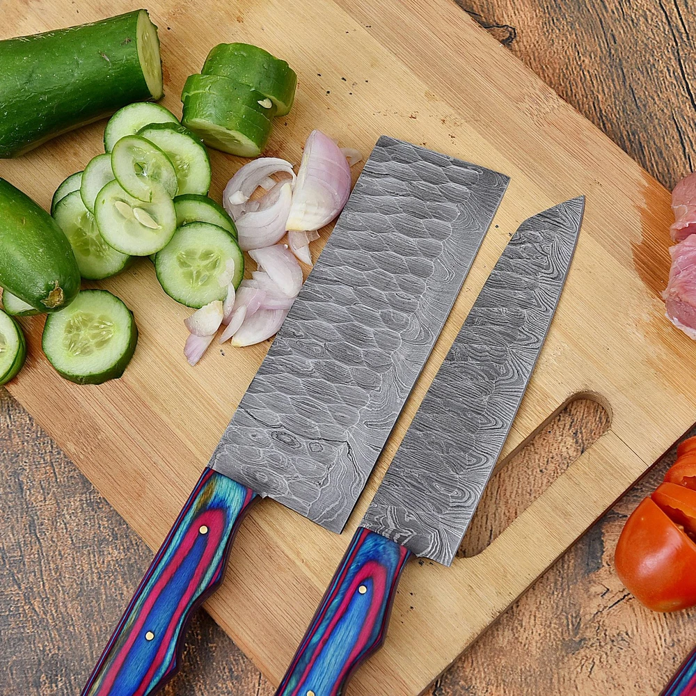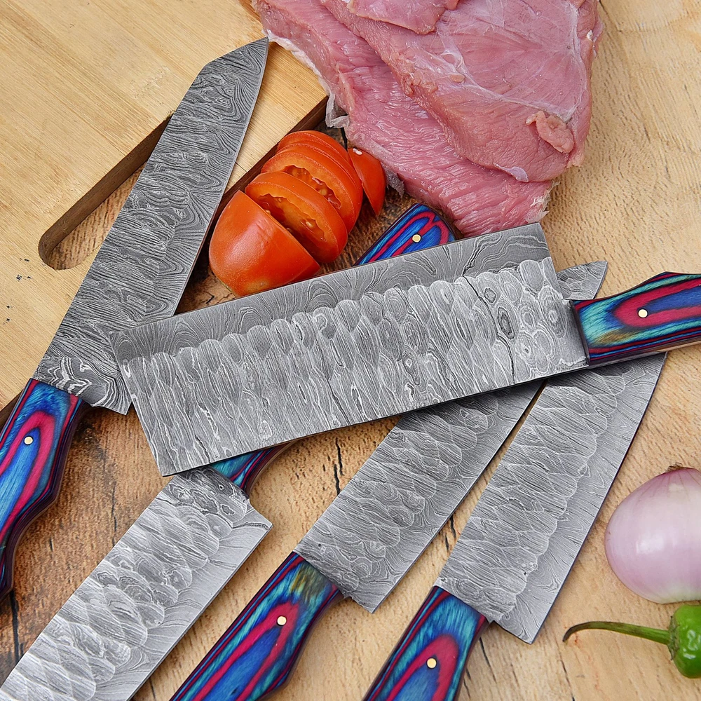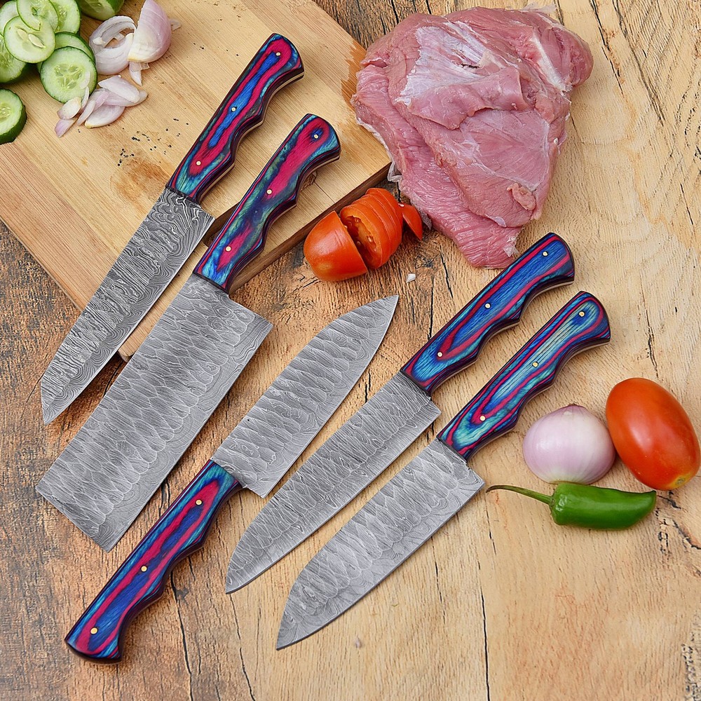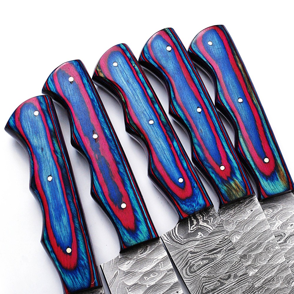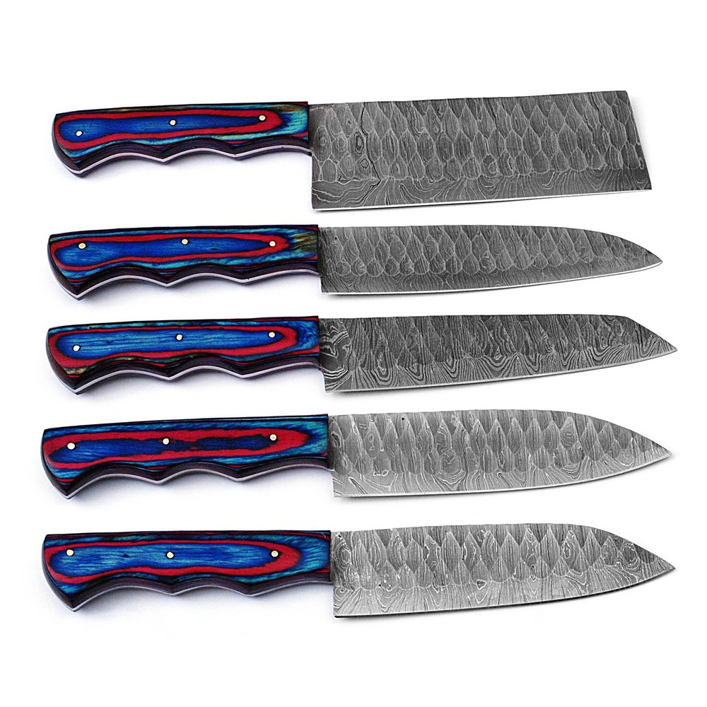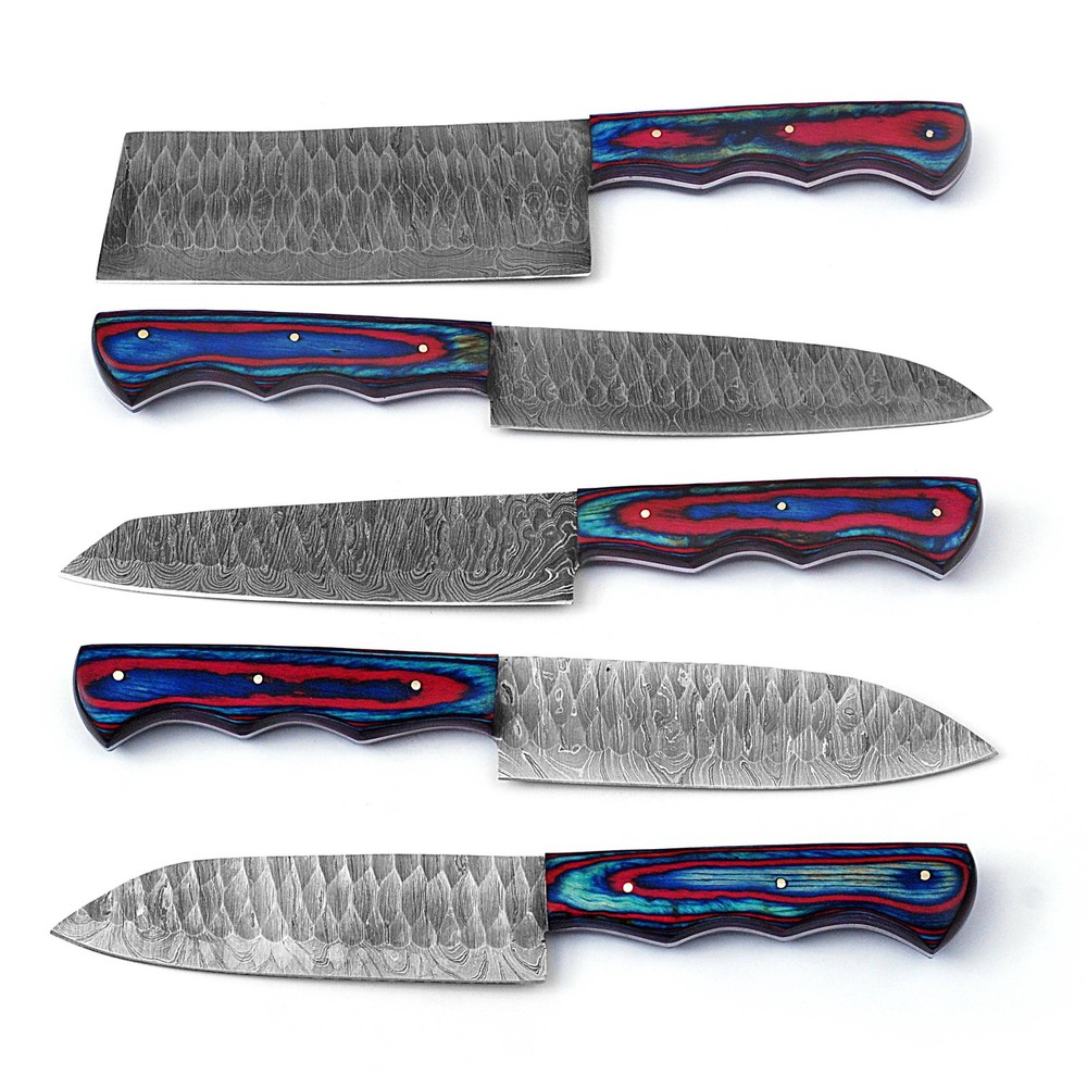 Brand: Armory Replicas Set Includes: 5 knives Handle Material: Blue and Red "Dollar" wood patterns. Personalize: No Color: Multicolor Type: Chef's Knife Material: High Carbon Premium Damascus Steel Features: Easy Clean Number of Items in Set: 5 Food Compatibility: Universal