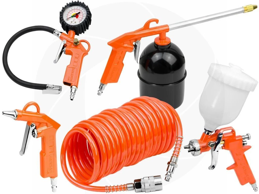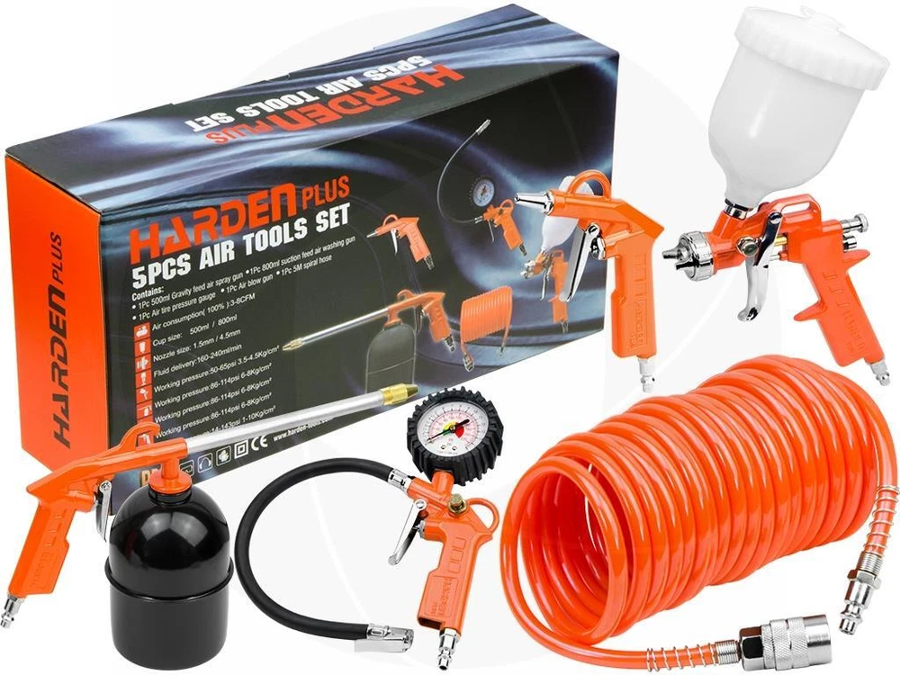 This Harden five pieces air tool set consists of the most commonly used air tools. The set contains a spray gun, tire inflator with pressure gauge, air blow gun, air engine cleaning gun and a five meters PU hose. These tools are suitable for various brands of compressors that are equipped with 1/4 inch American style connector. Features: Suitable for a wide variety of jobs around the house Spray gun is for easy and smooth lacquering and applying primer application Air blow gun is suitable for spraying various liquids and cleaners, including degreasers Tire inflator with pressure gauge for easy and quick inflation of tires 0-225PSI Air nozzle for cleaning dust from the workplace, or blowing, drying water for fast drying Spiral hose increases the working range, can be used with other types of air tools Specifications: Brand: Harden Model: 681901 Air inlet size: 1/4in NPT 1/4in threaded connectors Air spray gun: 500ml, Gravity feed Air blow gun: nozzle length 20mm Air washing gun: 800ml, suction feed Air tire inflating gun: 0-16 bar and 0-225 psi Spiral air hose length: 16.4ft or 5 meters Weight: 4lbs or 1.83kg Package includes: Air spray gun Air blow gun Air washing gun Air tire inflating gun Spiral air hose Retail box Get images that make Supersized seem small. THE simple solution for eBay sellers. Track Page Views With Auctiva's Counter