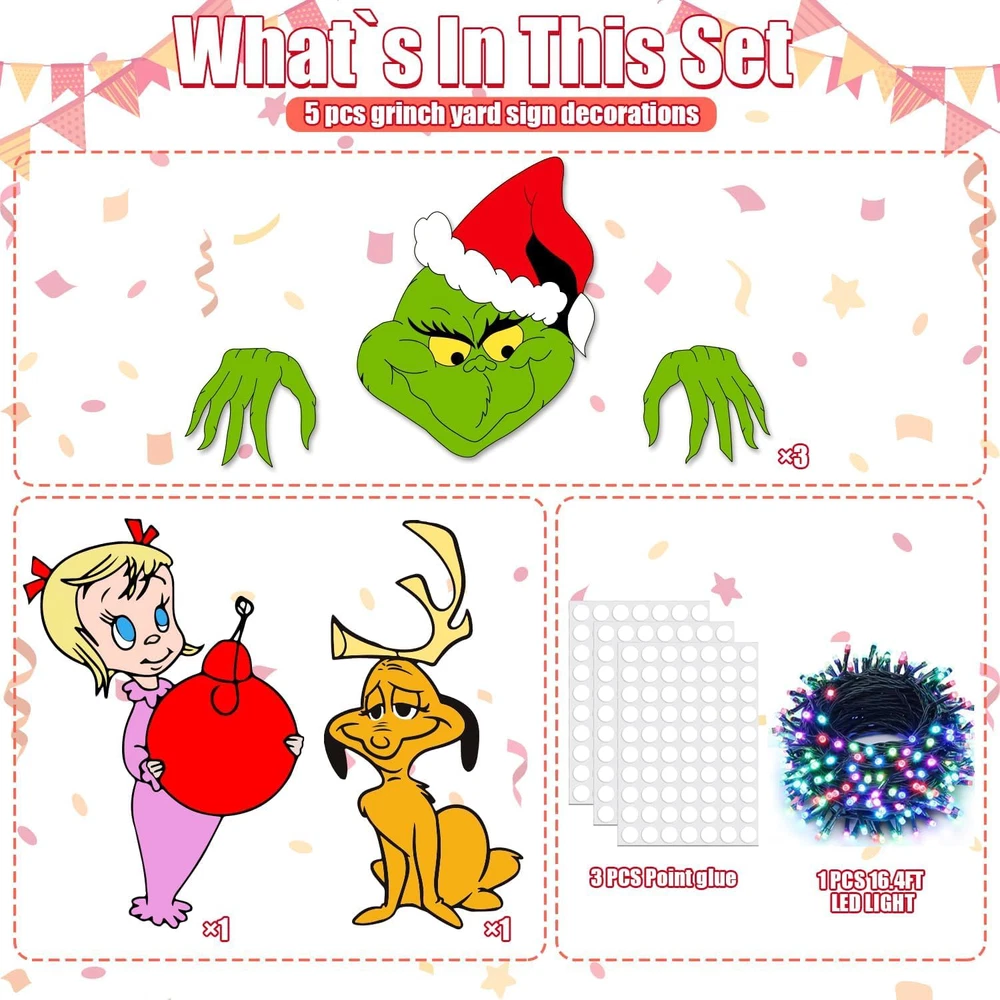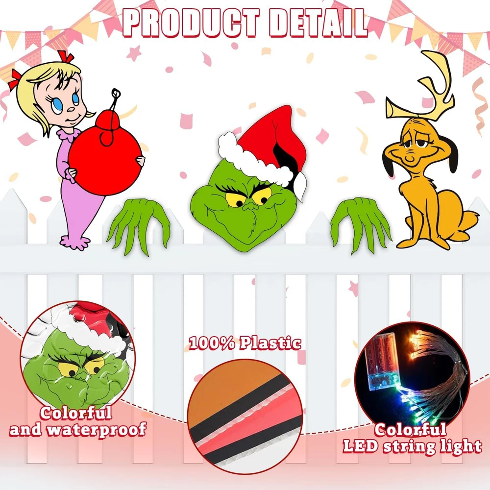 【valuable pack】christmas decorations with lights: you will receive 5pcs christmas decorations fence peekers with led lights, including a length of 2pc 16.5 feet led lights. soft warm led lights add a fun and festive feeling, and bring a strong warm festive atmosphere to your home, perfect for outdoor or indoor christmas decorations. 【material】: our christmas decorations outdoor fence yard signs are printed on corrugated plastic, not easily damaged or faded. the string lights are powered by 2 x aa batteries(not included), no plug needed, low voltage, and safe to touch. these outside signs with lights will stand up to most weather conditions, are durable for outdoor use, and can last the whole holiday season. please prevent the battery box from raining. 【wide application】: these christmas yard signs with string lights are perfect for christmas decoration outdoors and are ideal decor for fence, yard, garden, wall, fireplace, window, patio, porch, etc, it is also a perfect christmas tree topper choice. besides, it can be given as a nice christmas gift for your family and neighbors. 【easy to assemble】: Each Christmas sign has two plastic stakes and foam glue, you can use the foam glue to stick on the back of the signs and paste it where you want, or insert the plastic stakes into the hole of the sign. The Christmas string lights can be bent to any shape you want. You can insert the Christmas sign anywhere you want, then put the string on the signs. 【service】: we not only achieve the perfect christmas decorations outdoor fence peeker with led lights products, but we also will not slack in after-sales service, we will provide you with the most complete after-sales service if you are not satisfied with the product, and we will try our best to solve the problem.