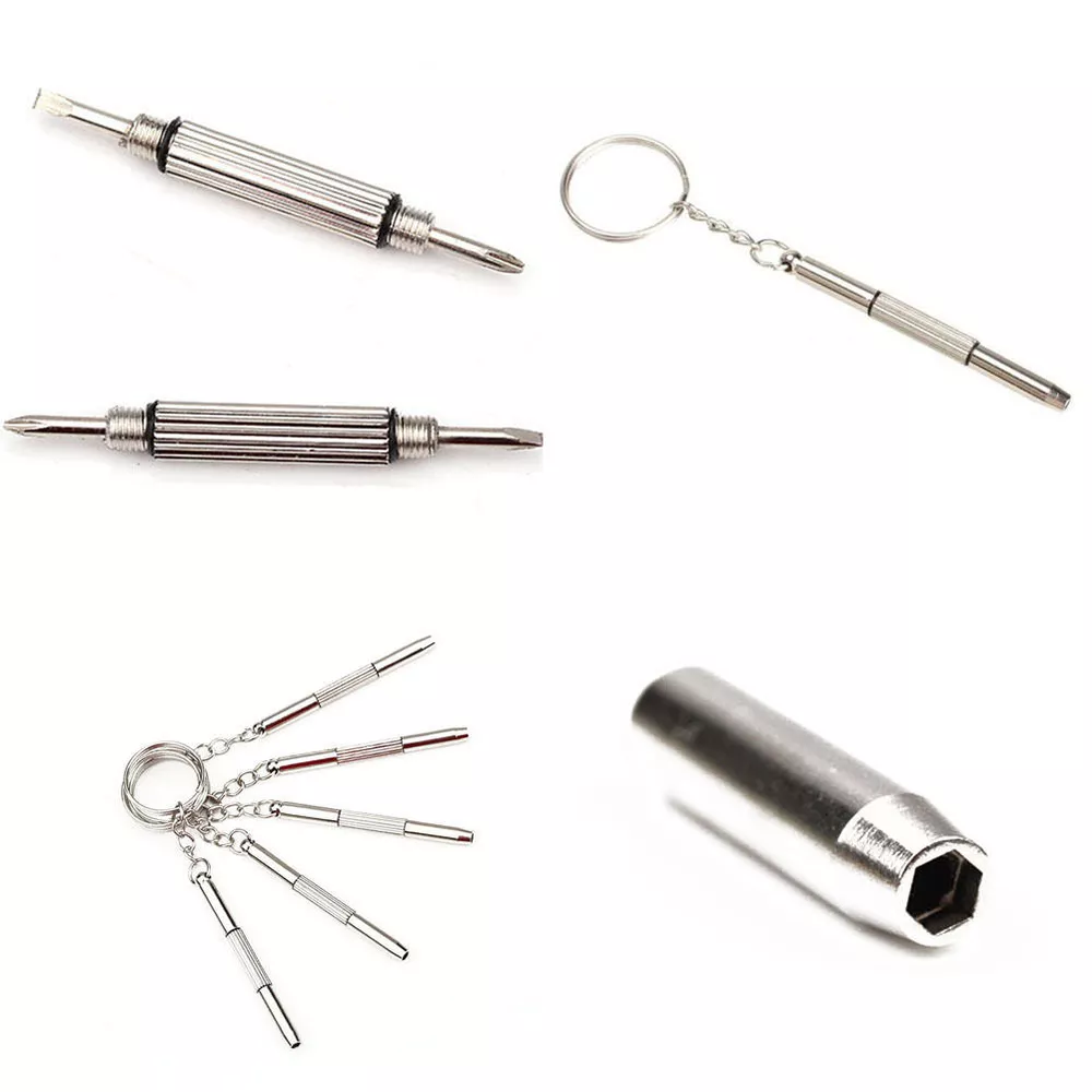 100% Brand new and high quality This multifunctional screwdriver is applied for repairing glasses and watch widely. The repair tool include: Flat head screwdriver / Phillips screwdriver / Star nut driver Can be used to repair or screw up screws for eyeglasses, sunglasses, watches, cellphones and other precise devices With a keychain, portable and easy to hang Material: Aluminum steel Total length (without Keychain): Approx. 6cm Keychain diameter: Approx. 2.3cm Package includes: 5 x Eyeglass Screwdriver Repair Kit Preview: