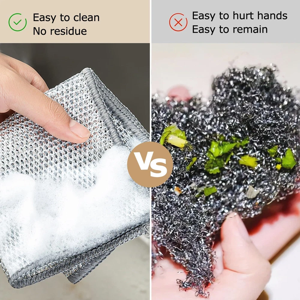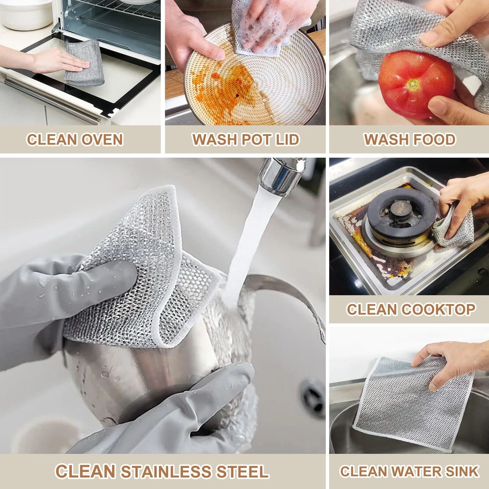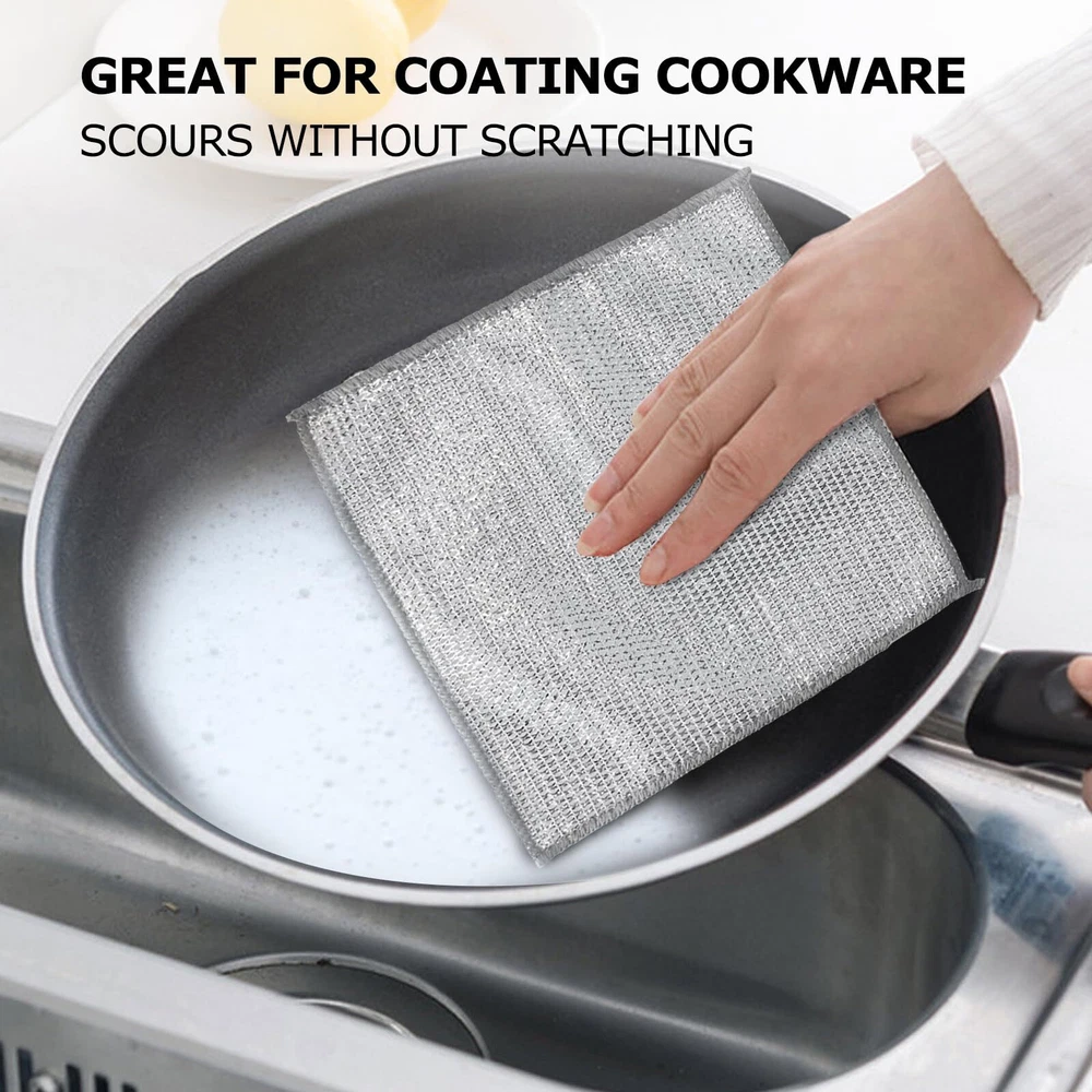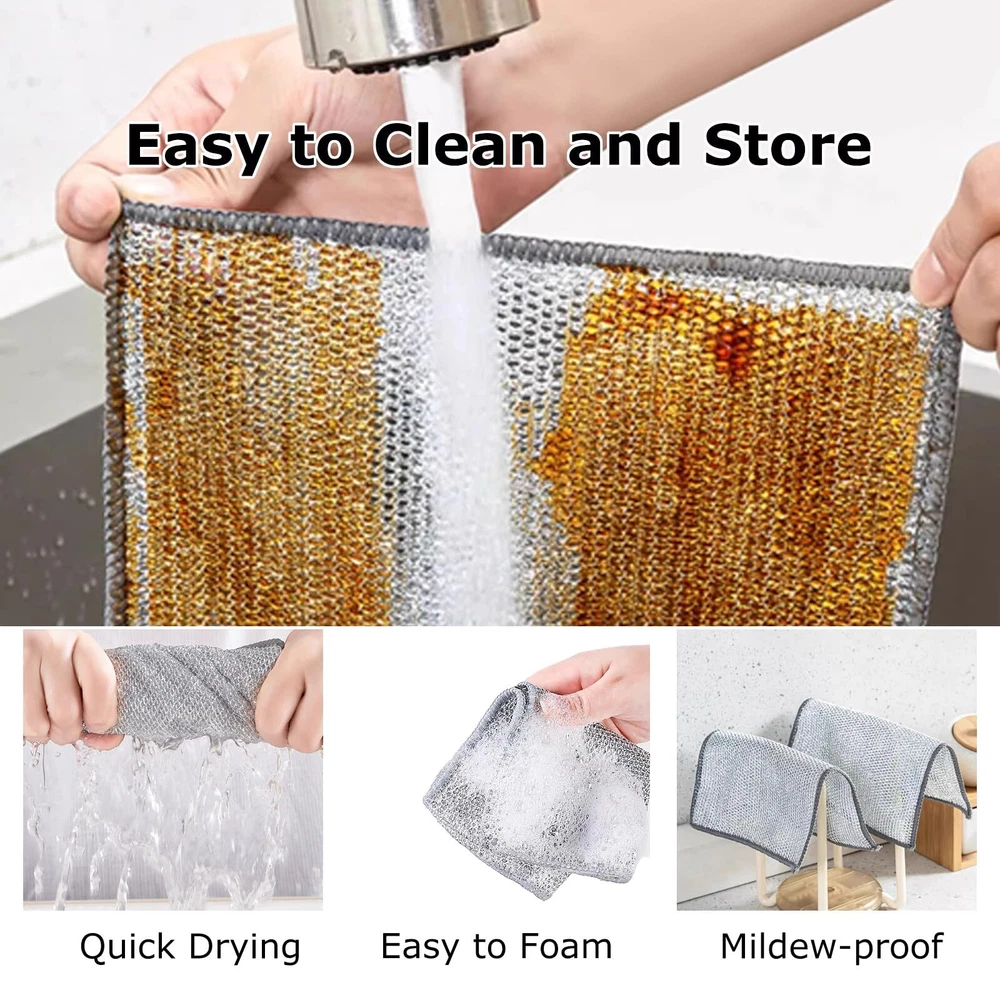Wide range of uses: Non-scratch wire cleaning cloth for wet or dry, can be used for utensils of different materials, such as pots, bowls, plates, countertops, sinks, stoves, etc. that need to be cleaned High-quality material: This steel wire rag is made of high-quality fabric and silver mesh, with a diamond-shaped double-layered surface, more bubbles, enhanced cleaning effect, wear-resistant, will not tear, and can be reused Easy to use: Size 7.87*7.87 inches, foldable and unfoldable for use, not easy to stick to grease, will not accumulate dirt, and is very easy to clean and dry Easy care: After cleaning work, use some mild detergent, rinse and dry. Convenient for next time use After cleani good helper in the kitchen: Our products include 5 pcs or 10 pcs of multifunctional wire dishcloths, a good helper in your kitchen. If there are any problems with the product, please feel free to contact me and we will provide the best solution work, use some mild detergent, rinse and dry,onvenient for next time use