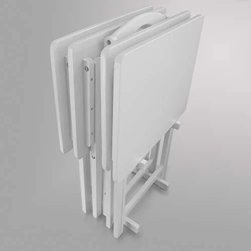 With this 5-piece folding table set you can have a table anywhere in your home. Made of 100-percent solid wood, this set includes 4 folding tables and a convenient storage stand, which is great for transportation. Perfect for TV meals or family meals that make their way out of the kitchen or dining room. 1" Thick solid American walnut Top for quality you can see and feel..Assembly Required.Material:Pine.Item Dimensions:19" L x 14.7" W x 25.5" H Matching solid wood storage stand for organization. Tray stand Dimensions: 12. 25"W x 11. 25"D x 30. 25"H Great for living room Get together when you Need that extra table space. Solid wood Construction for increased durability and longevity. Light and easy assembly. included components: Hardware Included Not Made In China