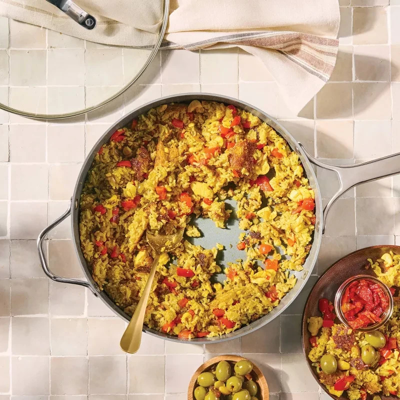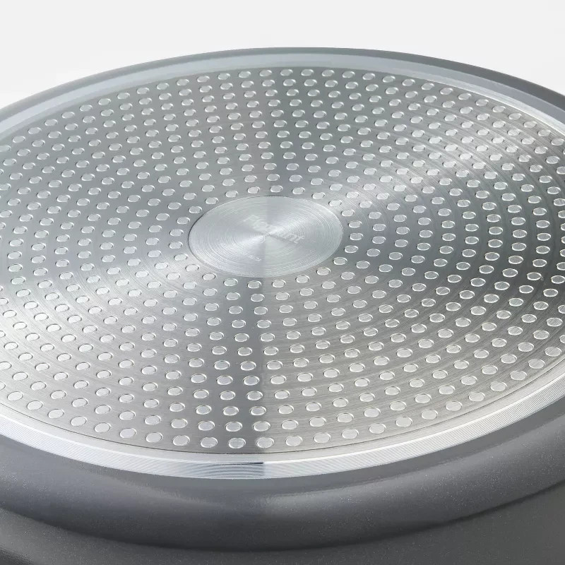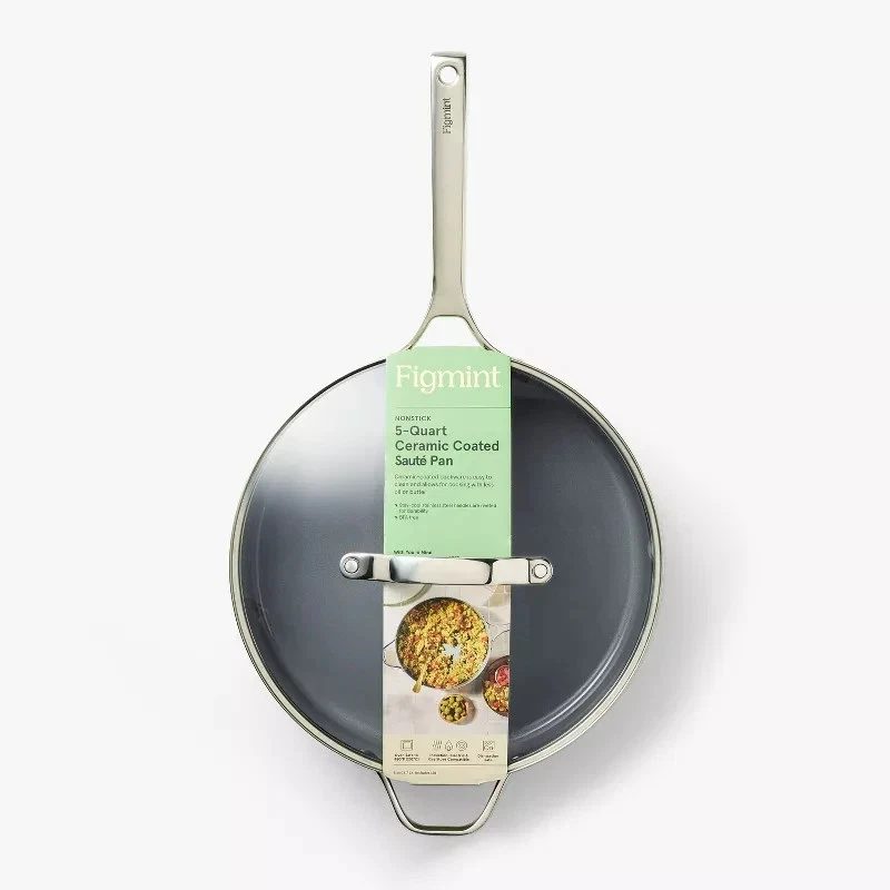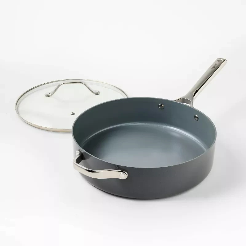 Highlights 5qt nonstick ceramic-coated sauté pan Aluminum construction is ideal for even heat distribution Smooth, nonstick surface with no PTFE or PFOA To protect nonstick cooking surface, use only with silicone, nylon or wood cooking utensils Induction, gas and electric stove compatible Oven safe up to 450 degrees F Dishwasher safe but hand washing recommended for longer product life