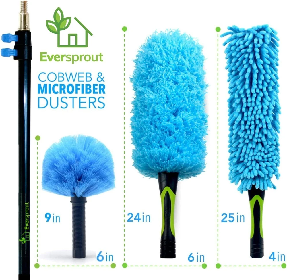 DUSTER 3-PACK COMBO, HAND-PACKAGED, NO SMASHED BRISTLES, WASHABLE FOR REUSE – Includes: Cobweb Duster (Medium-Stiff Bristles), Microfiber Feather Duster (24”), Flexible Ceiling Fan Duster (25”). Dusters are Hand-Packaged in San Luis Obispo, CA to ensure dusters are big and full, not smashed. Cob Web Duster and Feather Duster can be hand-washed in a sink with cool to warm water (let air dry). The Ceiling Fan Duster Sleeve is removable for the washing machine (cool to warm water and let air dry). SAVE TIME, SKIP THE LADDER - REACH UP TO 20+ FEET WHEN STANDING – Included is an Extension Pole (4.5 to 12 ft), Cobweb Duster, Feather Duster, and Ceiling Fan Duster. All dusters twist onto the 3-Stage Aluminum Extension Pole & extends to any custom length from 5-to-14 Feet. Reach up to 20+ feet when standing. ARRIVES FLAT, BENDABLE TO ANY SHAPE, ELECTROSTATIC MICROFIBER ATTRACTS DUST – Both the Feather Duster and Ceiling Fan Duster arrive flat, and can be bent to any shape so you can clean and conquer those hard to reach areas! Each Microfiber has a slight positive charge and is so tiny it’s 100 times finer than a human hair – this enables the Microfiber Ceiling Fan Duster and Microfiber Feather Duster to attract, grab, and trap dust. Perfect for cleaning blinds, high ceiling fans, cob webs, & more! THE ULTIMATE EXTENSION POLE ON THE MARKET TODAY – Lightweight Aluminum pole weighs only 1.5 pounds and is very sturdy. Non-Slip Foam Hand Grips for comfort and reliable grip in wet conditions. Frustration Free Flip-Tab Locking Mechanism means NO SECTIONS GETTING STUCK like traditional twist-lock poles, AND allows any custom length between 4.5 and 12 ft. 3/4” Acme Thread Pole Tip is made of metal alloy for durability Color Blue, Black Recommended Uses For Product Blind, Fan, Light Fixture, Furniture, Picture Frame Special Feature Lightweight Handle Material Aluminum Head Material Polyester Item Weight 1.5 Pounds Product Care Instructions Machine Wash Item Firmness Description Soft