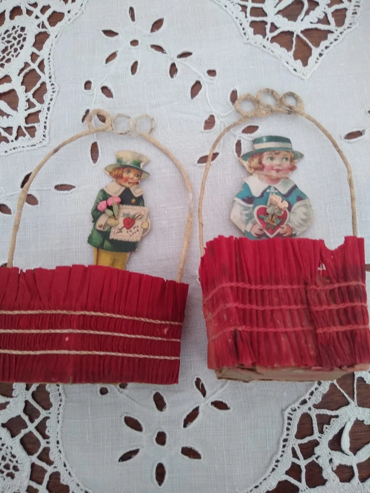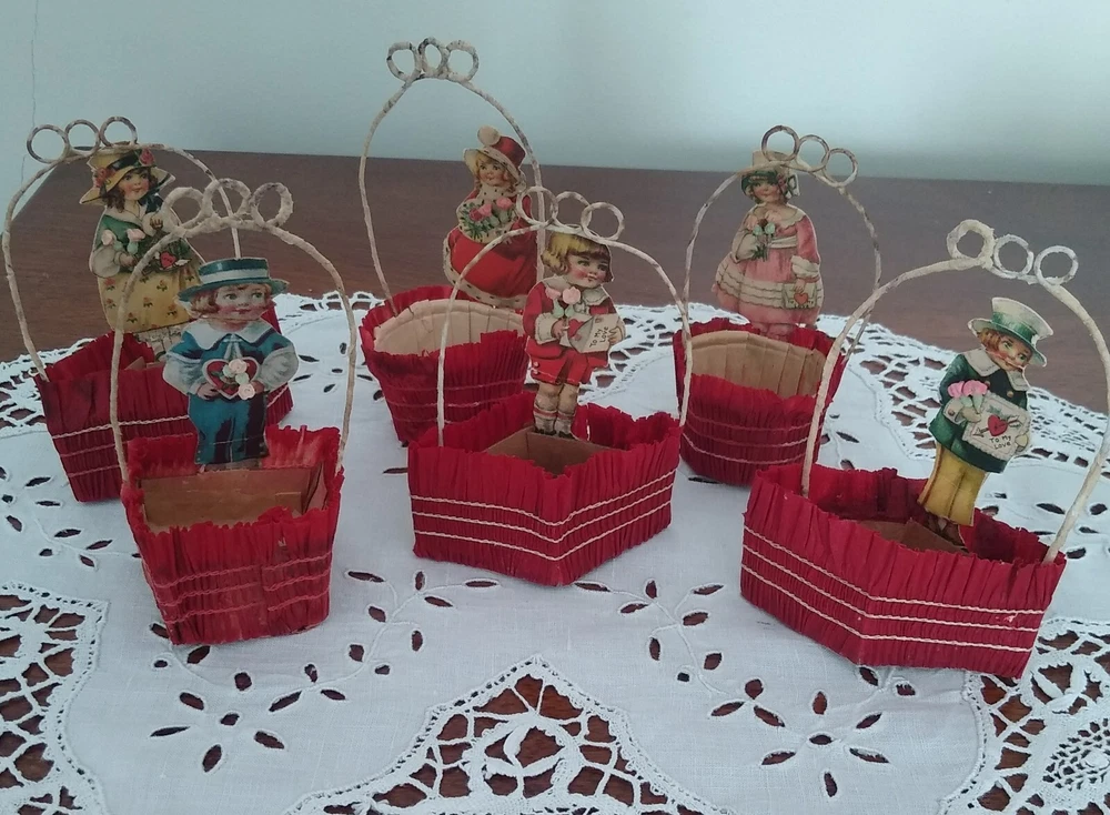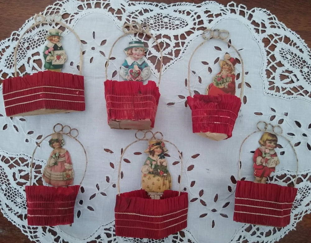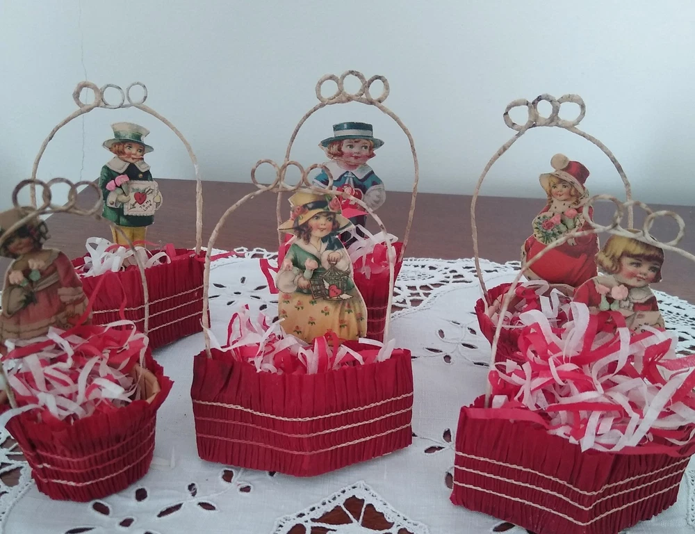 This listing is for 6 antique Valentine's Day party favors. They are cups wrapped in crepe paper with wire handles meant to hold candy or nuts. Each one has a lithographed child &, if you look closely, you can see that each one is holding little composition flowers. The paper cups show wear & fading, & have been reinforced as you can see from the photos. I filled them with tissue for a couple of the photos. There are different shapes, round, square, & diamond shape. They stand about 4 1/2" tall. Please feel free to ask any questions you may have. Thank you very much for looking!