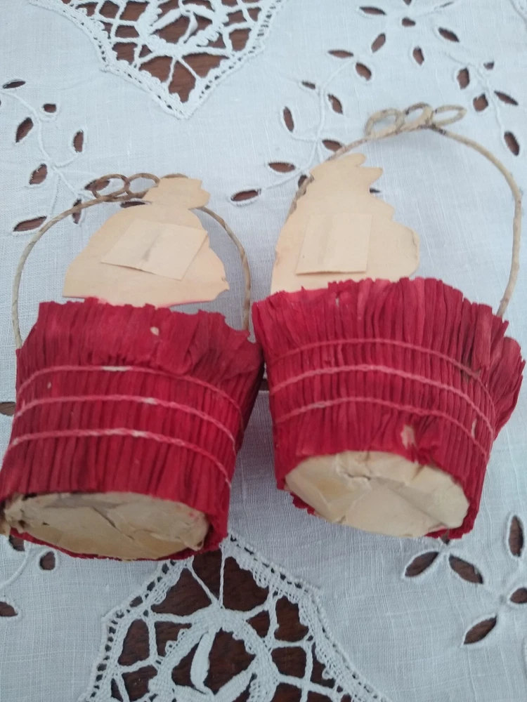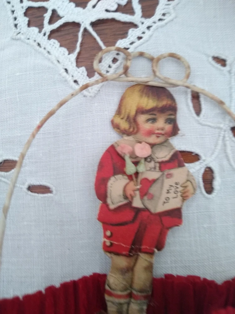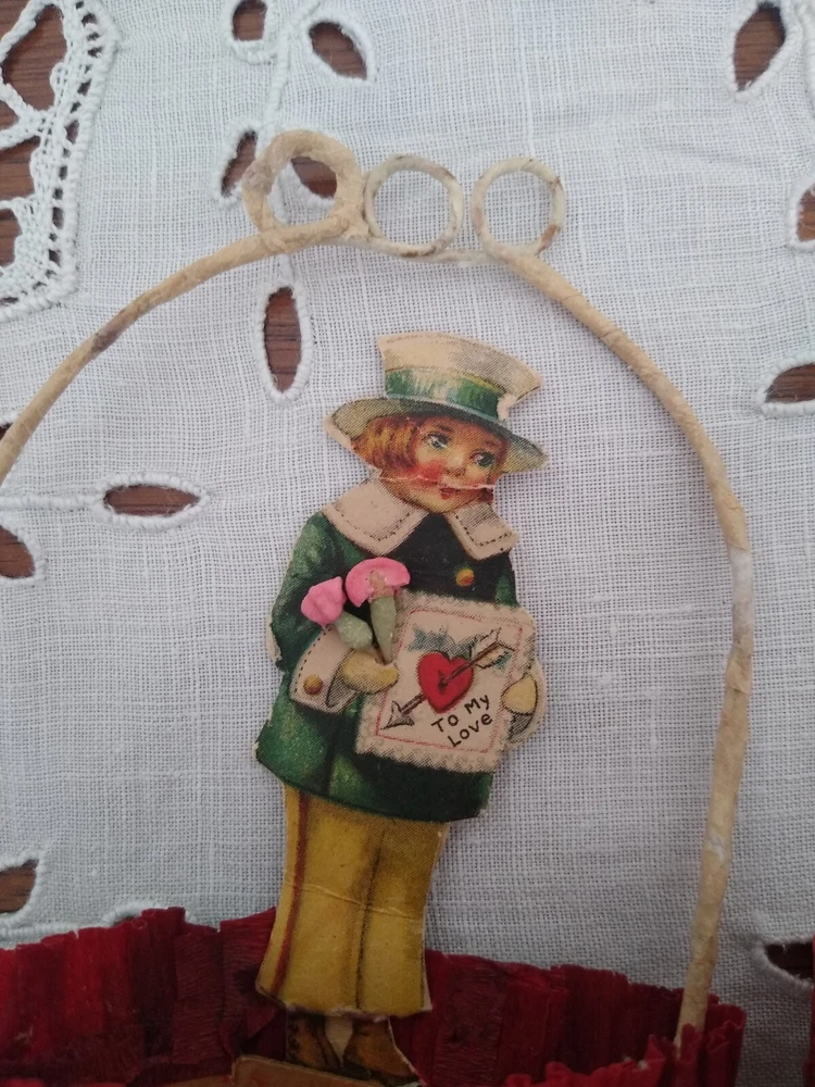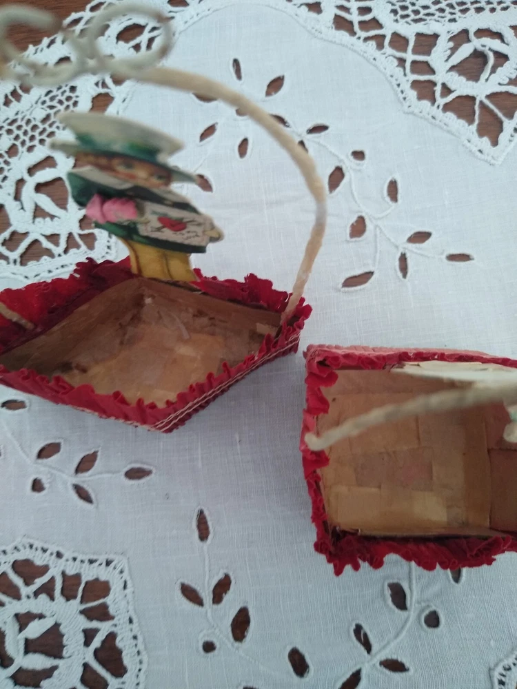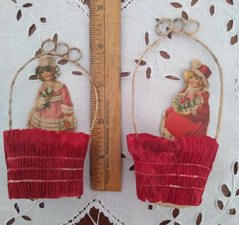 This listing is for 6 antique Valentine's Day party favors. They are cups wrapped in crepe paper with wire handles meant to hold candy or nuts. Each one has a lithographed child &, if you look closely, you can see that each one is holding little composition flowers. The paper cups show wear & fading, & have been reinforced as you can see from the photos. I filled them with tissue for a couple of the photos. There are different shapes, round, square, & diamond shape. They stand about 4 1/2" tall. Please feel free to ask any questions you may have. Thank you very much for looking!